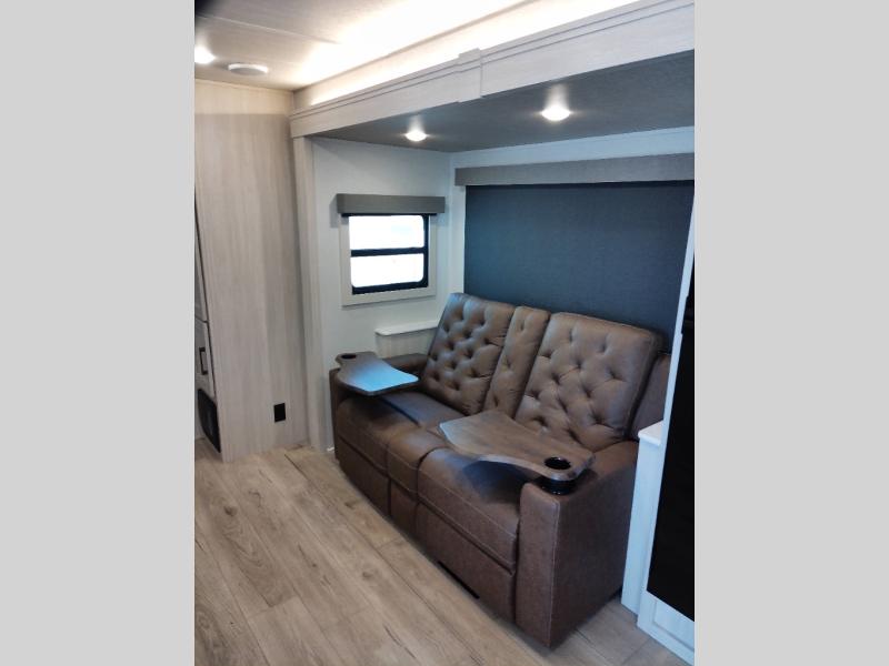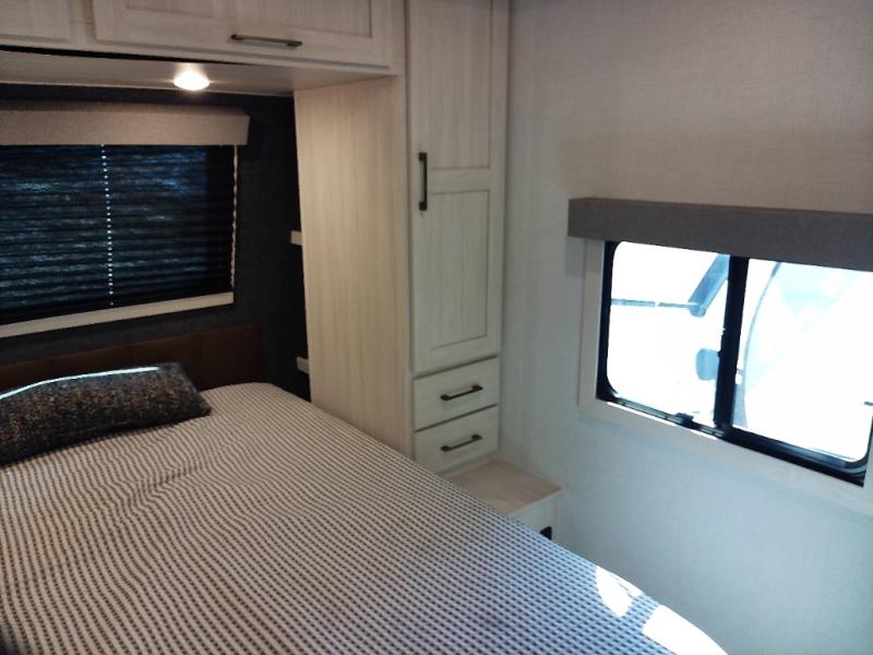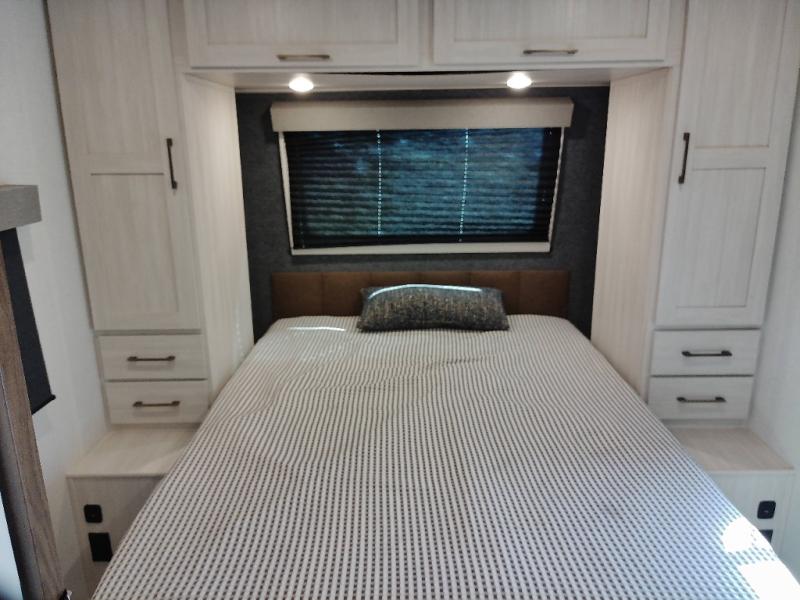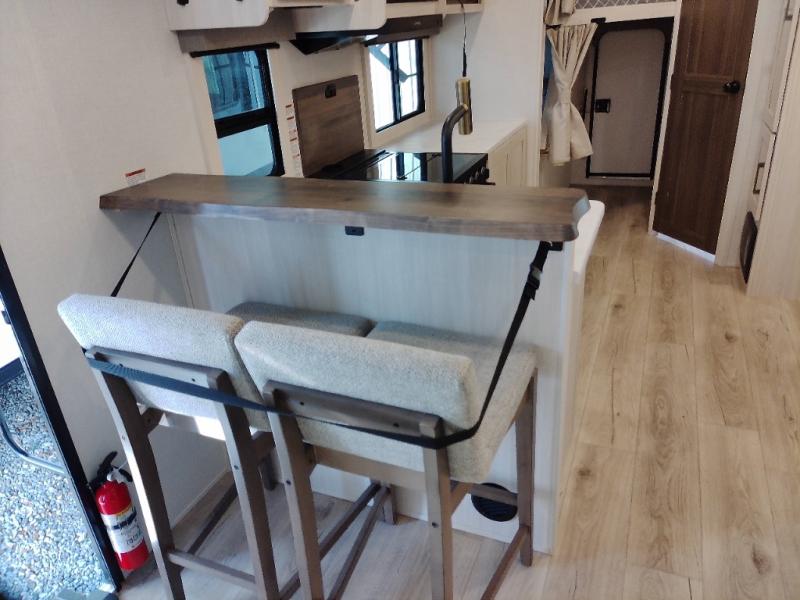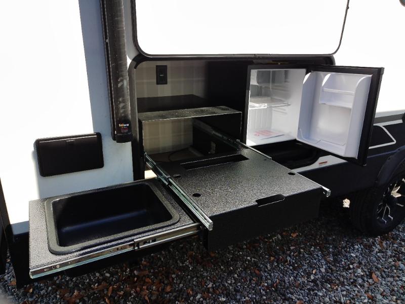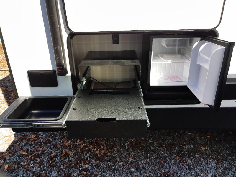 Every trip to the campground will be spent in comfort with this single slide out travel trailer. Once you arrive at the site, remove the kayaks or bikes from the rear storage door, start lunch on the outside kitchen, and put out the 15' power awning with LED lights. The interior includes a booth dinette slide with storage, a bar top with stools, plus an HD TV for movie nights. After a day of fun, head to the front private bedroom for a great night's rest on the queen bed, and you can store your belongings in the dual bedroom wardrobes!