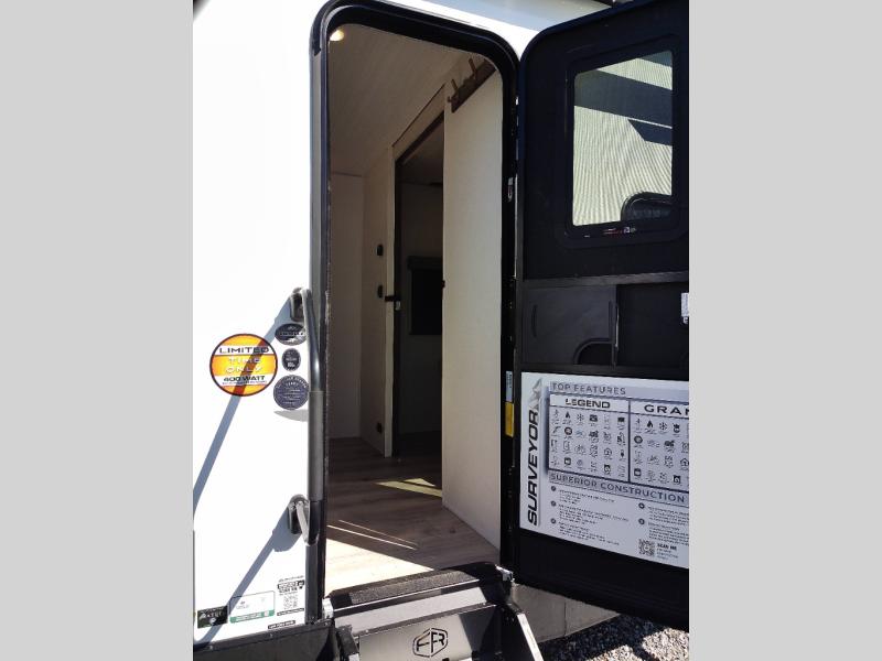 With any Surveyor Legend travel trailer by Forest River you will enjoy quality craftsmanship, convenient amenities, and at-home comforts. The Azdel composite walls provide a longer-lasting trailer, and the power tongue jack with a hitch light will get you back on the road in no-time. There are also Goodyear tires and a tire pressure monitoring system for hassle-free towing. Each model includes the Surveyor Legend Package that comes standard with oversized dinette storage access doors, front slam latch baggage doors, plus an automotive style tinted front windshield. You'll appreciate camping with a tankless water heater for endless hot showers, a 2" accessory hitch to bring bikes along, plus carpet-free interiors and a central vacuum system for easy clean up.