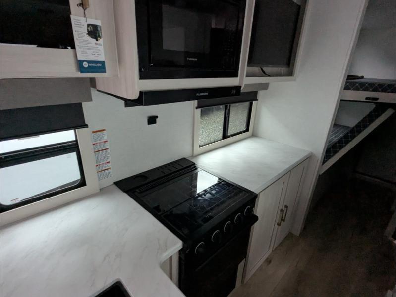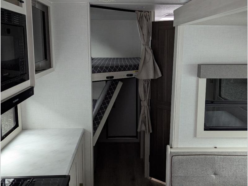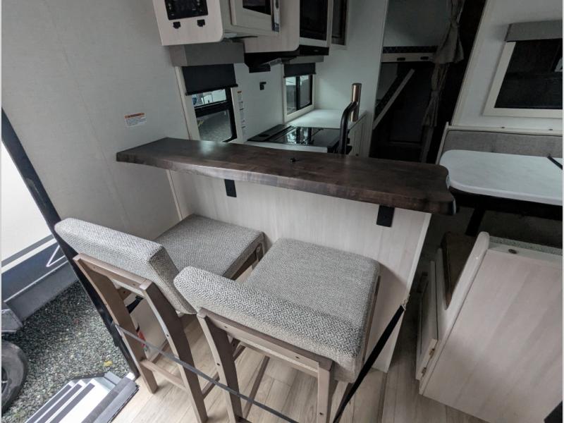 Every trip to the campground will be spent in comfort with this single slide out travel trailer. Once you arrive at the site, remove the kayaks or bikes from the rear storage door, start lunch on the outside kitchen, and put out the 15' power awning with LED lights. The interior includes a booth dinette slide with storage, a bar top with stools, plus an HD TV for movie nights. After a day of fun, head to the front private bedroom for a great night's rest on the queen bed, and you can store your belongings in the dual bedroom wardrobes!