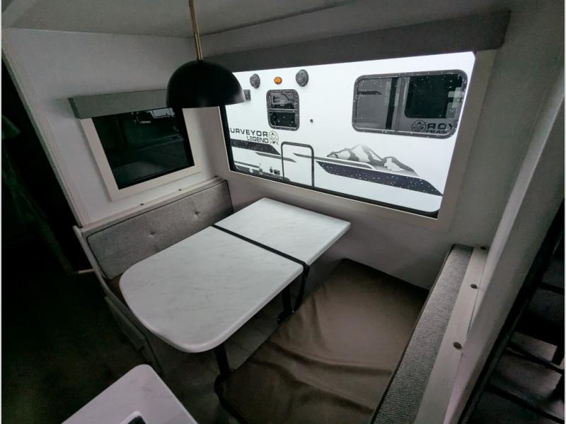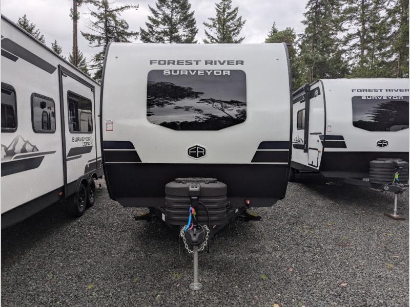 With any Surveyor Legend travel trailer by Forest River you will enjoy quality craftsmanship, convenient amenities, and at-home comforts. The Azdel composite walls provide a longer-lasting trailer, and the power tongue jack with a hitch light will get you back on the road in no-time. There are also Goodyear tires and a tire pressure monitoring system for hassle-free towing. Each model includes the Surveyor Legend Package that comes standard with oversized dinette storage access doors, front slam latch baggage doors, plus an automotive style tinted front windshield. You'll appreciate camping with a tankless water heater for endless hot showers, a 2" accessory hitch to bring bikes along, plus carpet-free interiors and a central vacuum system for easy clean up.