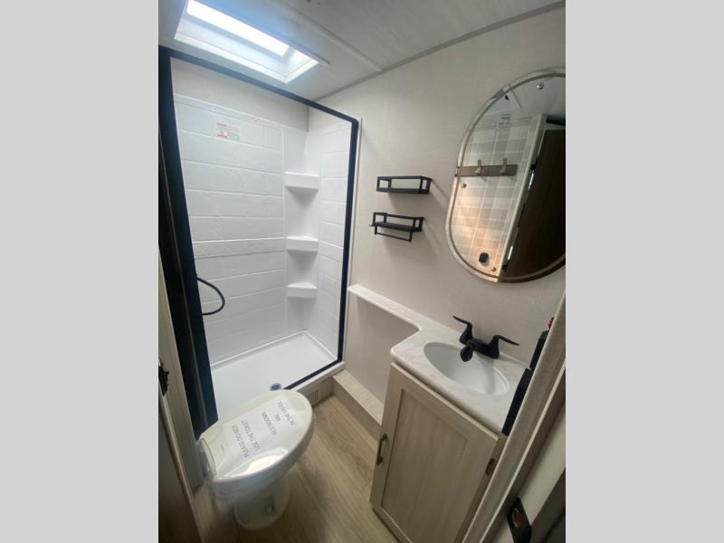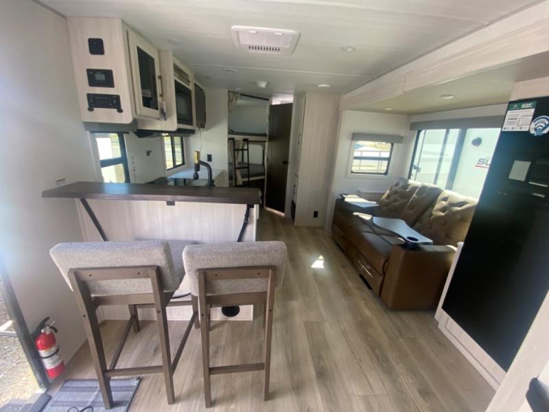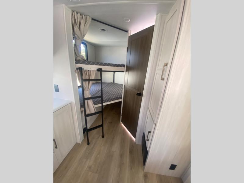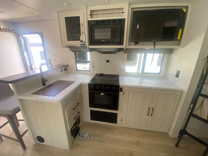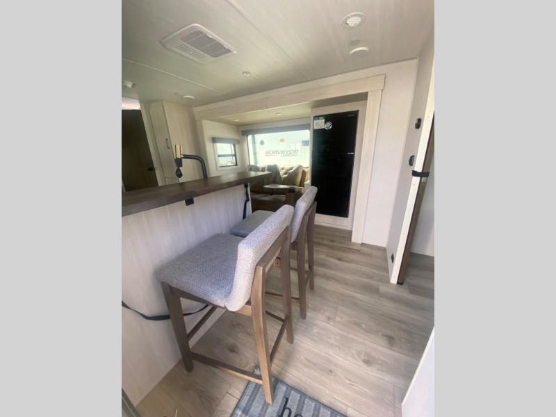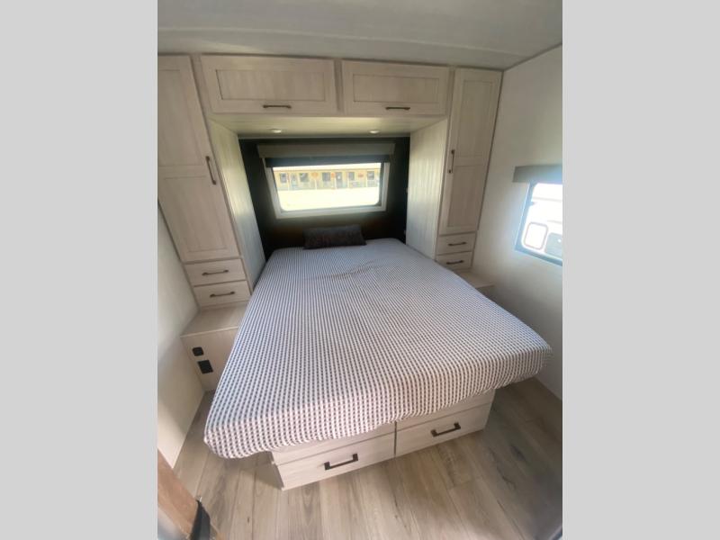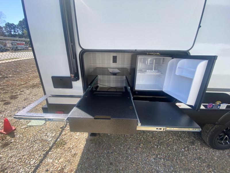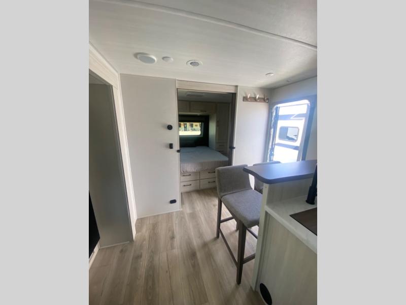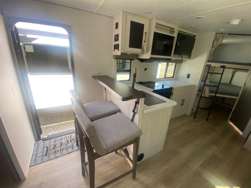 Every trip to the campground will be spent in comfort with this single slide out travel trailer. Once you arrive at the site, remove the kayaks or bikes from the rear storage door, start lunch on the outside kitchen, and put out the 15' power awning with LED lights. The interior includes a booth dinette slide with storage, a bar top with stools, plus an HD TV for movie nights. After a day of fun, head to the front private bedroom for a great night's rest on the queen bed, and you can store your belongings in the dual bedroom wardrobes!