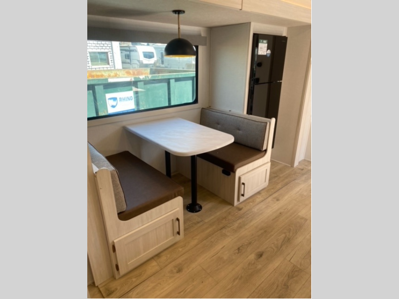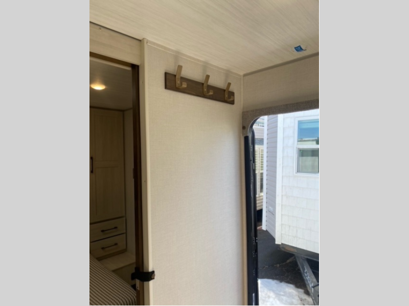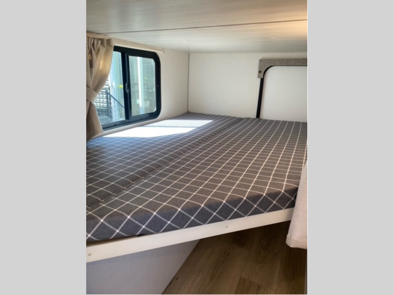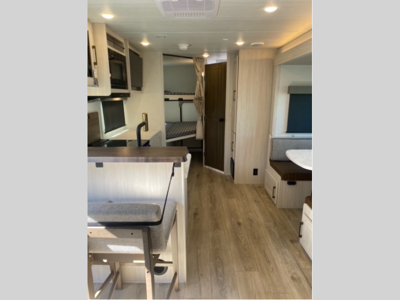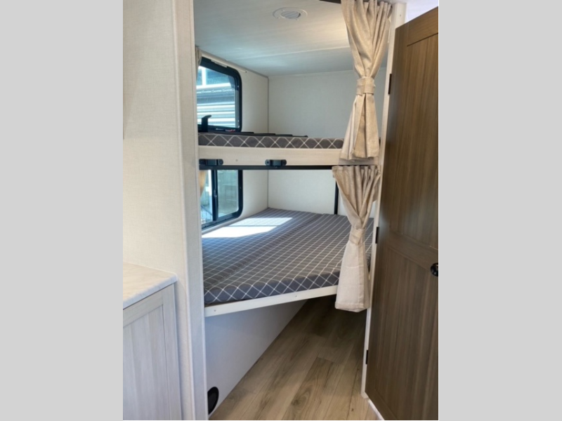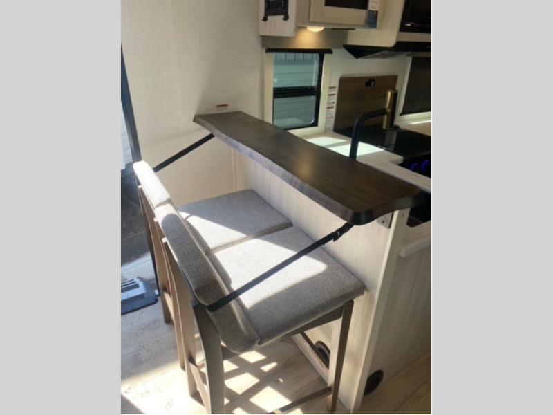 Every trip to the campground will be spent in comfort with this single slide out travel trailer. Once you arrive at the site, remove the kayaks or bikes from the rear storage door, start lunch on the outside kitchen, and put out the 15' power awning with LED lights. The interior includes a booth dinette slide with storage, a bar top with stools, plus an HD TV for movie nights. After a day of fun, head to the front private bedroom for a great night's rest on the queen bed, and you can store your belongings in the dual bedroom wardrobes!