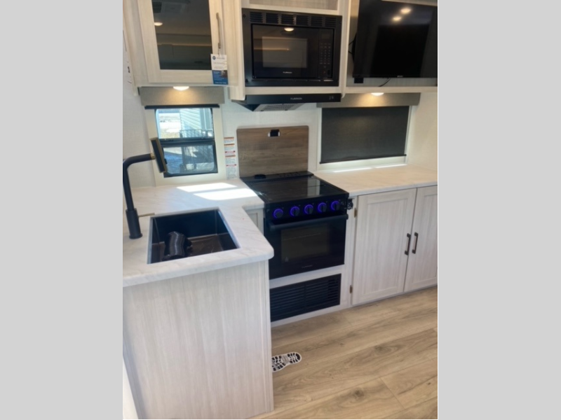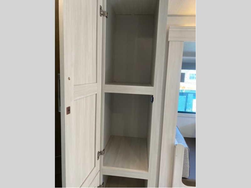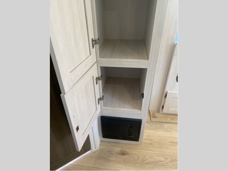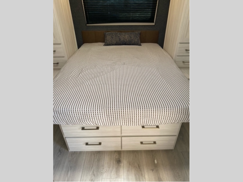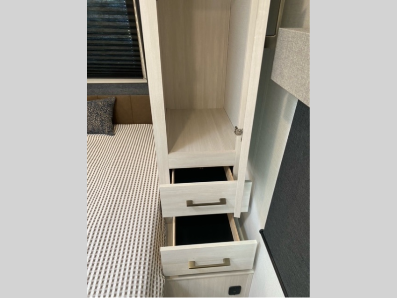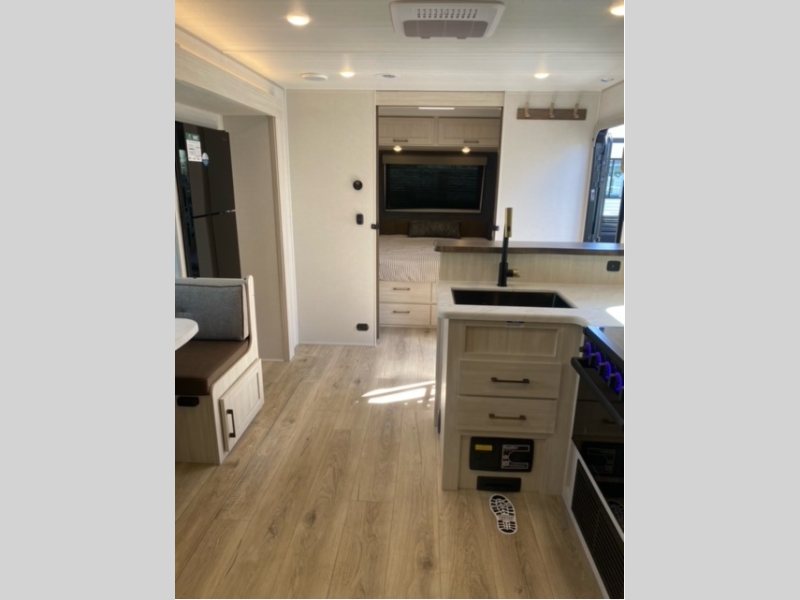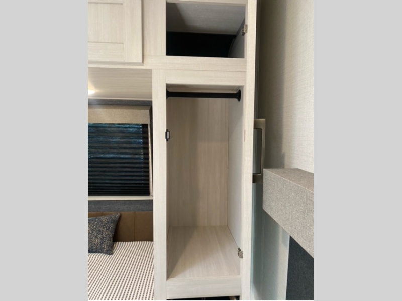 Every trip to the campground will be spent in comfort with this single slide out travel trailer. Once you arrive at the site, remove the kayaks or bikes from the rear storage door, start lunch on the outside kitchen, and put out the 15' power awning with LED lights. The interior includes a booth dinette slide with storage, a bar top with stools, plus an HD TV for movie nights. After a day of fun, head to the front private bedroom for a great night's rest on the queen bed, and you can store your belongings in the dual bedroom wardrobes!