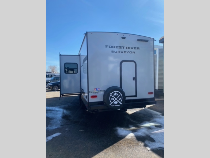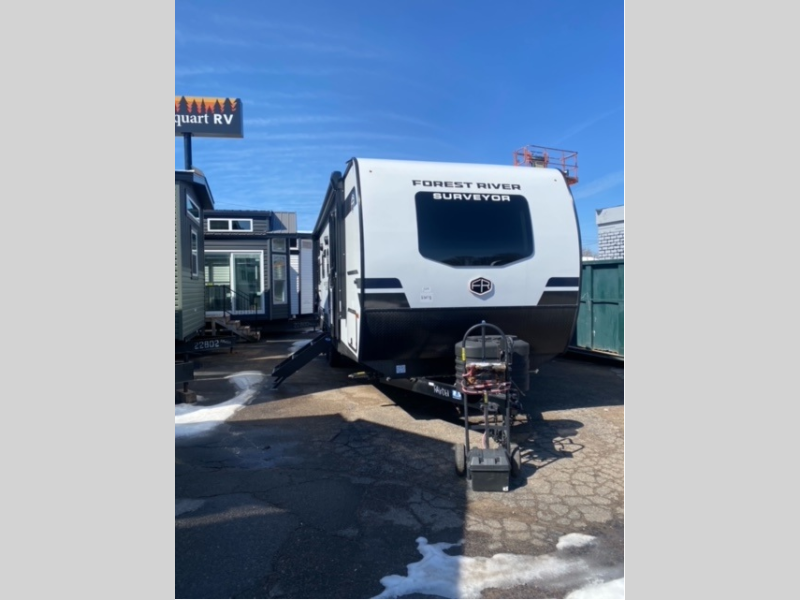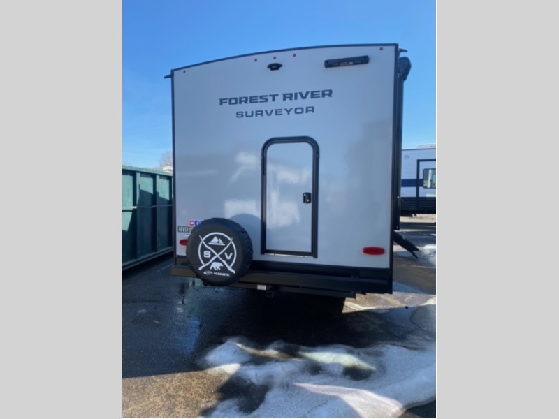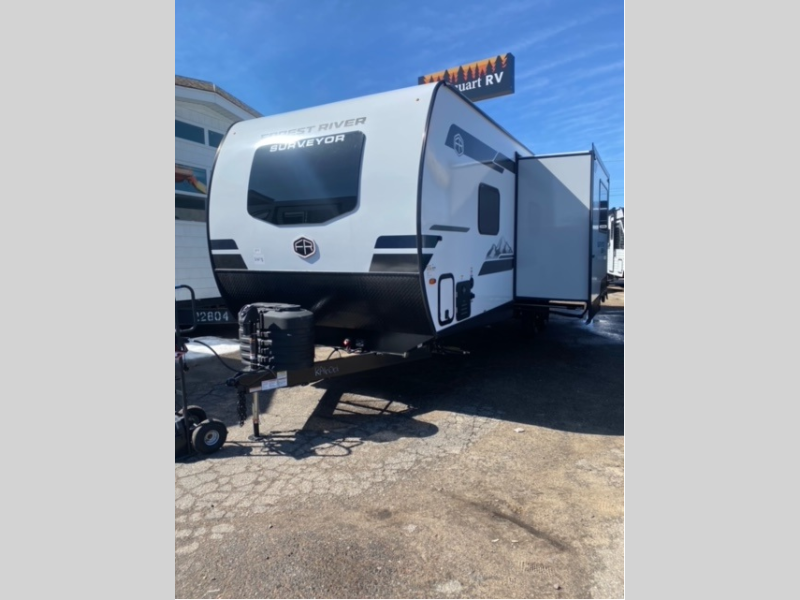 With any Surveyor Legend travel trailer by Forest River you will enjoy quality craftsmanship, convenient amenities, and at-home comforts. The Azdel composite walls provide a longer-lasting trailer, and the power tongue jack with hitch light makes getting back on the road quick and easy. There are also Goodyear® tires and a tire pressure monitoring system (TPMS) for more confident, hassle-free towing. Each model is built with thoughtful details like slam-latch exterior baggage doors and an automotive-style tinted front windshield that gives the front cap a sleek look while letting in natural light. You’ll appreciate camping with a tankless water heater for endless hot showers, a 2" rear accessory hitch to bring bikes or extra gear along, plus a central vacuum system that helps keep your easy-to-clean interior looking fresh.