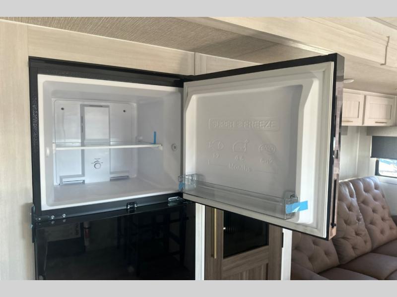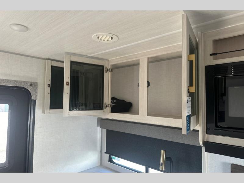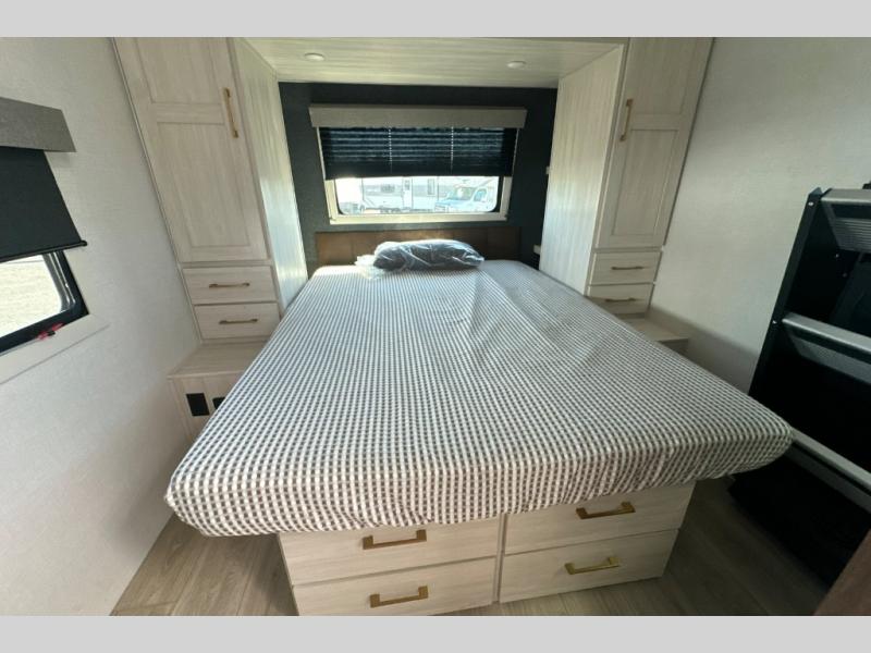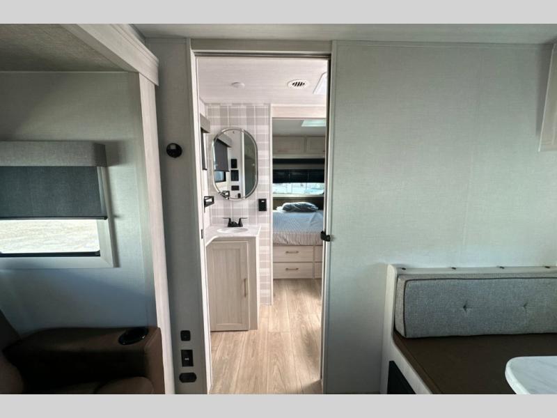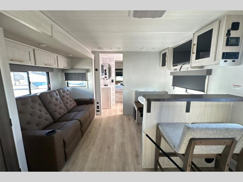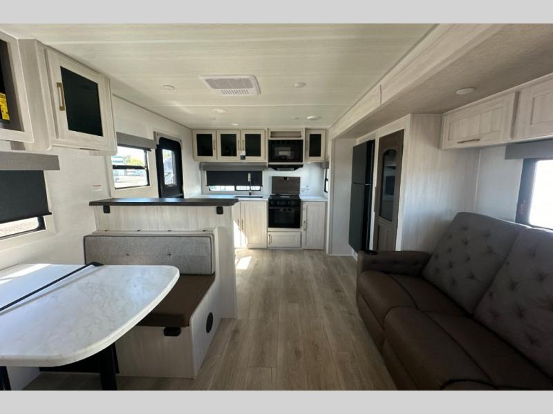 You'll love every minute spent in this cozy and convenient travel trailer. Since there are dual entry doors, you can enter in through the front master bedroom with a queen bed or the rear kitchen with ample counter space! A walk-thru bath will be easily accessible for everyone to use, and there is a night light here so you don't wake your crew up in the middle of the night. The tri-fold sofa slide in the main living area will provide a cozy seating space, as well as sleeping space for guests. And you can dine each day at the booth dinette or at the bartop with two seats that overlook the dinette!