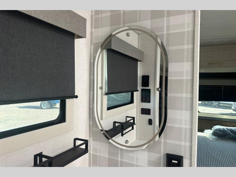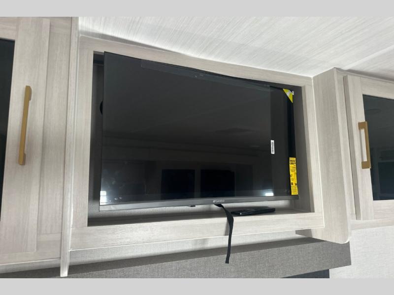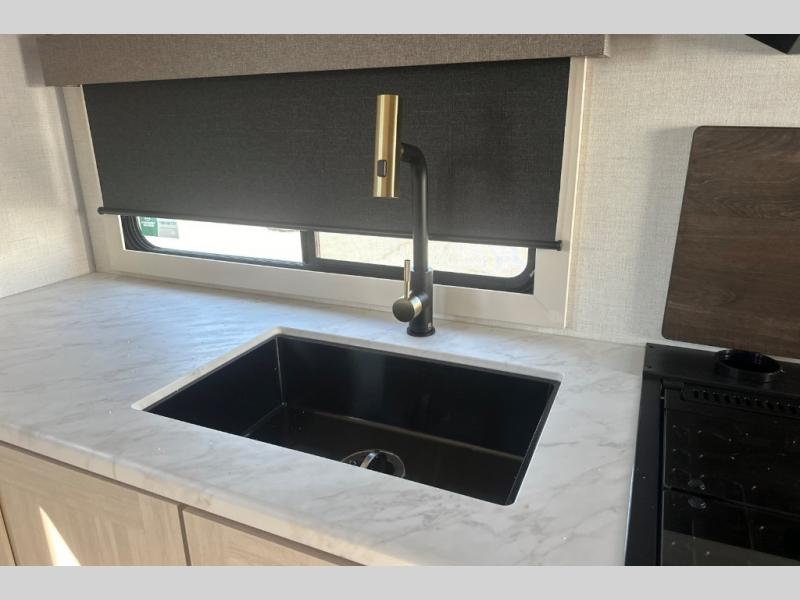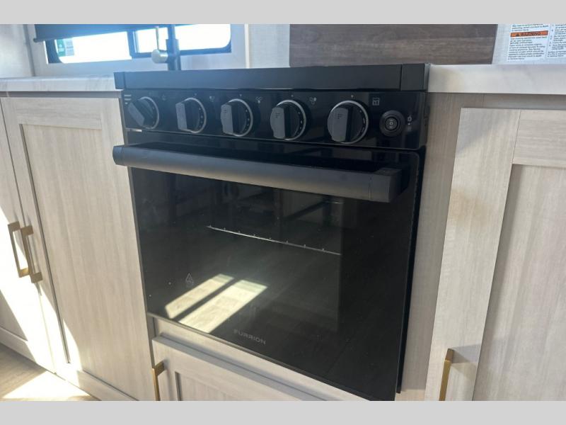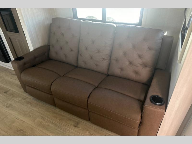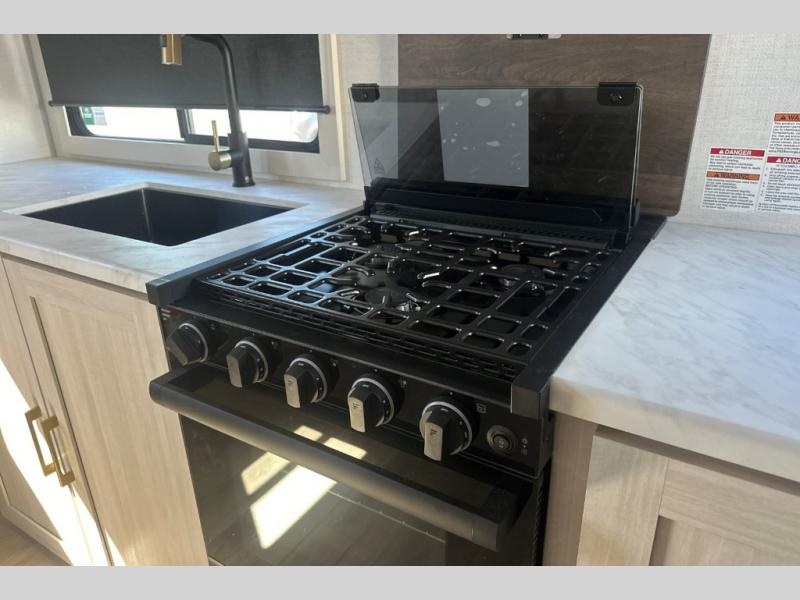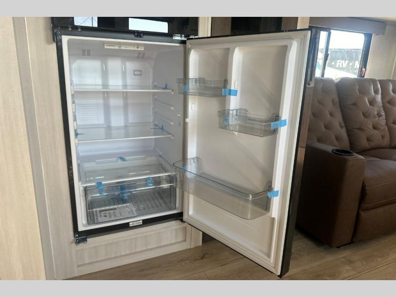 You'll love every minute spent in this cozy and convenient travel trailer. Since there are dual entry doors, you can enter in through the front master bedroom with a queen bed or the rear kitchen with ample counter space! A walk-thru bath will be easily accessible for everyone to use, and there is a night light here so you don't wake your crew up in the middle of the night. The tri-fold sofa slide in the main living area will provide a cozy seating space, as well as sleeping space for guests. And you can dine each day at the booth dinette or at the bartop with two seats that overlook the dinette!