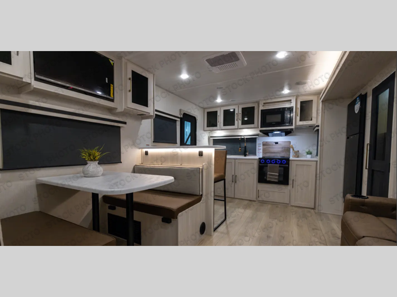 You'll love every minute spent in this cozy and convenient travel trailer. Since there are dual entry doors, you can enter in through the front master bedroom with a queen bed or the rear kitchen with ample counter space! A walk-thru bath will be easily accessible for everyone to use, and there is a night light here so you don't wake your crew up in the middle of the night. The tri-fold sofa slide in the main living area will provide a cozy seating space, as well as sleeping space for guests. And you can dine each day at the booth dinette or at the bartop with two seats that overlook the dinette!