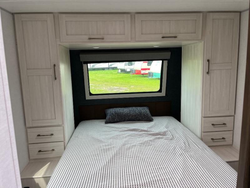 You'll love every minute spent in this cozy and convenient travel trailer. Since there are dual entry doors, you can enter in through the front master bedroom with a queen bed or the rear kitchen with ample counter space! A walk-thru bath will be easily accessible for everyone to use, and there is a night light here so you don't wake your crew up in the middle of the night. The EZ-out sofa slide in the main living area will provide a cozy seating space, as well as sleeping space for guests. And you can dine each day at the booth dinette or at the bartop with two seats that overlook the dinette!
