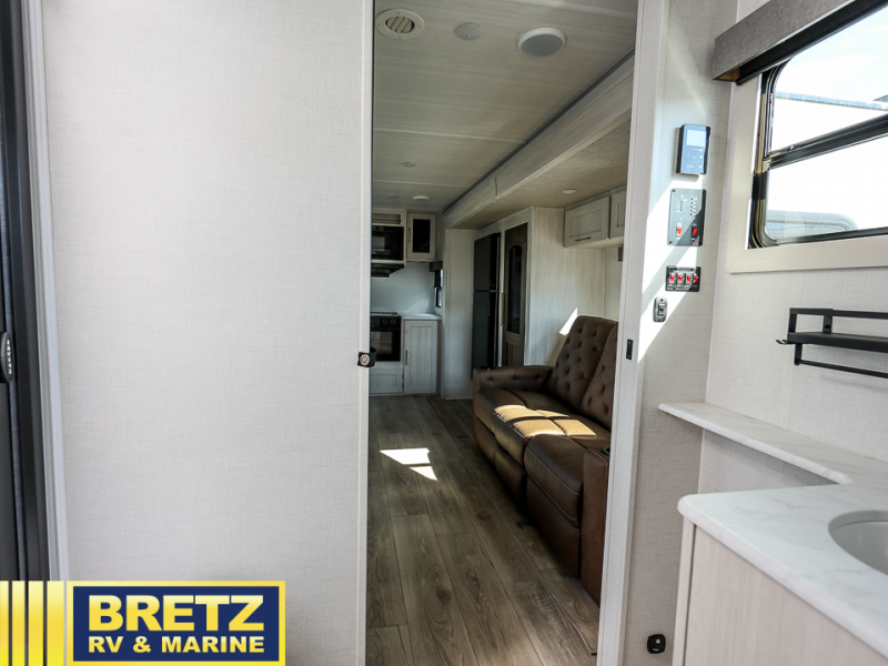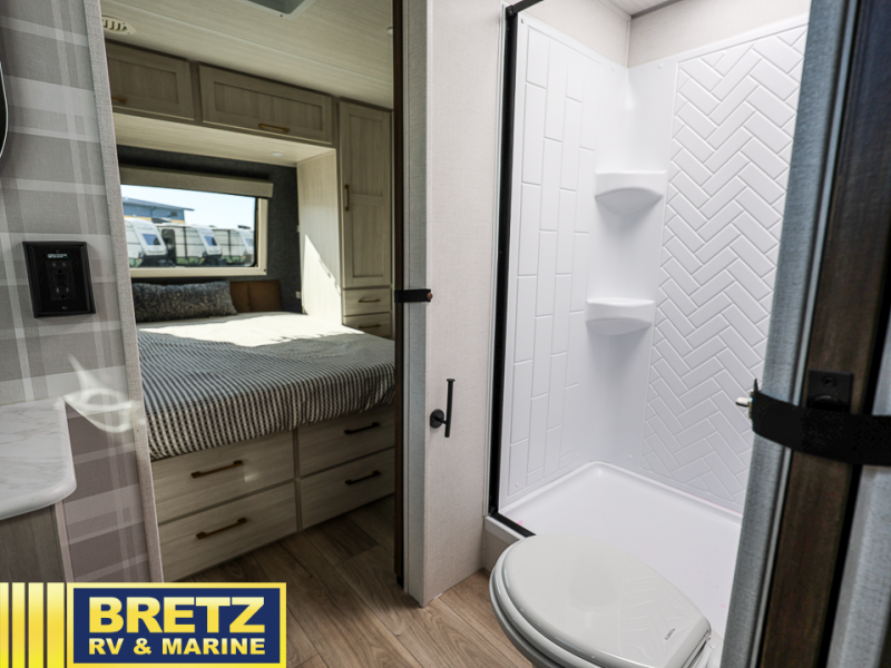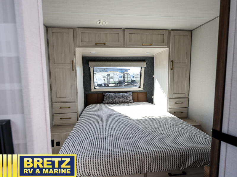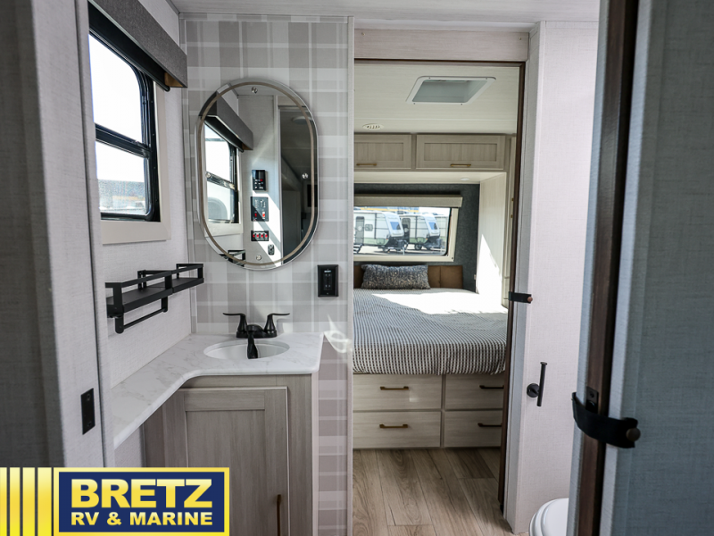 You'll love every minute spent in this cozy and convenient travel trailer. Since there are dual entry doors, you can enter in through the front master bedroom with a queen bed or the rear kitchen with ample counter space! A walk-thru bath will be easily accessible for everyone to use, and there is a night light here so you don't wake your crew up in the middle of the night. The EZ-out sofa slide in the main living area will provide a cozy seating space, as well as sleeping space for guests. And you can dine each day at the booth dinette or at the bartop with two seats that overlook the dinette!