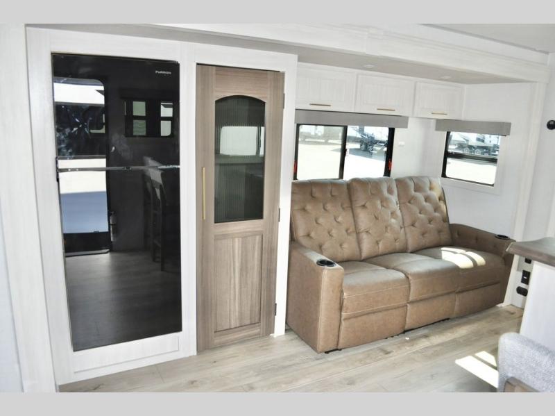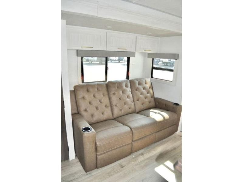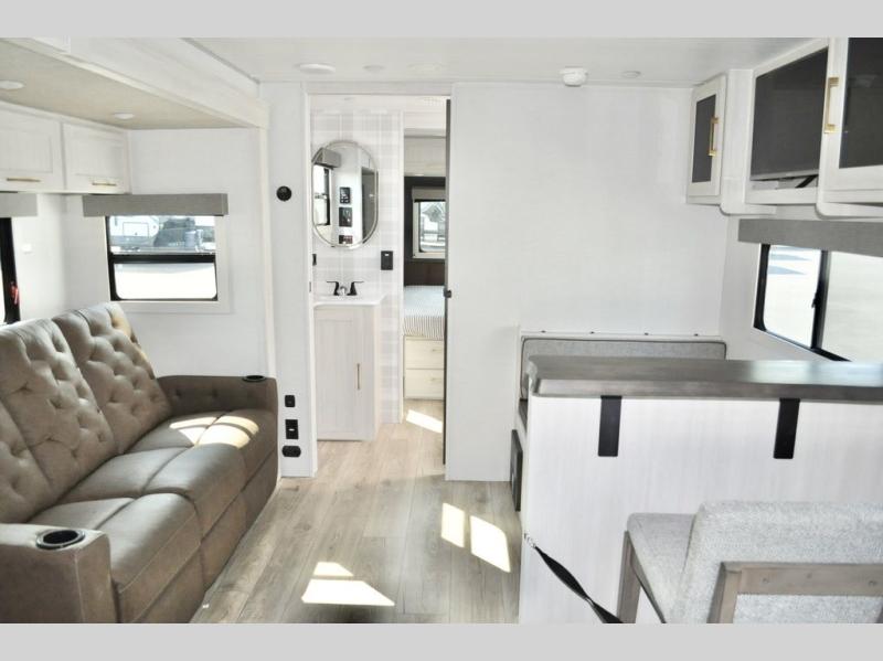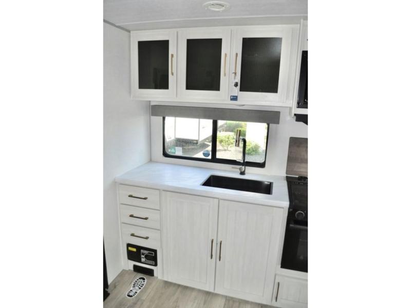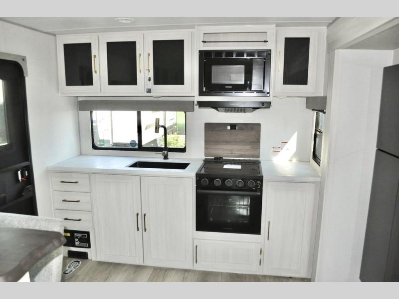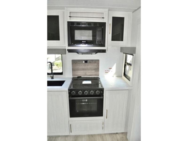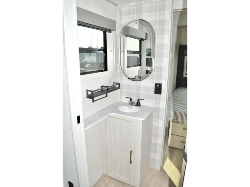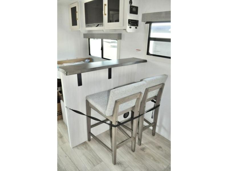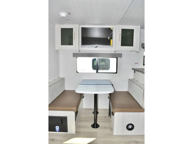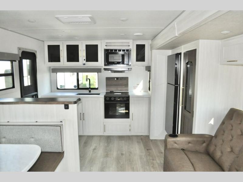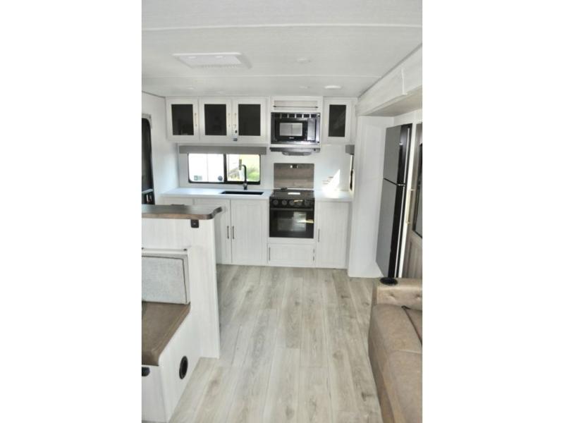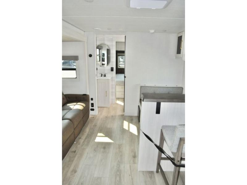 You'll love every minute spent in this cozy and convenient travel trailer. Since there are dual entry doors, you can enter in through the front master bedroom with a queen bed or the rear kitchen with ample counter space! A walk-thru bath will be easily accessible for everyone to use, and there is a night light here so you don't wake your crew up in the middle of the night. The EZ-out sofa slide in the main living area will provide a cozy seating space, as well as sleeping space for guests. And you can dine each day at the booth dinette or at the bartop with two seats that overlook the dinette!