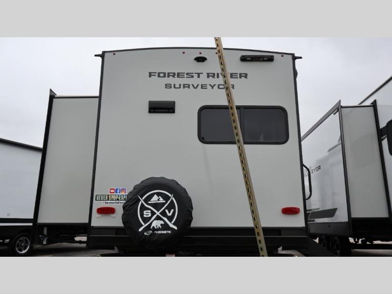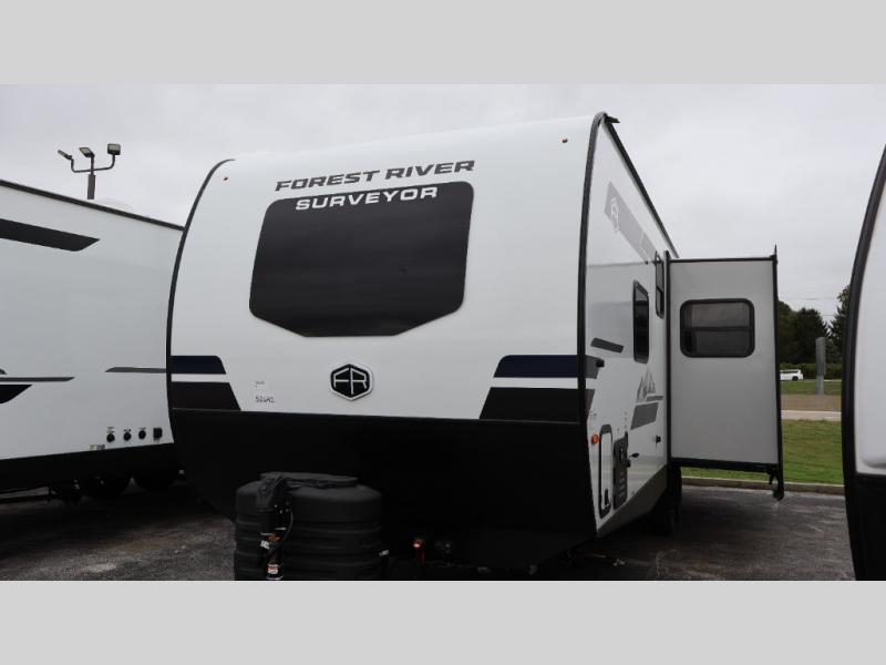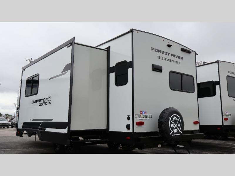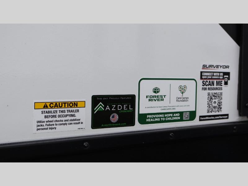 With any Surveyor Legend travel trailer by Forest River you will enjoy quality craftsmanship, convenient amenities, and at-home comforts. The Azdel composite walls provide a longer-lasting trailer, and the power tongue jack with a hitch light will get you back on the road in no-time. There are also Goodyear tires and a tire pressure monitoring system for hassle-free towing. Each model includes the Surveyor Legend Package that comes standard with oversized dinette storage access doors, front slam latch baggage doors, plus an automotive style tinted front windshield. You'll appreciate camping with a tankless water heater for endless hot showers, a 2" accessory hitch to bring bikes along, plus carpet-free interiors and a central vacuum system for easy clean up.