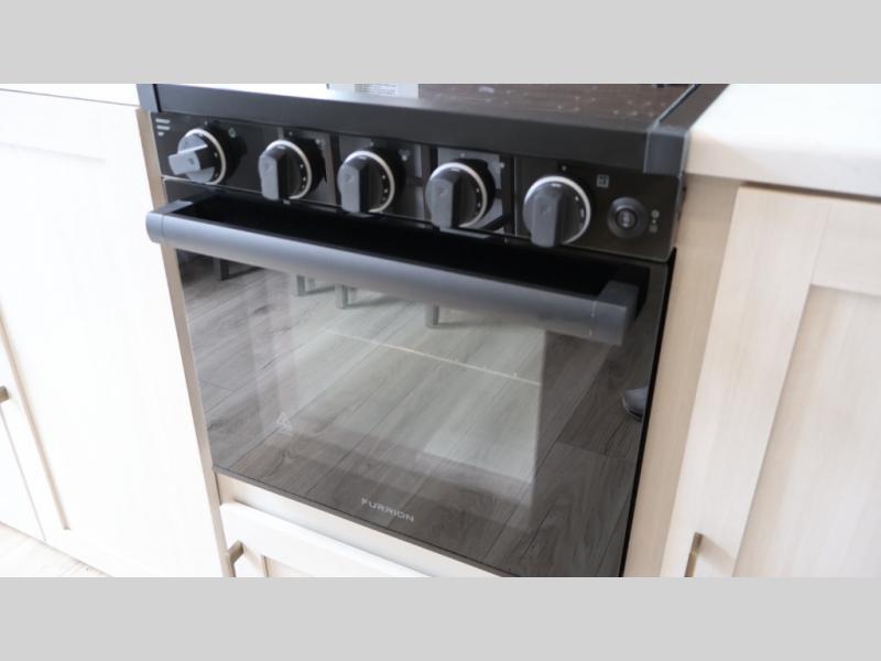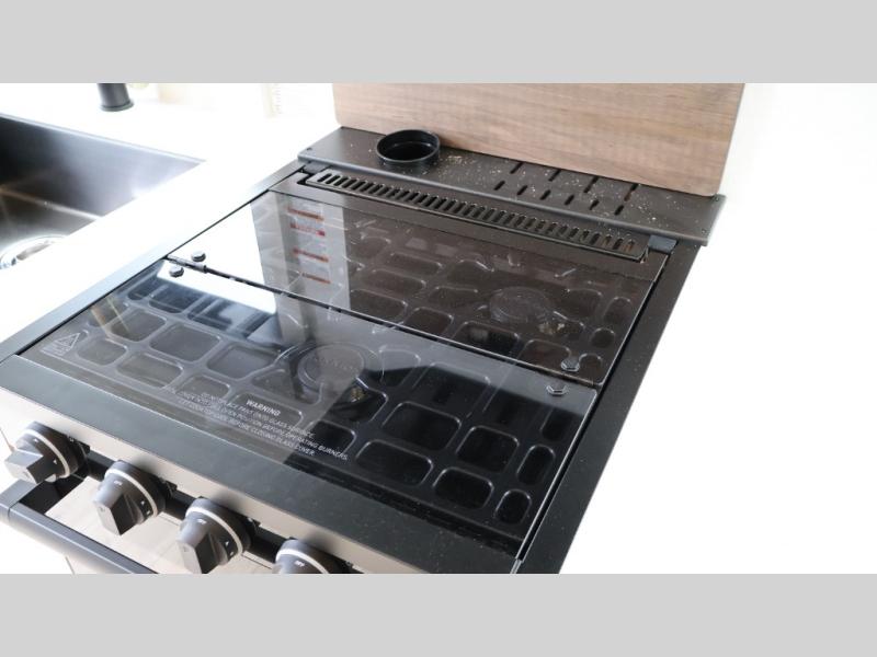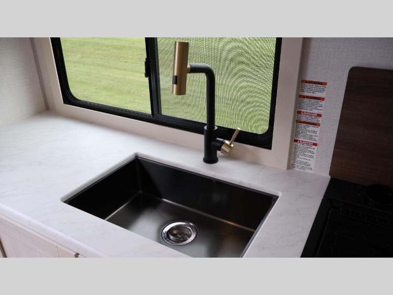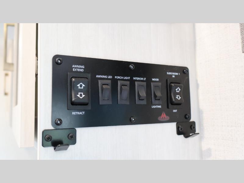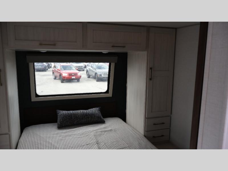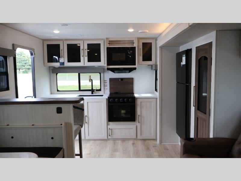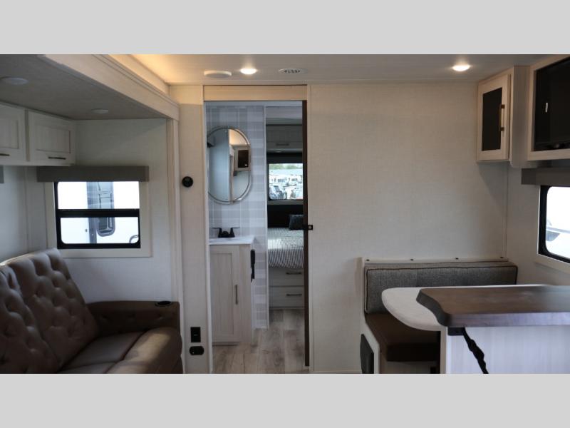 You'll love every minute spent in this cozy and convenient travel trailer. Since there are dual entry doors, you can enter in through the front master bedroom with a queen bed or the rear kitchen with ample counter space! A walk-thru bath will be easily accessible for everyone to use, and there is a night light here so you don't wake your crew up in the middle of the night. The EZ-out sofa slide in the main living area will provide a cozy seating space, as well as sleeping space for guests. And you can dine each day at the booth dinette or at the bartop with two seats that overlook the dinette!