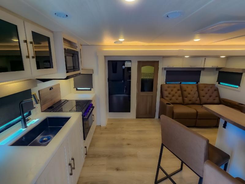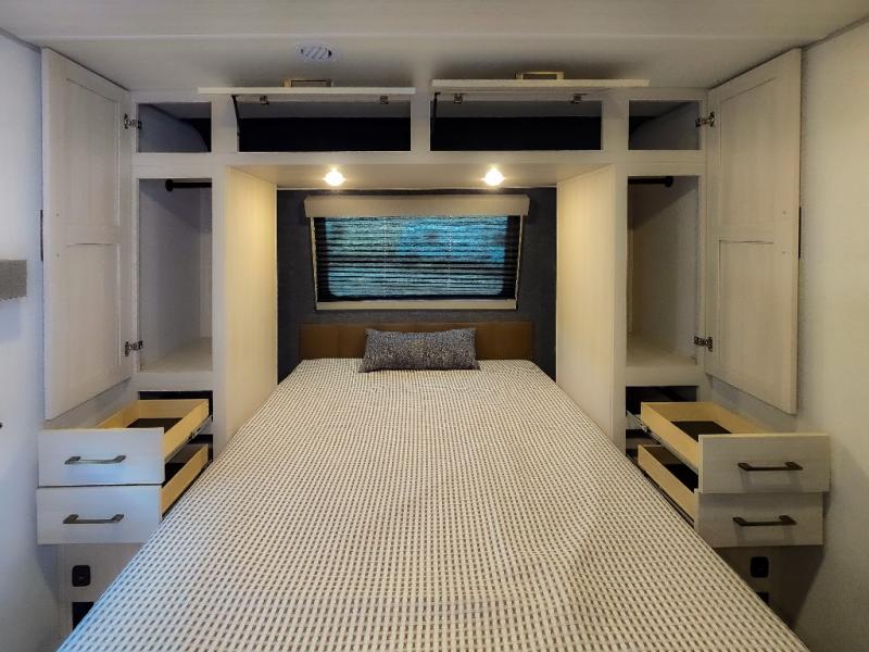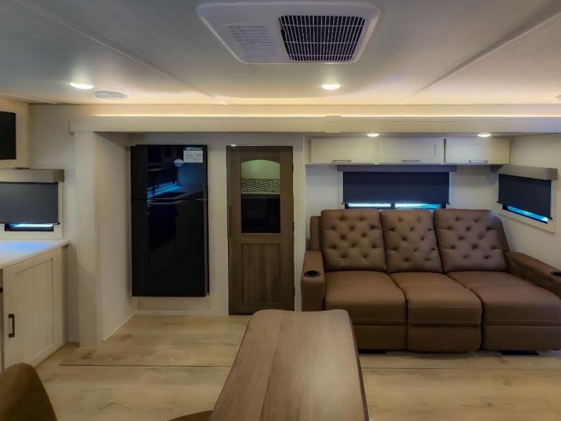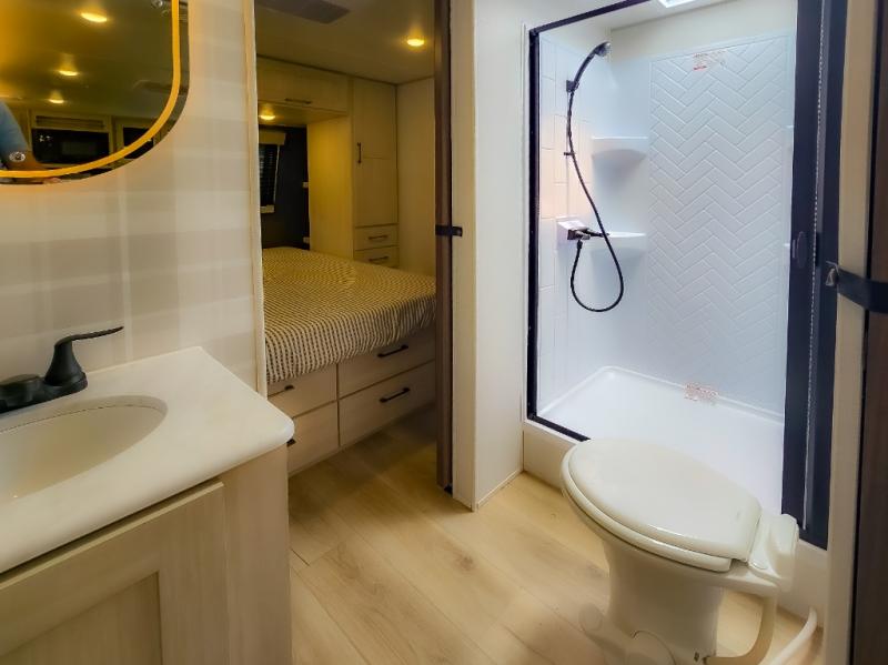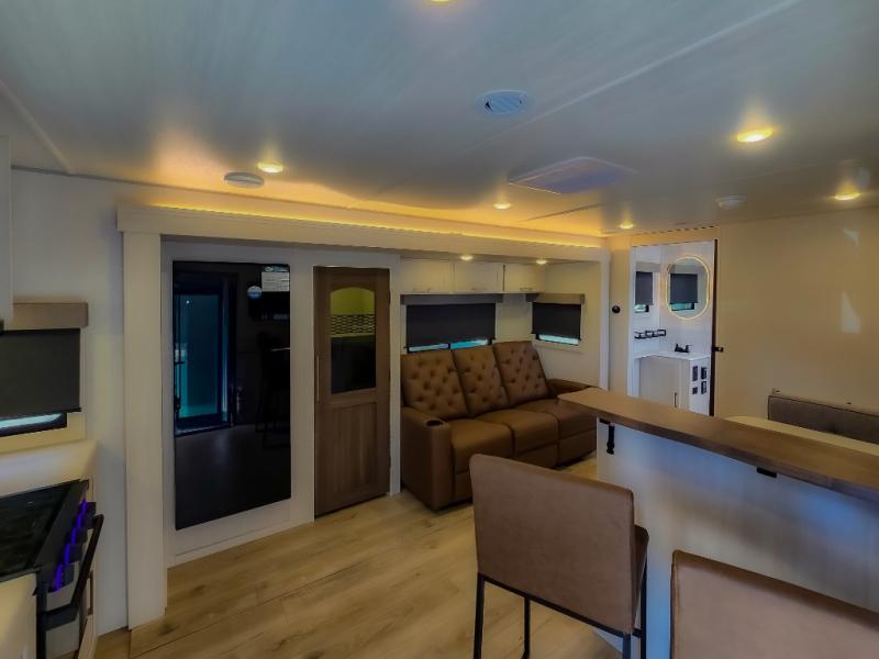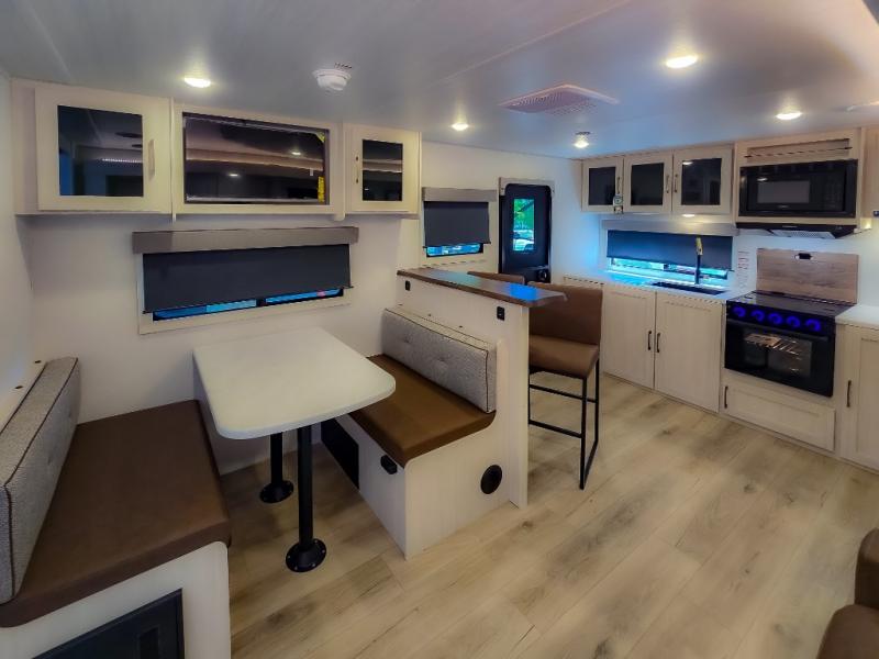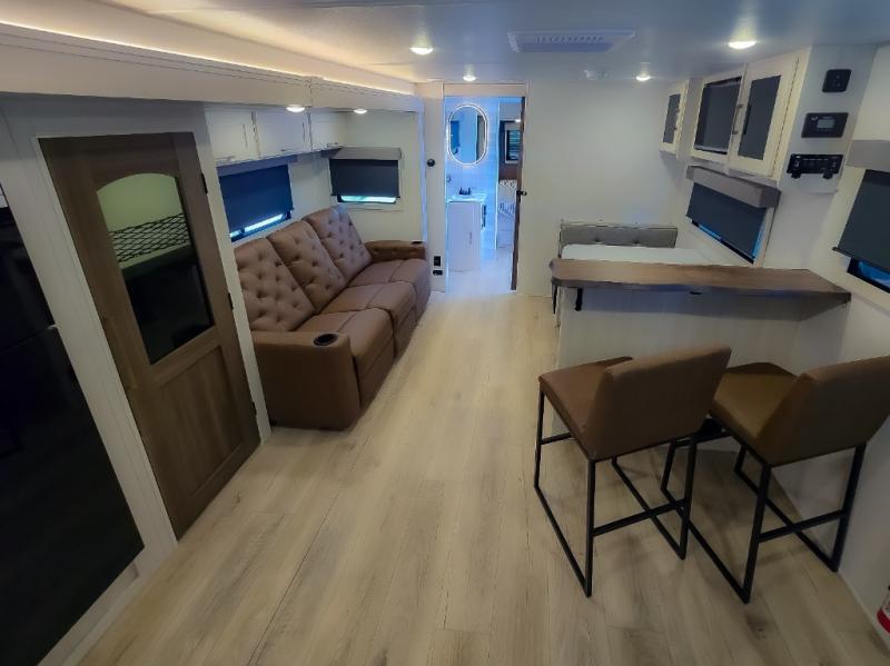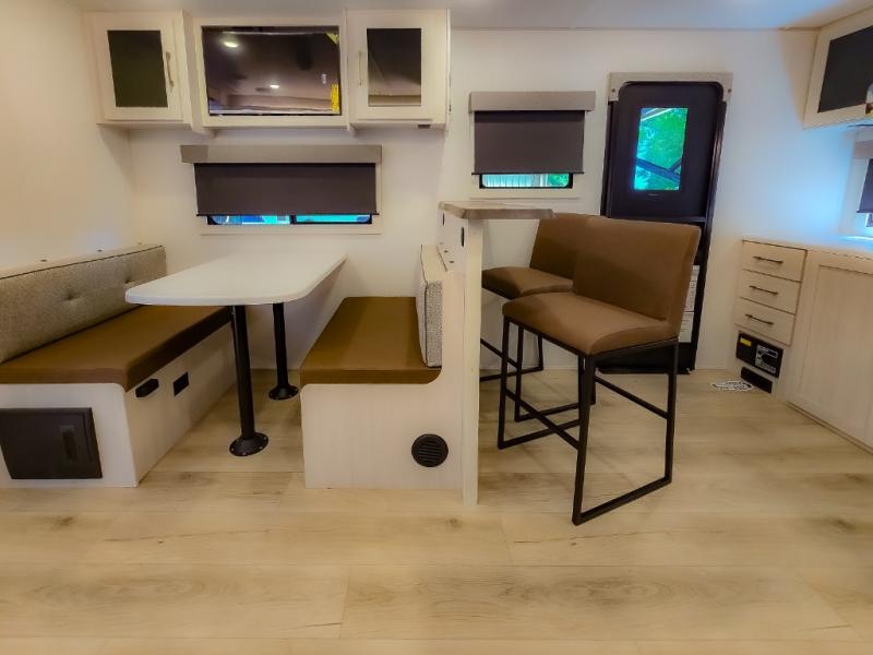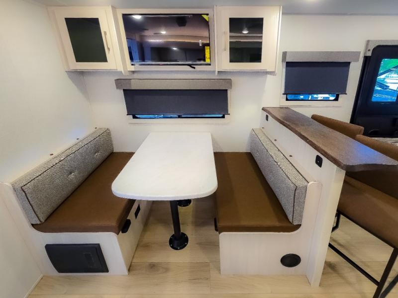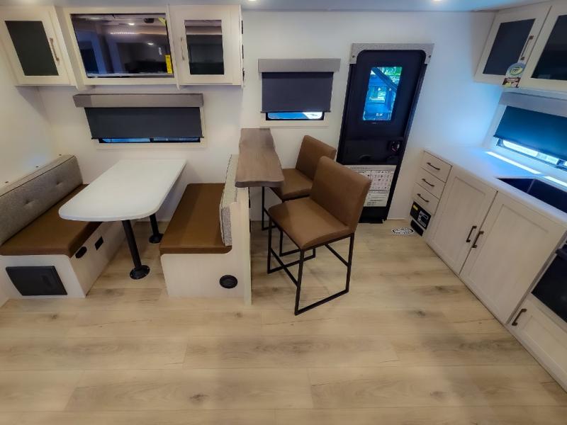 You'll love every minute spent in this cozy and convenient travel trailer. Since there are dual entry doors, you can enter in through the front master bedroom with a queen bed or the rear kitchen with ample counter space! A walk-thru bath will be easily accessible for everyone to use, and there is a night light here so you don't wake your crew up in the middle of the night. The EZ-out sofa slide in the main living area will provide a cozy seating space, as well as sleeping space for guests. And you can dine each day at the booth dinette or at the bartop with two seats that overlook the dinette!