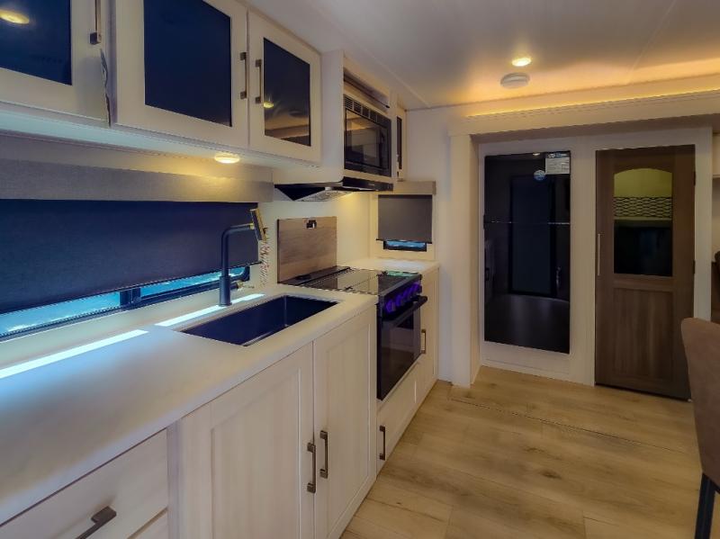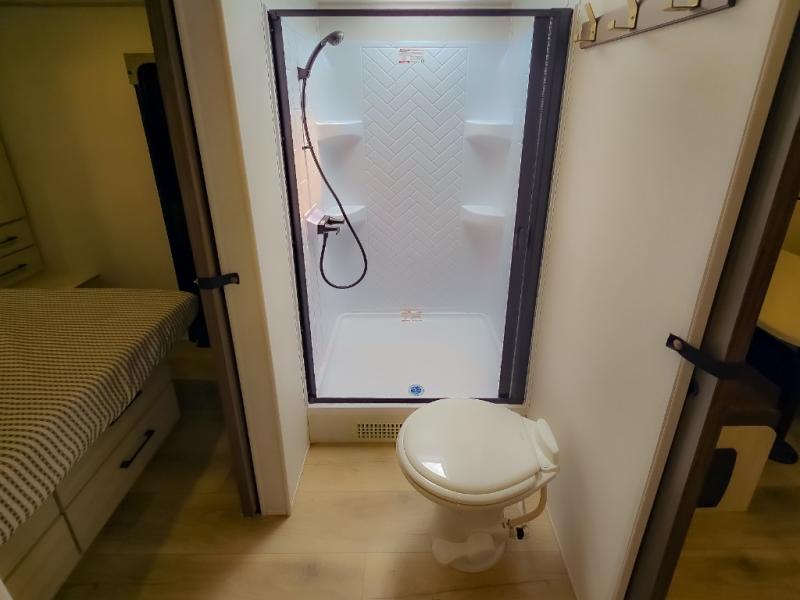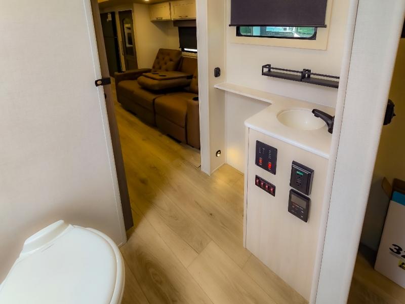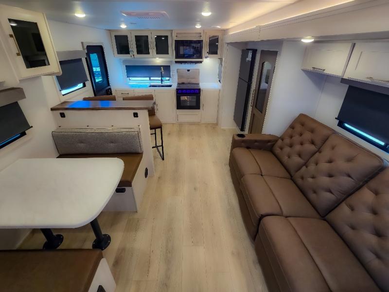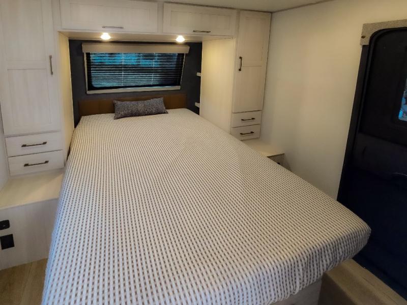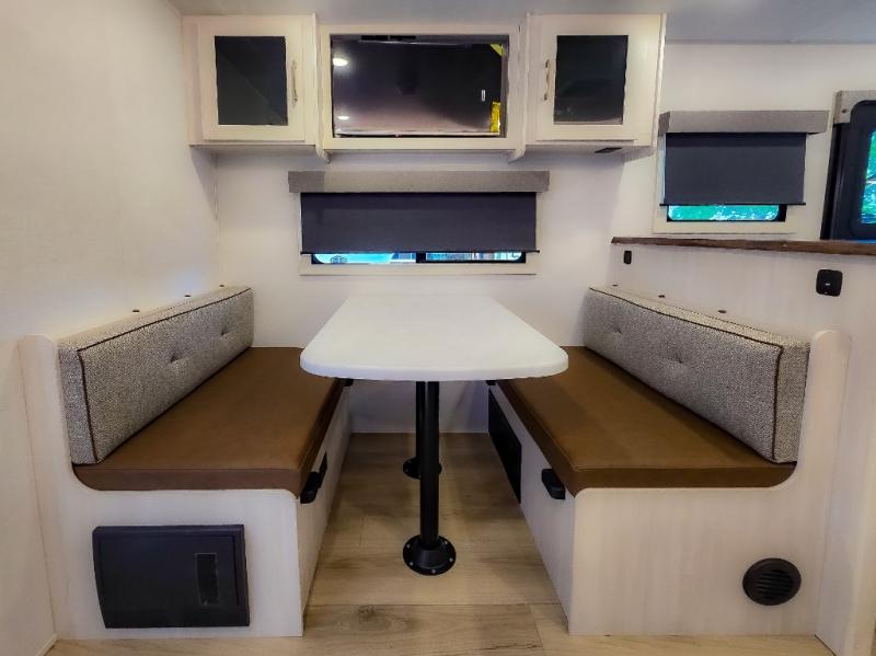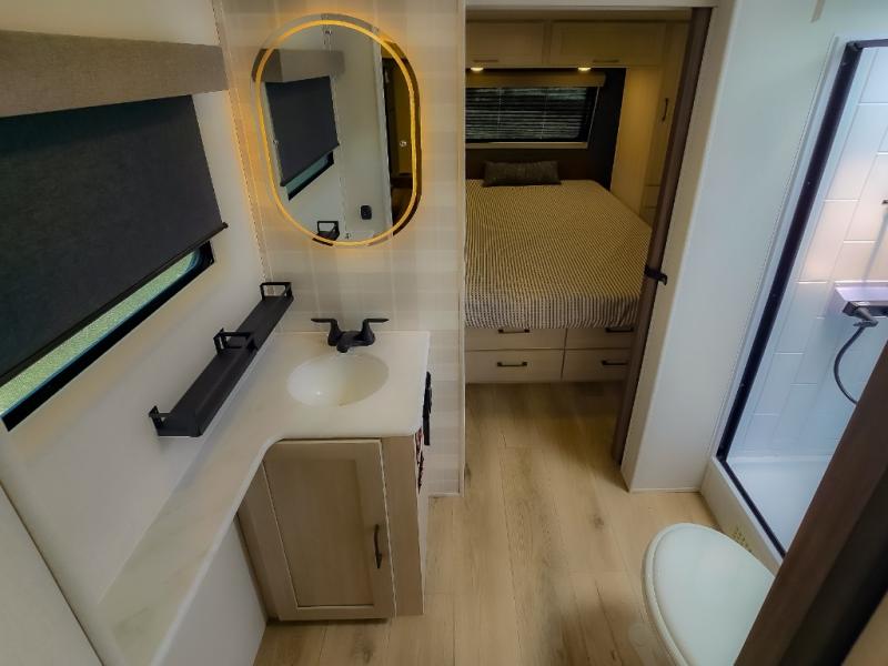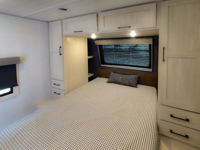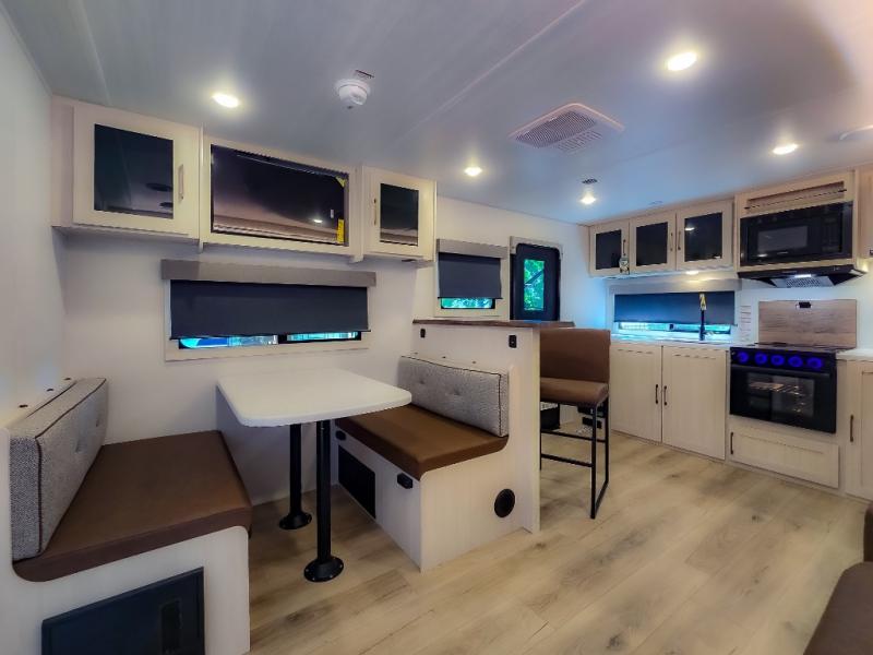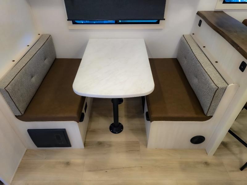 You'll love every minute spent in this cozy and convenient travel trailer. Since there are dual entry doors, you can enter in through the front master bedroom with a queen bed or the rear kitchen with ample counter space! A walk-thru bath will be easily accessible for everyone to use, and there is a night light here so you don't wake your crew up in the middle of the night. The EZ-out sofa slide in the main living area will provide a cozy seating space, as well as sleeping space for guests. And you can dine each day at the booth dinette or at the bartop with two seats that overlook the dinette!