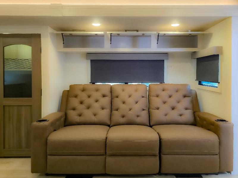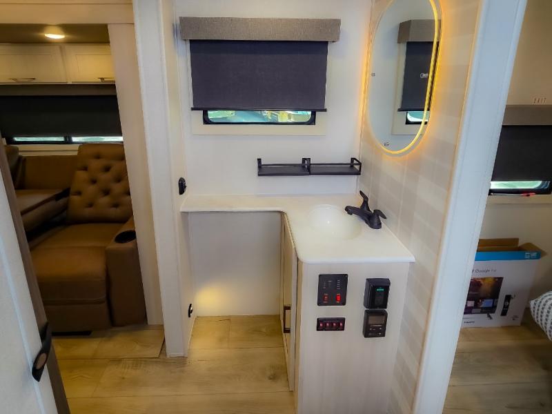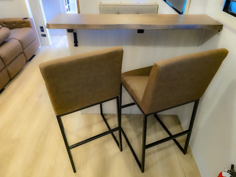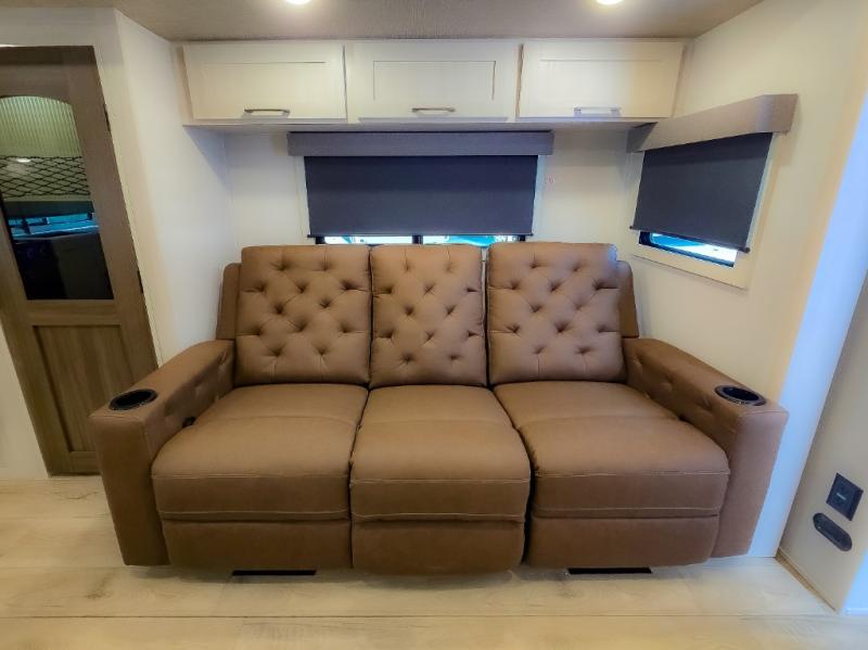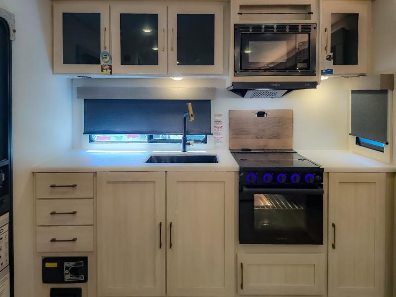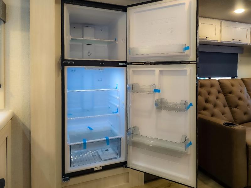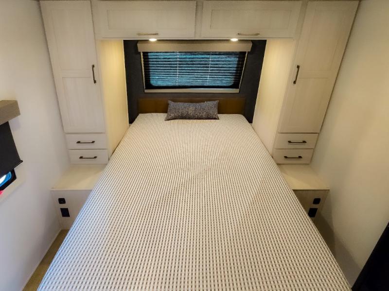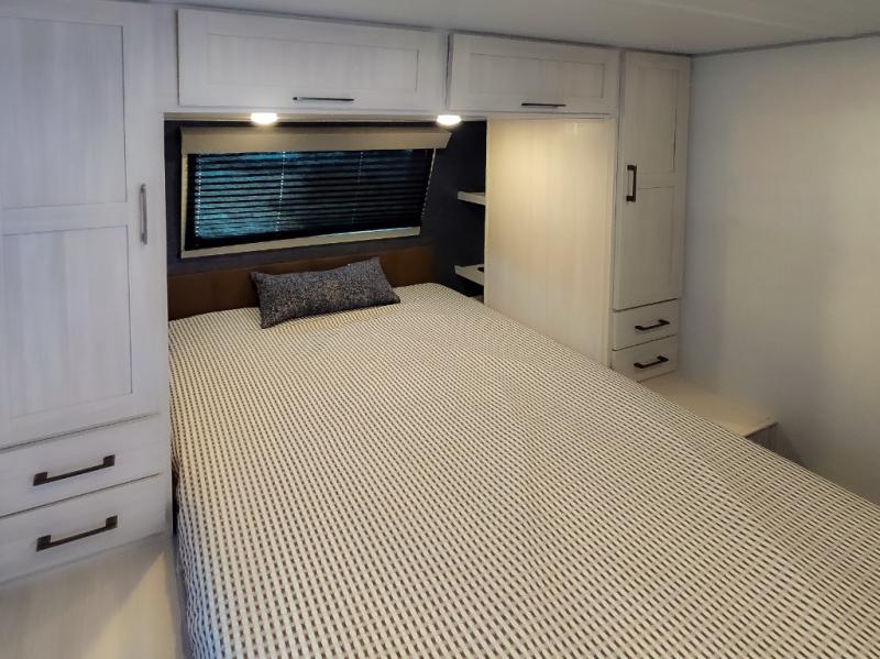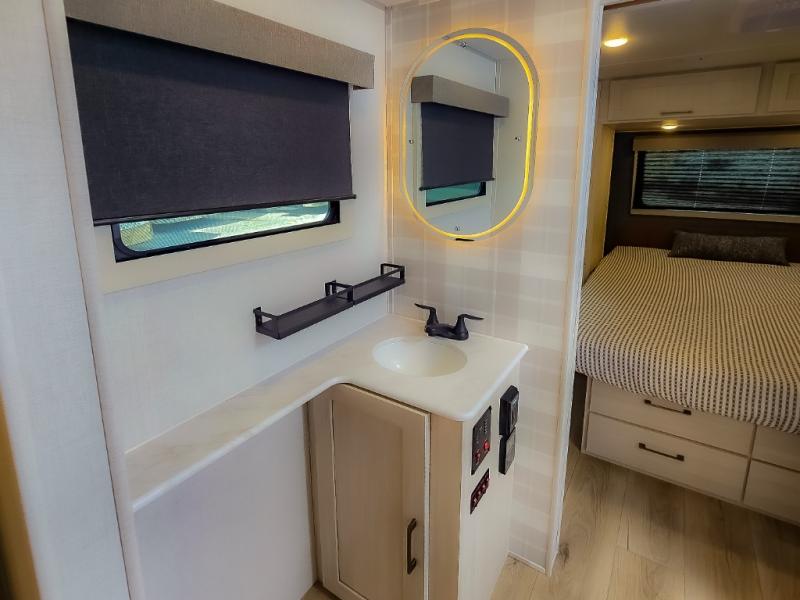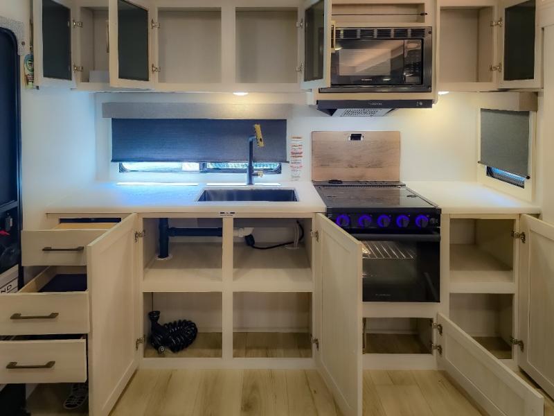 You'll love every minute spent in this cozy and convenient travel trailer. Since there are dual entry doors, you can enter in through the front master bedroom with a queen bed or the rear kitchen with ample counter space! A walk-thru bath will be easily accessible for everyone to use, and there is a night light here so you don't wake your crew up in the middle of the night. The EZ-out sofa slide in the main living area will provide a cozy seating space, as well as sleeping space for guests. And you can dine each day at the booth dinette or at the bartop with two seats that overlook the dinette!