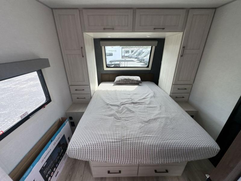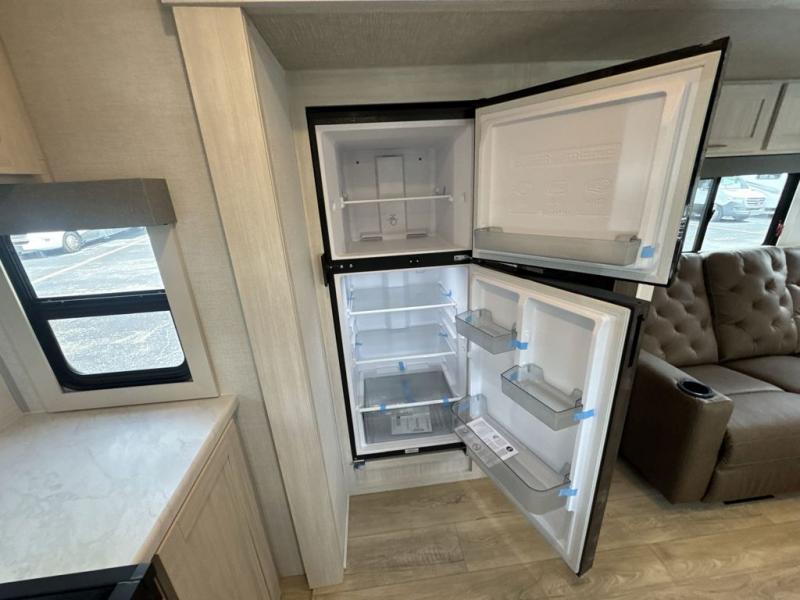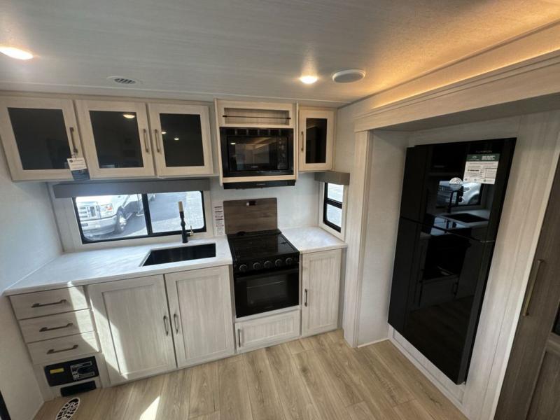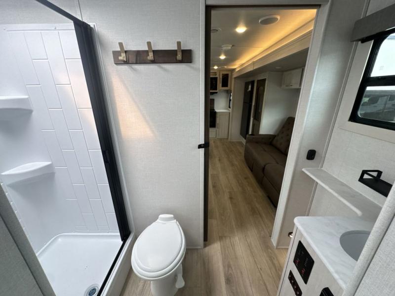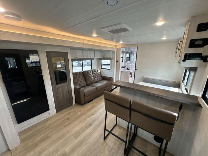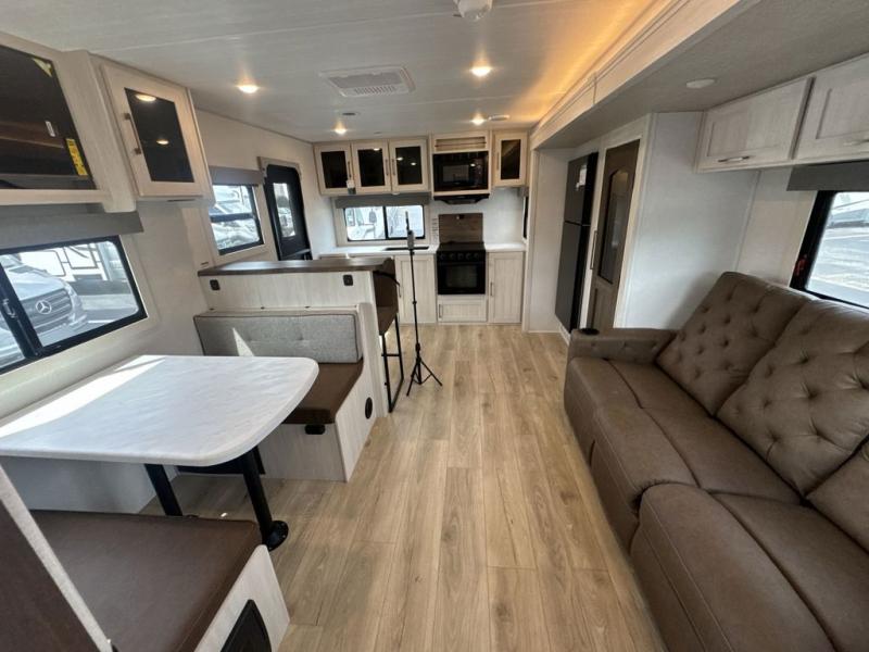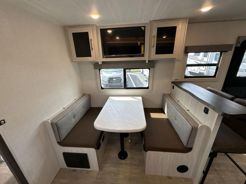 You'll love every minute spent in this cozy and convenient travel trailer. Since there are dual entry doors, you can enter in through the front bedroom with a queen bed or the rear kitchen with ample counter space! A walk-thru bath will be easily accessible for everyone to use, and there is a night light here so you don't wake your crew up in the middle of the night. The EZ-out sofa slide in the main living area will provide a cozy seating space, as well as sleeping space for guests. And you can dine each day at the booth dinette or at the bar top with two seats that overlook the dinette!