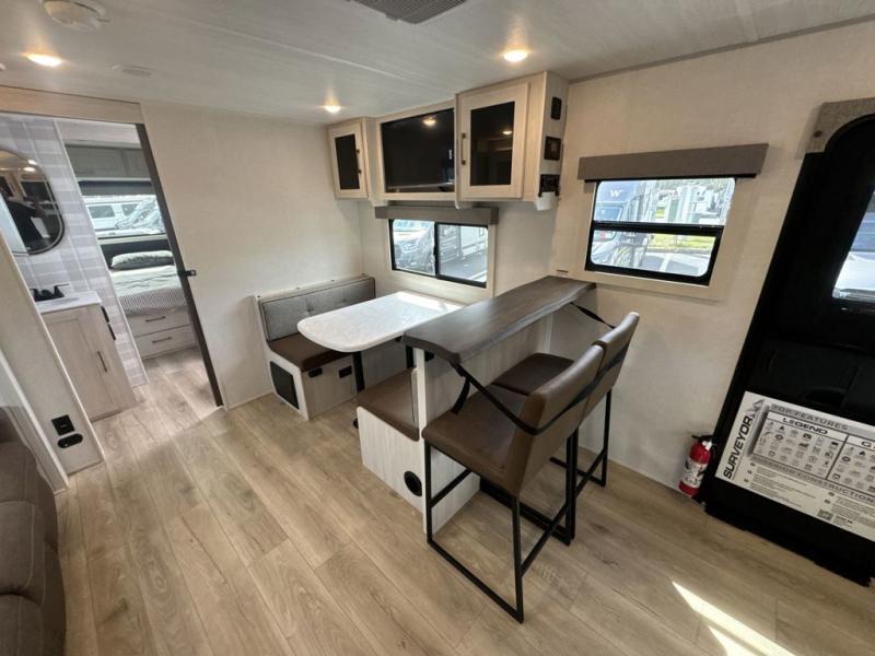 With any Surveyor Legend travel trailer by Forest River you will enjoy quality craftsmanship, convenient amenities, and at-home comforts. The Azdel composite walls provide a longer-lasting trailer, and the power tongue jack with a hitch light will get you back on the road in no-time. There are also Goodyear tires and a tire pressure monitoring system for hassle-free towing. Each model includes the Surveyor Legend Package that comes standard with oversized dinette storage access doors, front slam latch baggage doors, plus an automotive style tinted front windshield. You'll appreciate camping with a tankless water heater for endless hot showers, a 2" accessory hitch to bring bikes along, plus carpet-free interiors and a central vacuum system for easy clean up.