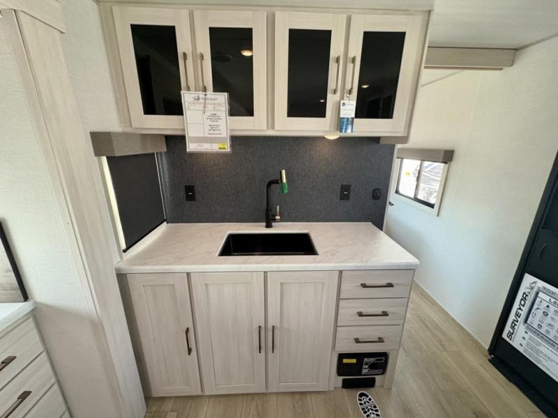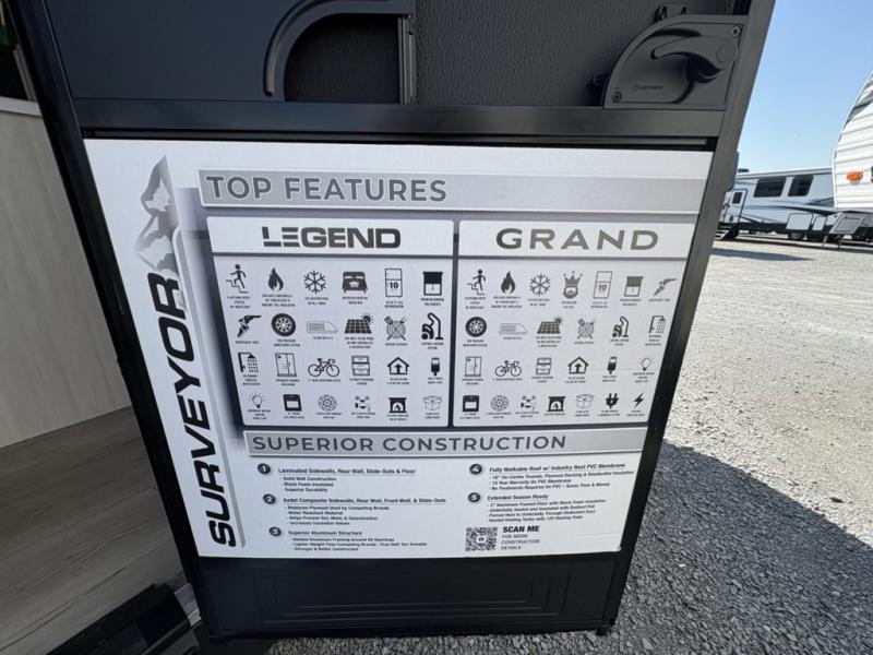 With any Surveyor Legend travel trailer by Forest River you will enjoy quality craftsmanship, convenient amenities, and at-home comforts. The Azdel composite walls provide a longer-lasting trailer, and the power tongue jack with a hitch light will get you back on the road in no-time. There are also Goodyear tires and a tire pressure monitoring system for hassle-free towing. Each model includes the Surveyor Legend Package that comes standard with oversized dinette storage access doors, front slam latch baggage doors, plus an automotive style tinted front windshield. You'll appreciate camping with a tankless water heater for endless hot showers, a 2" accessory hitch to bring bikes along, plus carpet-free interiors and a central vacuum system for easy clean up.