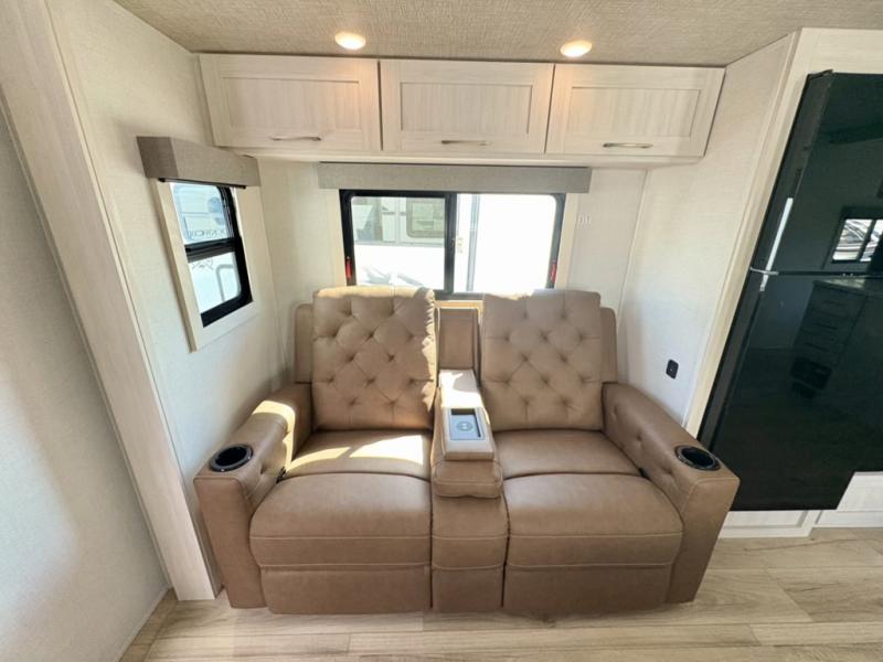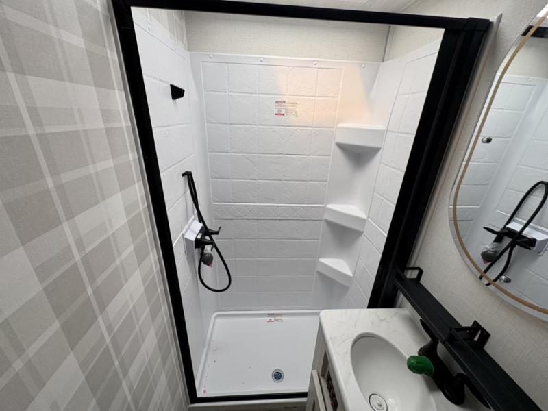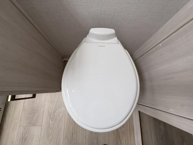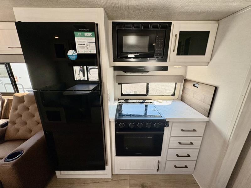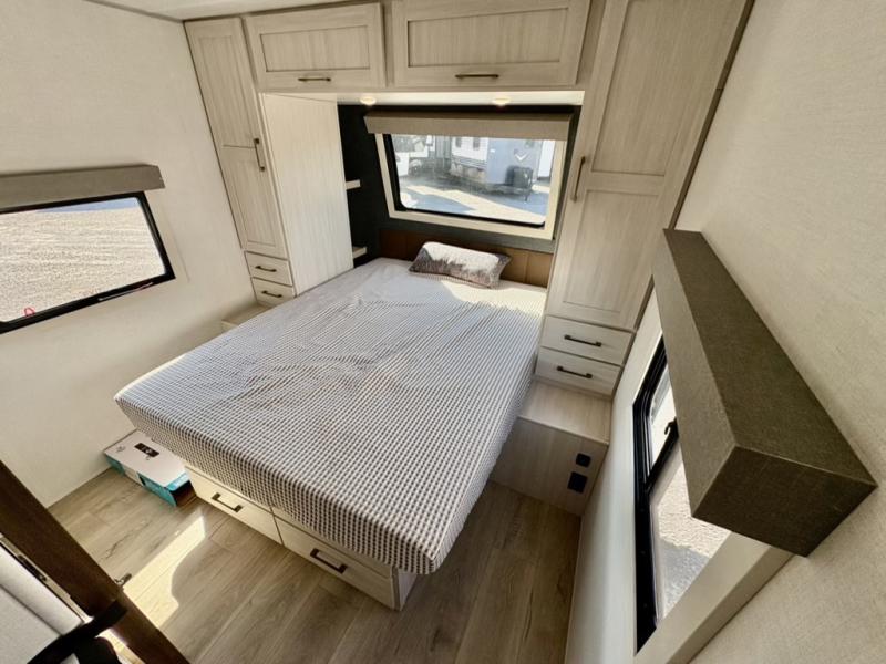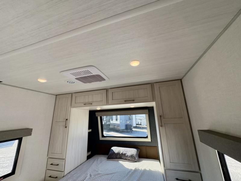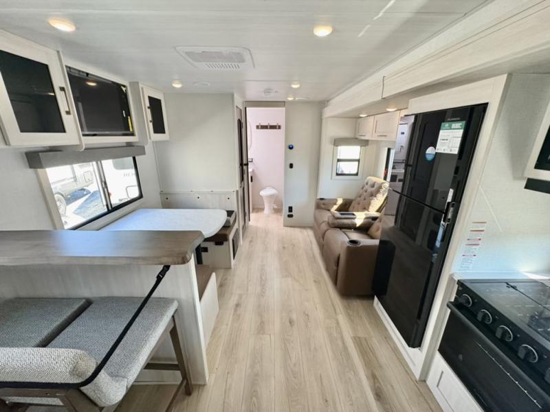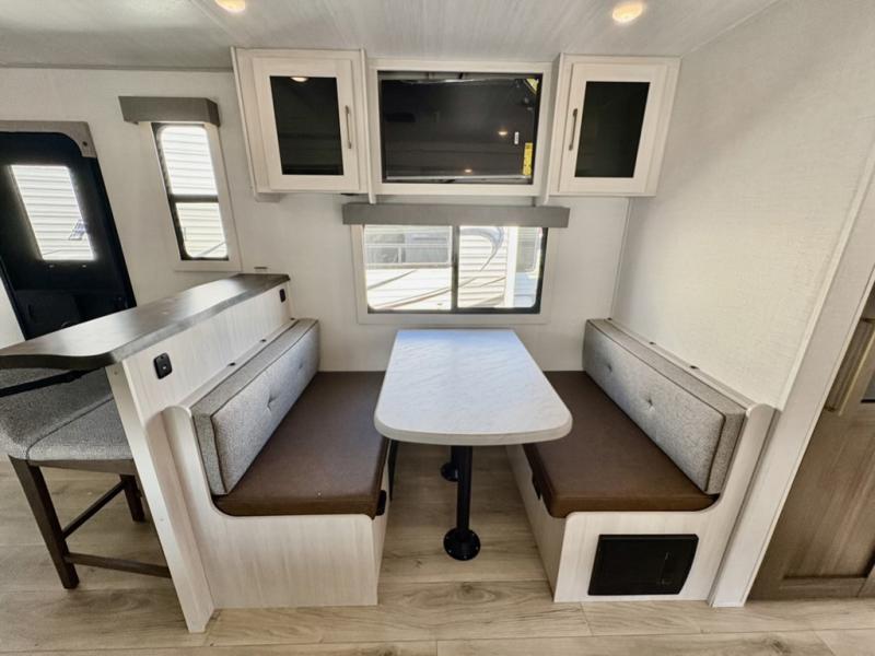 Fun at the campground begins in this spacious travel trailer for five to six! You will enjoy having your own front private bedroom with a queen bed, while your guests sleep on the EZ-out sofa and booth dinette in the main living area. Breakfast can be made in the full kitchen on the residential range or outside on the exterior kitchen. There is ample storage space throughout this model, including dual bedroom wardrobes, overhead cabinets, a bath linen closet, and a walk-in pantry.