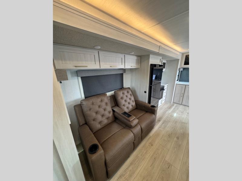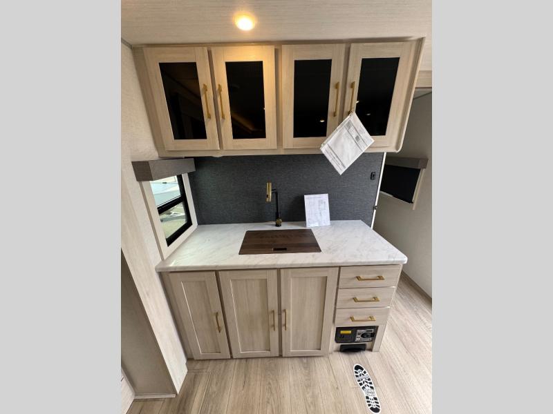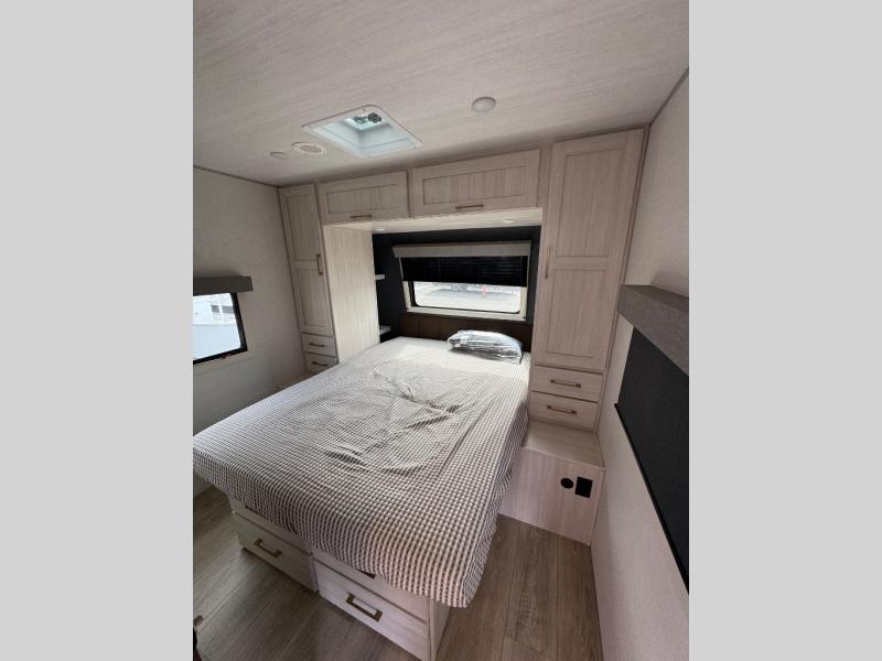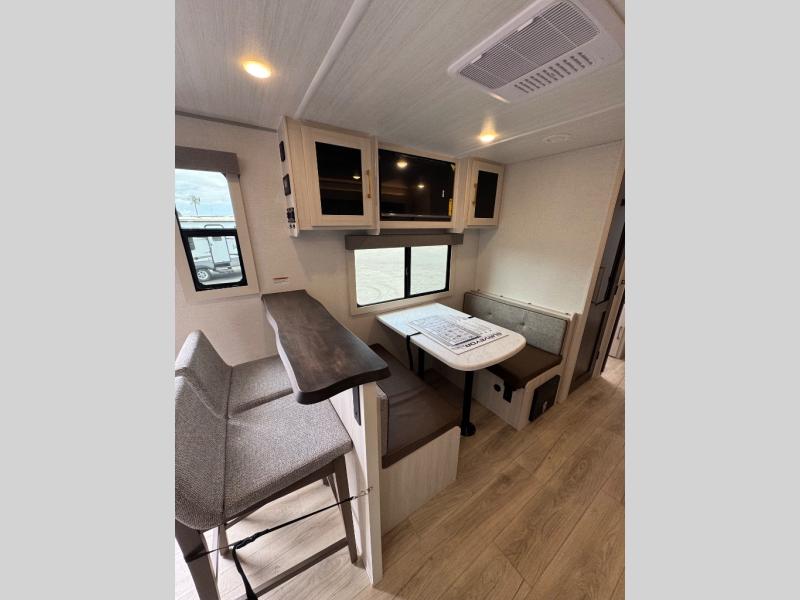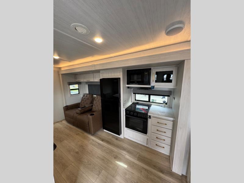 Fun at the campground begins in this spacious travel trailer for five to six! You will enjoy having your own front private bedroom with a queen bed, while your guests sleep on the EZ-out sofa and booth dinette in the main living area. Breakfast can be made in the full kitchen on the residential range or outside on the exterior kitchen. There is ample storage space throughout this model, including dual bedroom wardrobes, overhead cabinets, a bath linen closet, and a walk-in pantry.