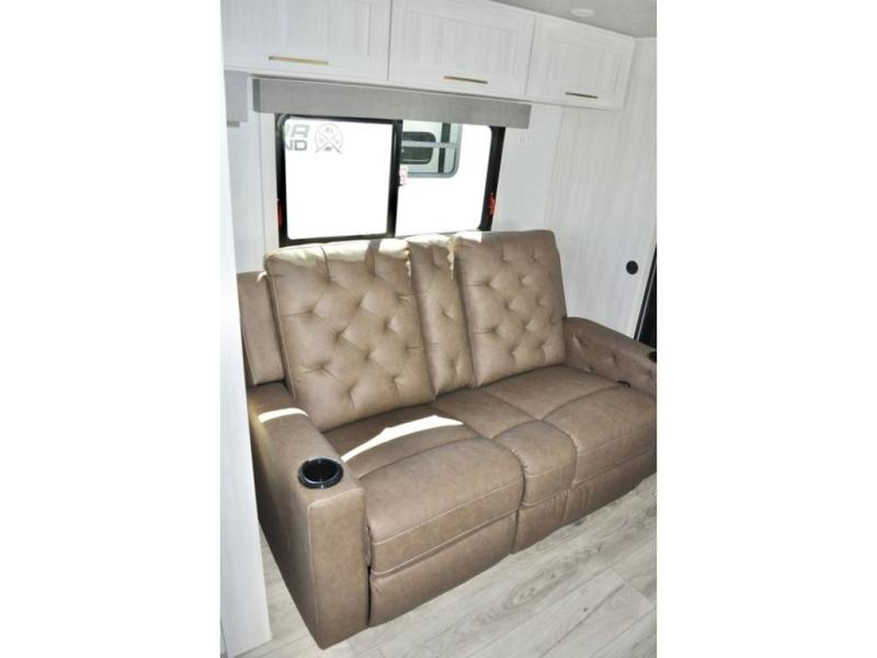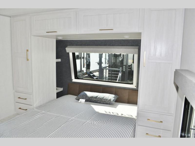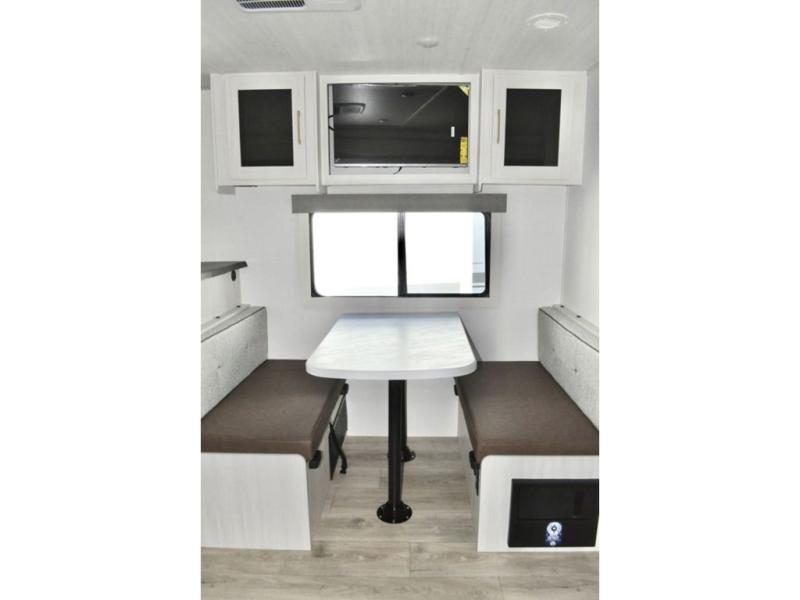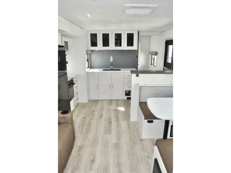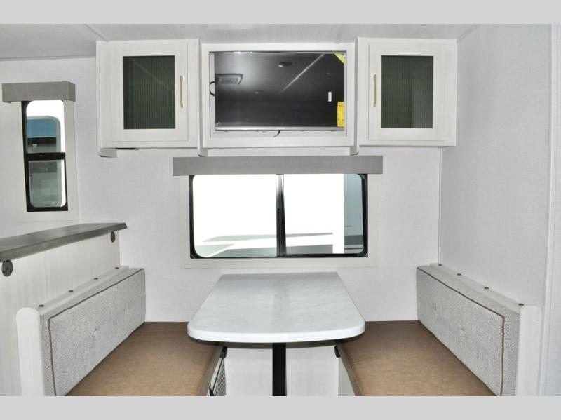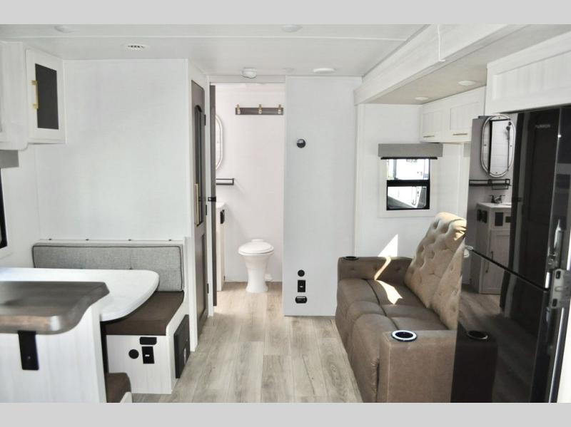 Fun at the campground begins in this spacious travel trailer for five to six! You will enjoy having your own front private bedroom with a queen bed, while your guests sleep on the EZ-out sofa and booth dinette in the main living area. Breakfast can be made in the full kitchen on the residential range or outside on the exterior kitchen. There is ample storage space throughout this model, including dual bedroom wardrobes, overhead cabinets, a bath linen closet, and a walk-in pantry.