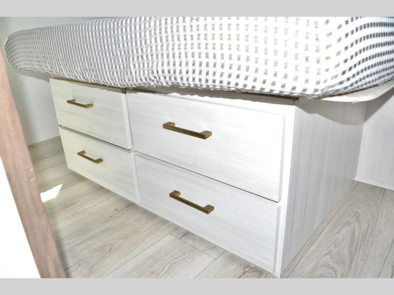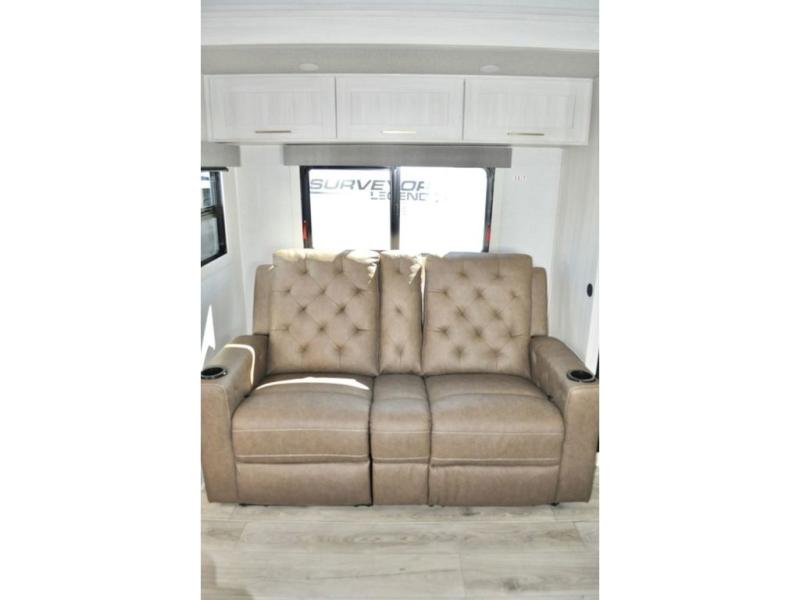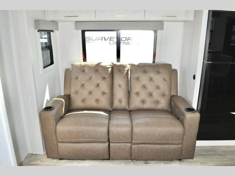 With any Surveyor Legend travel trailer by Forest River you will enjoy quality craftsmanship, convenient amenities, and at-home comforts. The Azdel composite walls provide a longer-lasting trailer, and the power tongue jack with a hitch light will get you back on the road in no-time. There are also Goodyear tires and a tire pressure monitoring system for hassle-free towing. Each model includes the Surveyor Legend Package that comes standard with oversized dinette storage access doors, front slam latch baggage doors, plus an automotive style tinted front windshield. You'll appreciate camping with a tankless water heater for endless hot showers, a 2" accessory hitch to bring bikes along, plus carpet-free interiors and a central vacuum system for easy clean up.
