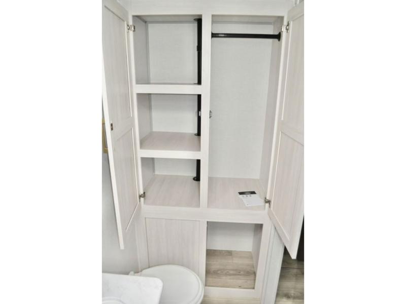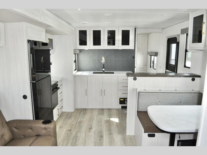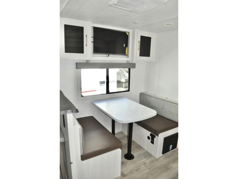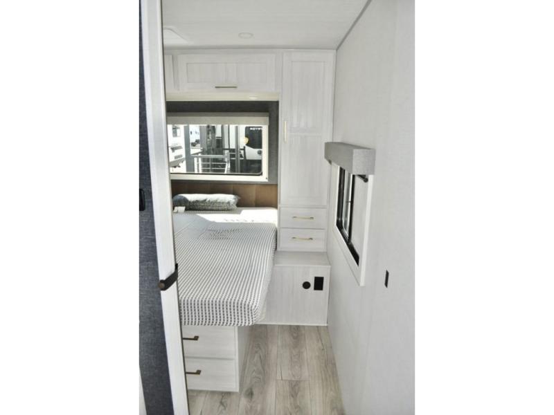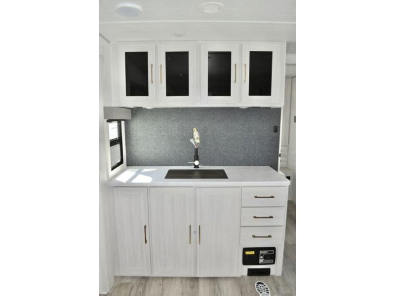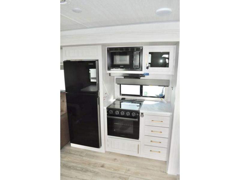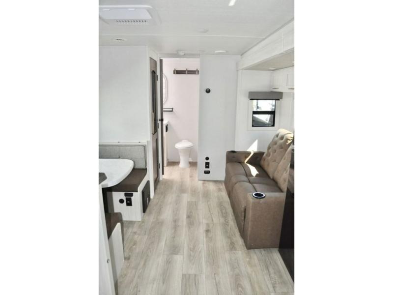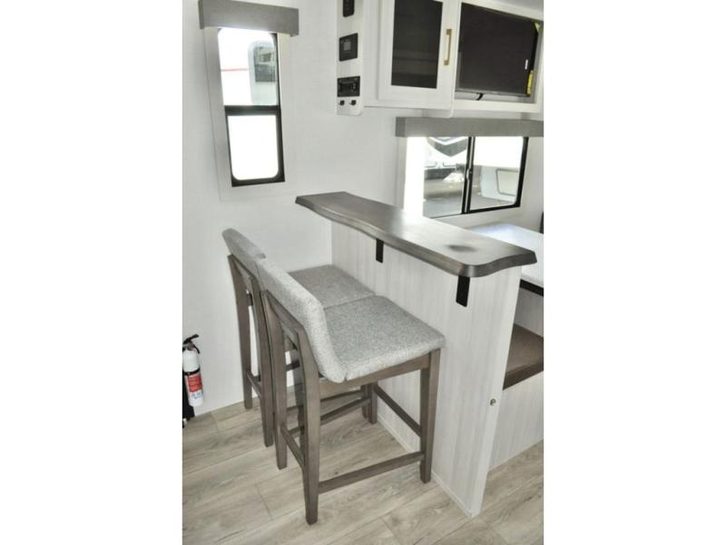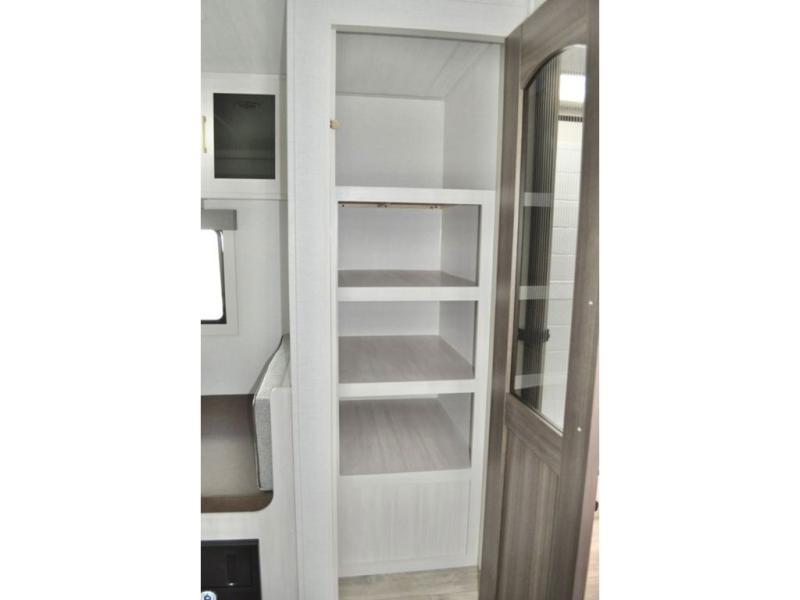 Fun at the campground begins in this spacious travel trailer for five to six! You will enjoy having your own front private bedroom with a queen bed, while your guests sleep on the EZ-out sofa and booth dinette in the main living area. Breakfast can be made in the full kitchen on the residential range or outside on the exterior kitchen. There is ample storage space throughout this model, including dual bedroom wardrobes, overhead cabinets, a bath linen closet, and a walk-in pantry.