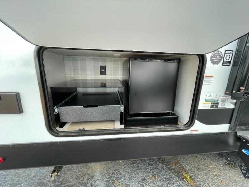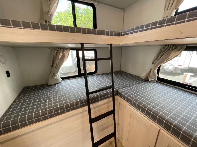 This spacious travel trailer is perfect for those who need plenty of sleeping space! There are four bunks in the bunkhouse for little ones or your friends, and the front master bedroom will feel just like home with its queen-size bed and dual drawers. You'll find a EZ-out sofa and booth dinette within the large slide in the main living area, and there is a walk-in pantry to store food, jackets, or umbrellas. And there is washer and dryer prep in the pantry if you choose to add those appliances. Don't overlook the exterior that includes an outside kitchen, a 21' electric awning, and outside storage!