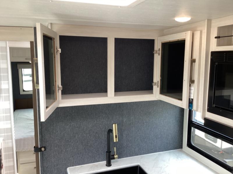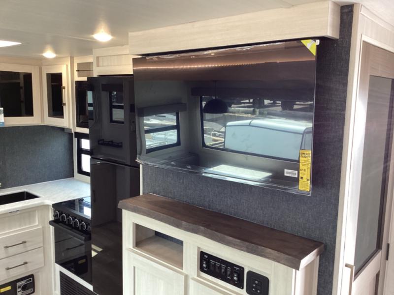 This travel trailer is perfect for larger groups or families since it can sleep up to ten people each night! There is a private bunkhouse with three bunks, a EZ-out sofa, plus storage space and a removable table! The front master bedroom is just as accommodating with its dual bedroom wardrobes, overhead cabinets, and quick access to the walk-through bath. The main living are will be a favorite hangout spot with a tri-fold sofa, a booth dinette, and an HD TV for movies. And a walk-in pantry with washer and dryer prep gives you the option to add these appliances. The chef of your group can cook meals in the fully-equipped kitchen, or head outdoors to cook on the outside kitchen. There is also a 21' electric awning here with LED lights for an inviting outdoor living space.