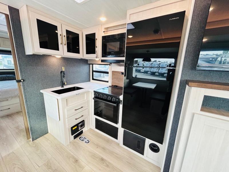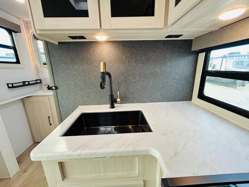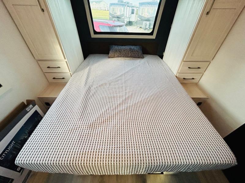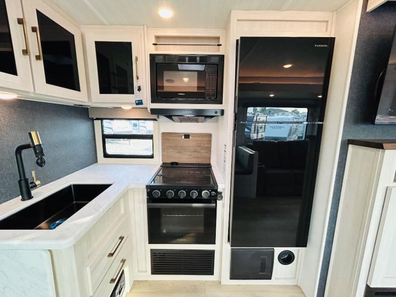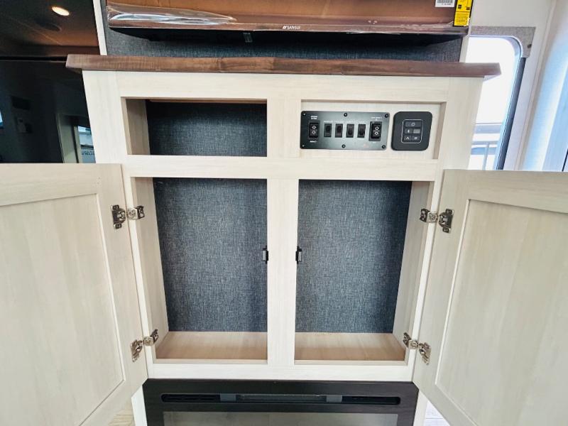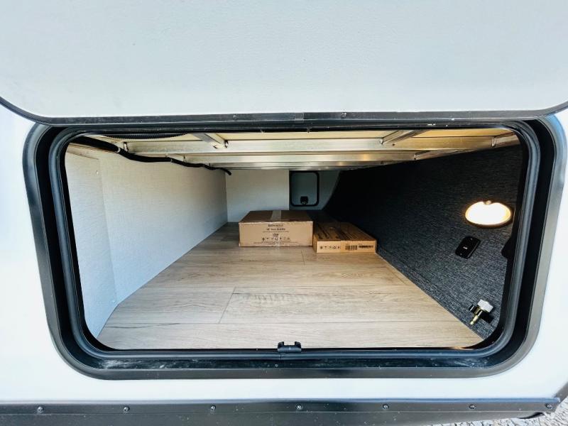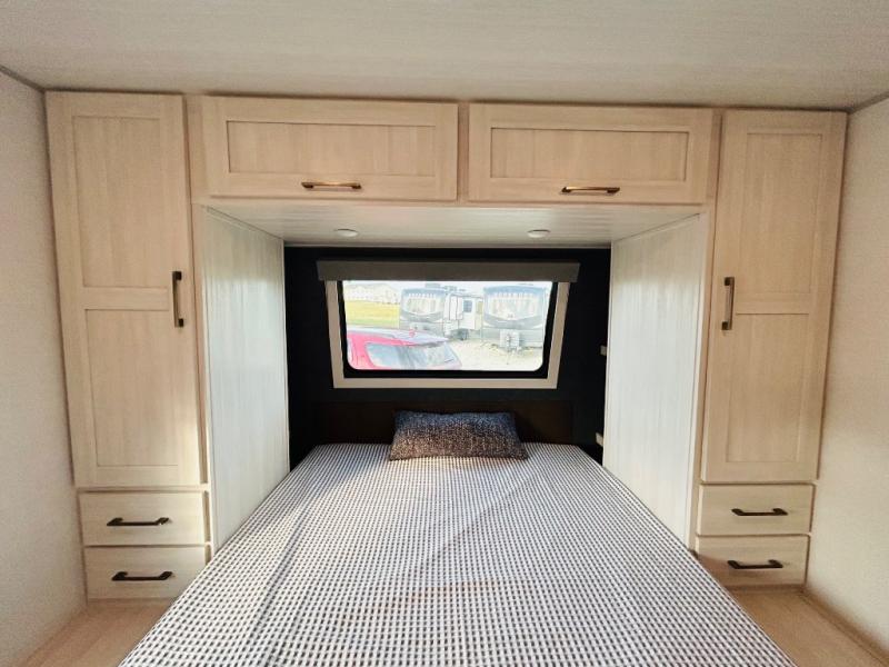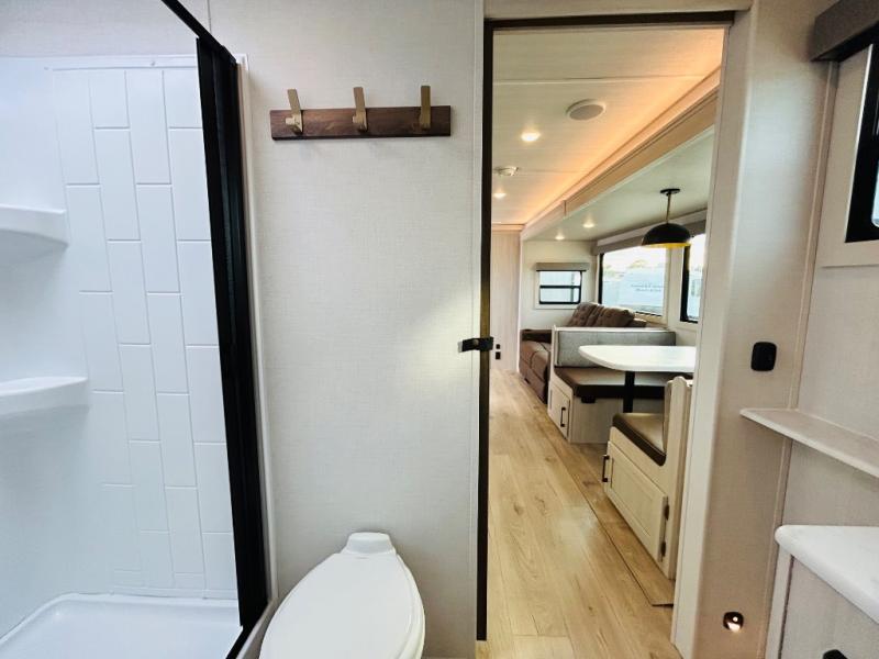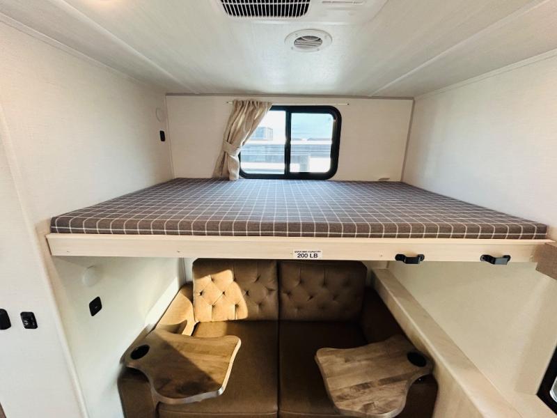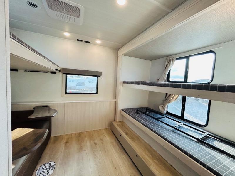 This travel trailer is perfect for larger groups or families since it can sleep up to ten people each night! There is a private bunkhouse with three bunks, a EZ-out sofa, plus storage space and a removable table! The front master bedroom is just as accommodating with its dual bedroom wardrobes, overhead cabinets, and quick access to the walk-through bath. The main living are will be a favorite hangout spot with a tri-fold sofa, a booth dinette, and an HD TV for movies. And a walk-in pantry with washer and dryer prep gives you the option to add these appliances. The chef of your group can cook meals in the fully-equipped kitchen, or head outdoors to cook on the outside kitchen. There is also a 21' electric awning here with LED lights for an inviting outdoor living space.