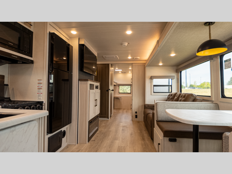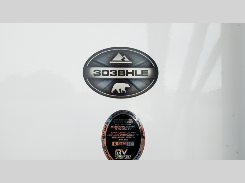 Q: Want a family-friendly bunkhouse trailer built for Michigan seasons? A: The 303BHLE delivers sleeping for up to eight, two bathrooms, theater seating, and full outdoor kitchen in under 38 ft—perfect for family weekends or extended stays.