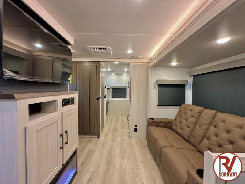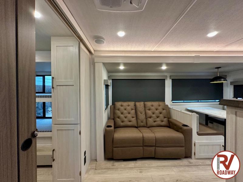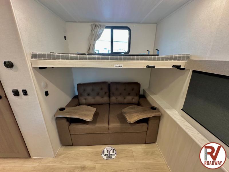 This travel trailer is perfect for larger groups or families since it can sleep up to ten people each night! There is a private bunkhouse with three bunks, a EZ-out sofa, plus storage space and a removable table! The front master bedroom is just as accommodating with its dual bedroom wardrobes, overhead cabinets, and quick access to the walk-through bath. The main living are will be a favorite hangout spot with a tri-fold sofa, a booth dinette, and an HD TV for movies. And a walk-in pantry with washer and dryer prep gives you the option to add these appliances. The chef of your group can cook meals in the fully-equipped kitchen, or head outdoors to cook on the outside kitchen. There is also a 21' electric awning here with LED lights for an inviting outdoor living space.