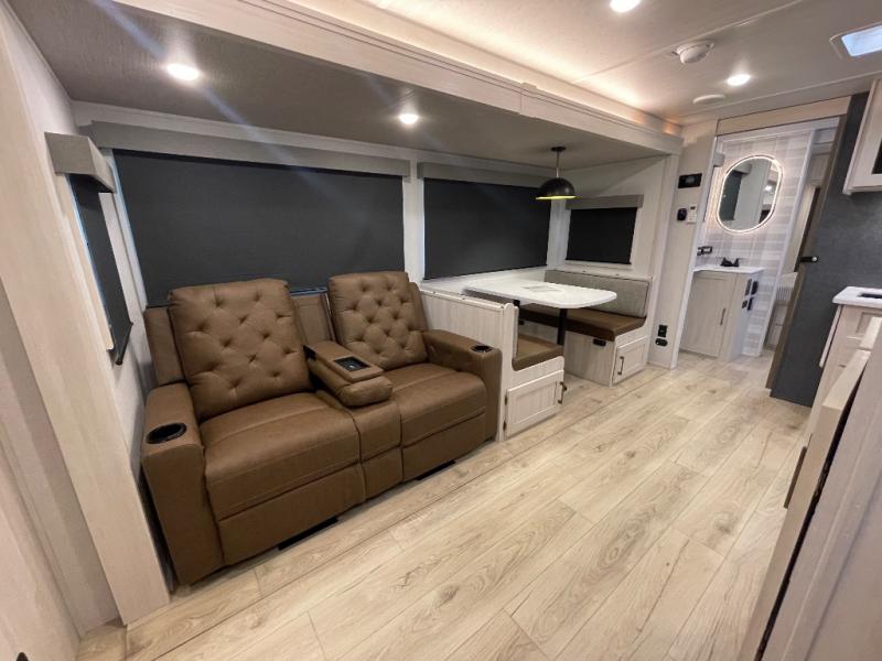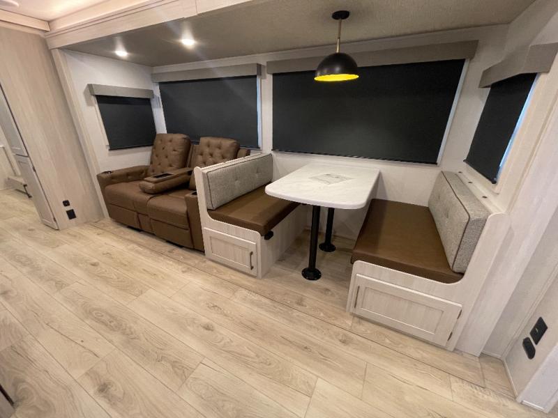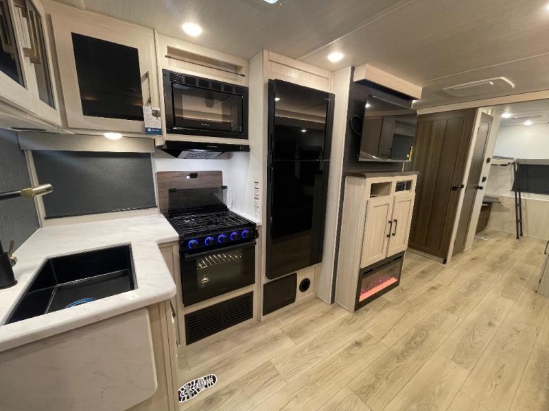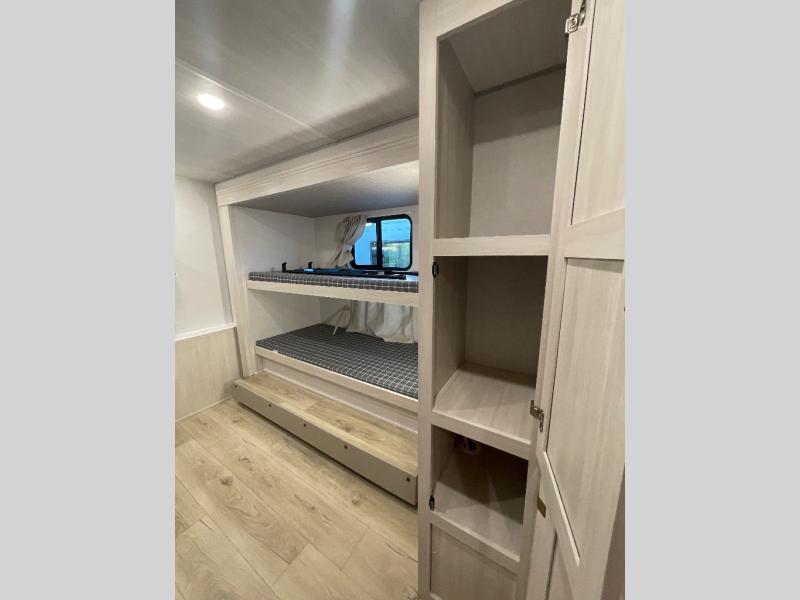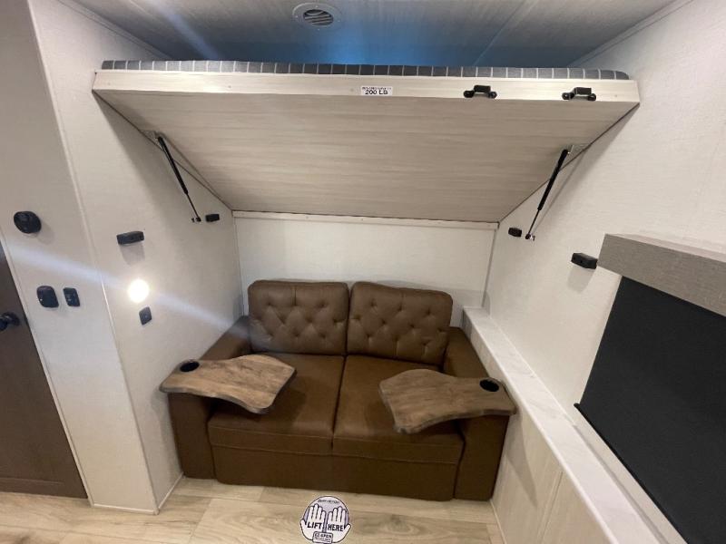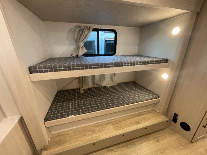 This travel trailer is perfect for larger groups or families since it can sleep up to ten people each night! There is a private bunkhouse with three bunks, a EZ-out sofa, plus storage space and a removable table! The front master bedroom is just as accommodating with its dual bedroom wardrobes, overhead cabinets, and quick access to the walk-through bath. The main living are will be a favorite hangout spot with a tri-fold sofa, a booth dinette, and an HD TV for movies. And a walk-in pantry with washer and dryer prep gives you the option to add these appliances. The chef of your group can cook meals in the fully-equipped kitchen, or head outdoors to cook on the outside kitchen. There is also a 21' electric awning here with LED lights for an inviting outdoor living space.