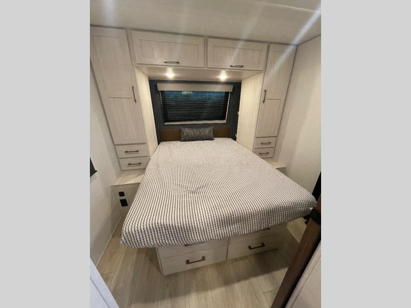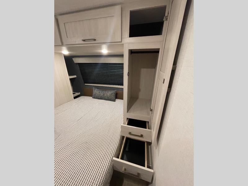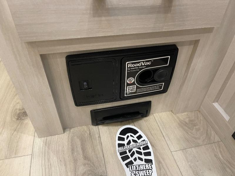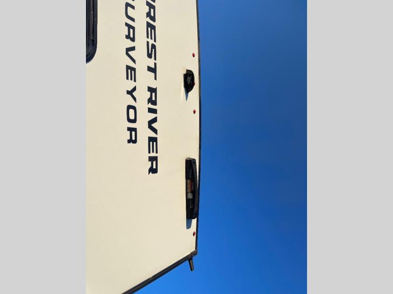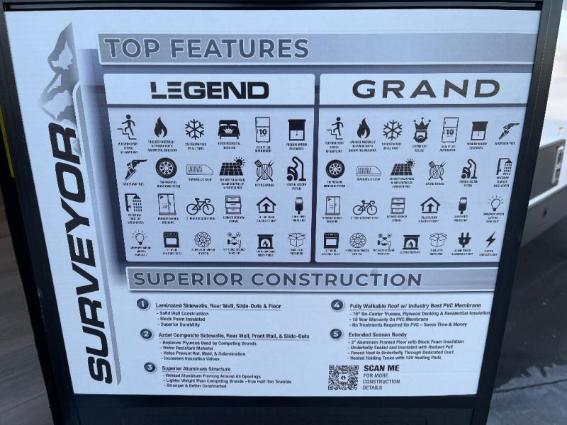 With any Surveyor Legend travel trailer by Forest River you will enjoy quality craftsmanship, convenient amenities, and at-home comforts. The Azdel composite walls provide a longer-lasting trailer, and the power tongue jack with a hitch light will get you back on the road in no-time. There are also Goodyear tires and a tire pressure monitoring system for hassle-free towing. Each model includes the Surveyor Legend Package that comes standard with oversized dinette storage access doors, front slam latch baggage doors, plus an automotive style tinted front windshield. You'll appreciate camping with a tankless water heater for endless hot showers, a 2" accessory hitch to bring bikes along, plus carpet-free interiors and a central vacuum system for easy clean up.