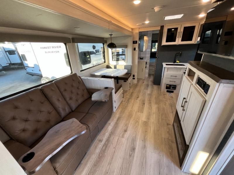 With any Surveyor Legend travel trailer by Forest River you will enjoy quality craftsmanship, convenient amenities, and at-home comforts. The Azdel composite walls provide a longer-lasting trailer, and the power tongue jack with a hitch light will get you back on the road in no-time. There are also Goodyear tires and a tire pressure monitoring system for hassle-free towing. Each model includes the Surveyor Legend Package that comes standard with oversized dinette storage access doors, front slam latch baggage doors, plus an automotive style tinted front windshield. You'll appreciate camping with a tankless water heater for endless hot showers, a 2" accessory hitch to bring bikes along, plus carpet-free interiors and a central vacuum system for easy clean up.