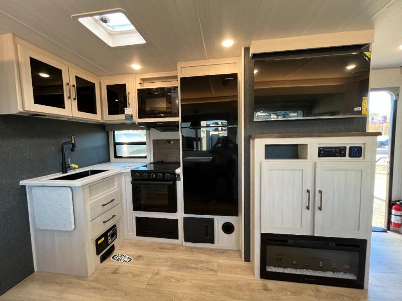 This travel trailer is perfect for larger groups or families since it can sleep up to ten people each night! There is a private bunkhouse with three bunks, a EZ-out sofa, plus storage space and a removable table! The front master bedroom is just as accommodating with its dual bedroom wardrobes, overhead cabinets, and quick access to the walk-through bath. The main living are will be a favorite hangout spot with a tri-fold sofa, a booth dinette, and an HD TV for movies. And a walk-in pantry with washer and dryer prep gives you the option to add these appliances. The chef of your group can cook meals in the fully-equipped kitchen, or head outdoors to cook on the outside kitchen. There is also a 21' electric awning here with LED lights for an inviting outdoor living space.