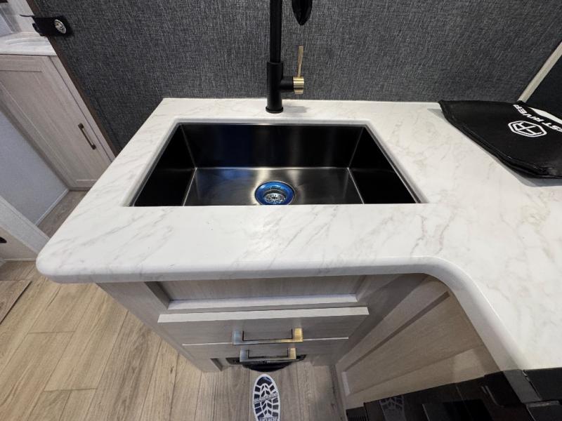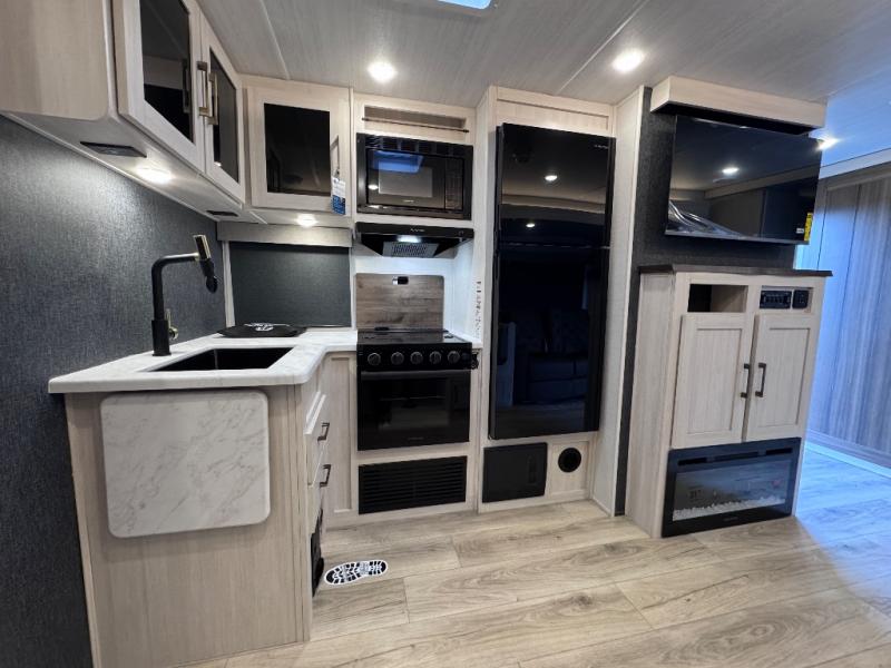 This travel trailer is perfect for larger groups or families since it can sleep up to ten people each night! There is a private bunkhouse with three bunks, a EZ-out sofa, plus storage space and a removable table! The front master bedroom is just as accommodating with its dual bedroom wardrobes, overhead cabinets, and quick access to the walk-through bath. The main living are will be a favorite hangout spot with a tri-fold sofa, a booth dinette, and an HD TV for movies. And a walk-in pantry with washer and dryer prep gives you the option to add these appliances. The chef of your group can cook meals in the fully-equipped kitchen, or head outdoors to cook on the outside kitchen. There is also a 21' electric awning here with LED lights for an inviting outdoor living space.