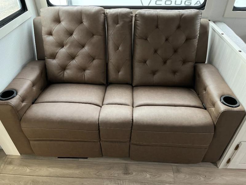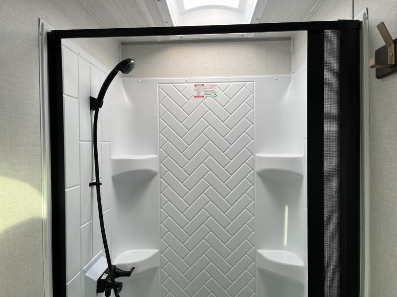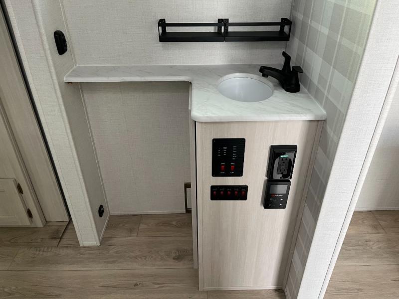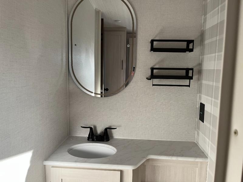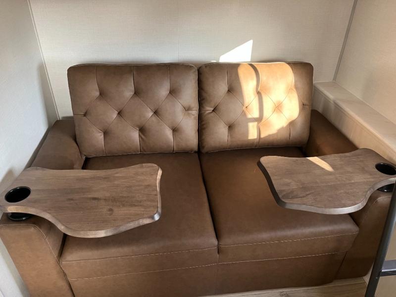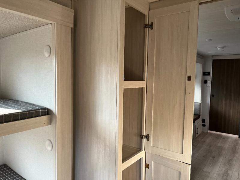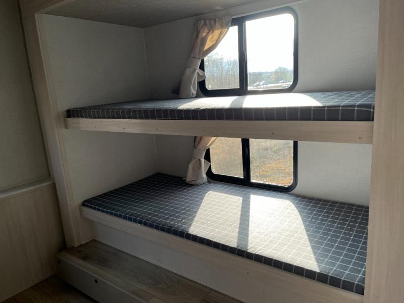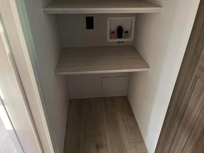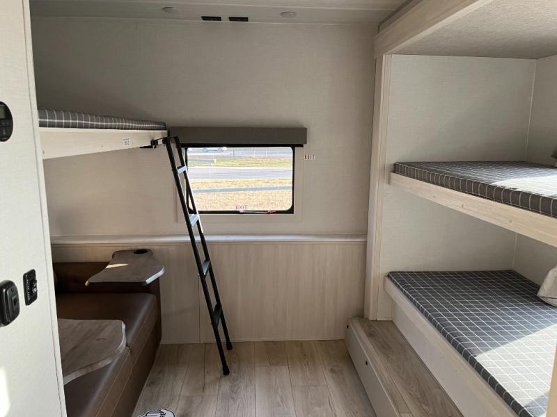 This travel trailer is perfect for larger groups or families since it can sleep up to ten people each night! There is a private bunkhouse with three bunks, a EZ-out sofa, plus storage space and a removable table! The front master bedroom is just as accommodating with its dual bedroom wardrobes, overhead cabinets, and quick access to the walk-through bath. The main living are will be a favorite hangout spot with a tri-fold sofa, a booth dinette, and an HD TV for movies. And a walk-in pantry with washer and dryer prep gives you the option to add these appliances. The chef of your group can cook meals in the fully-equipped kitchen, or head outdoors to cook on the outside kitchen. There is also a 21' electric awning here with LED lights for an inviting outdoor living space.