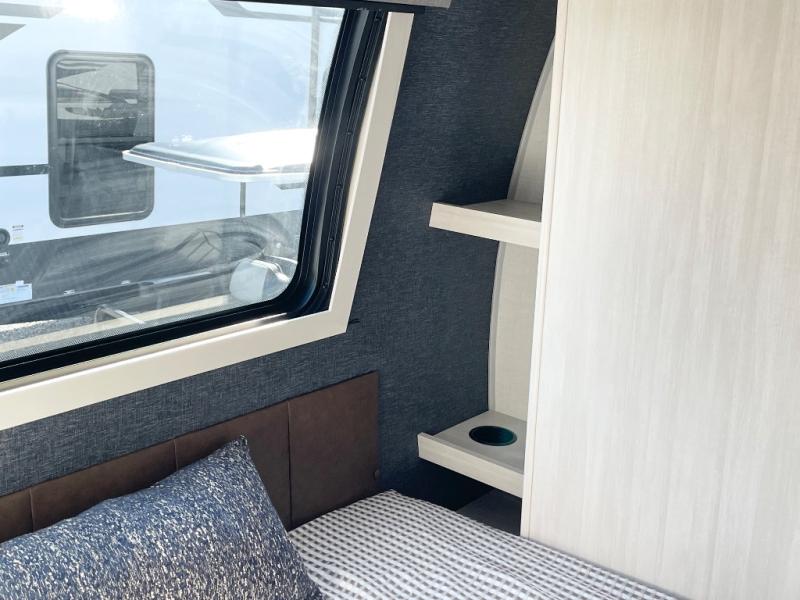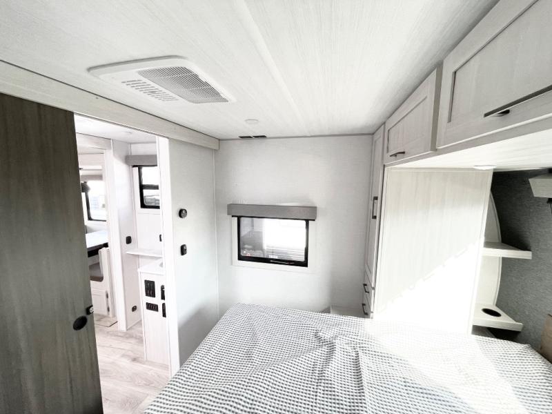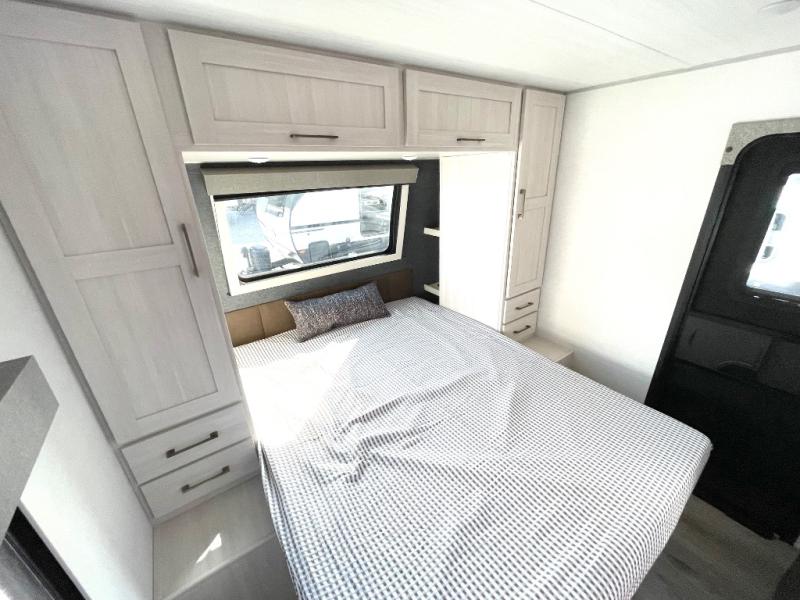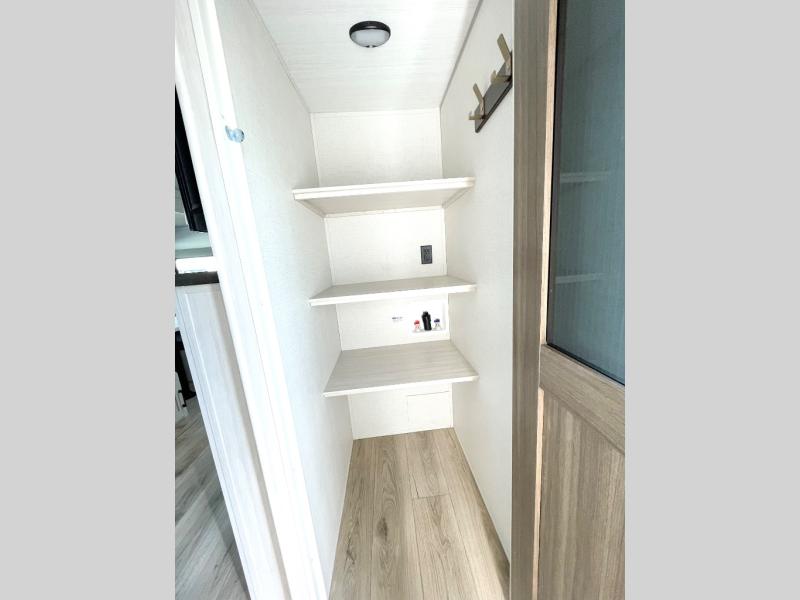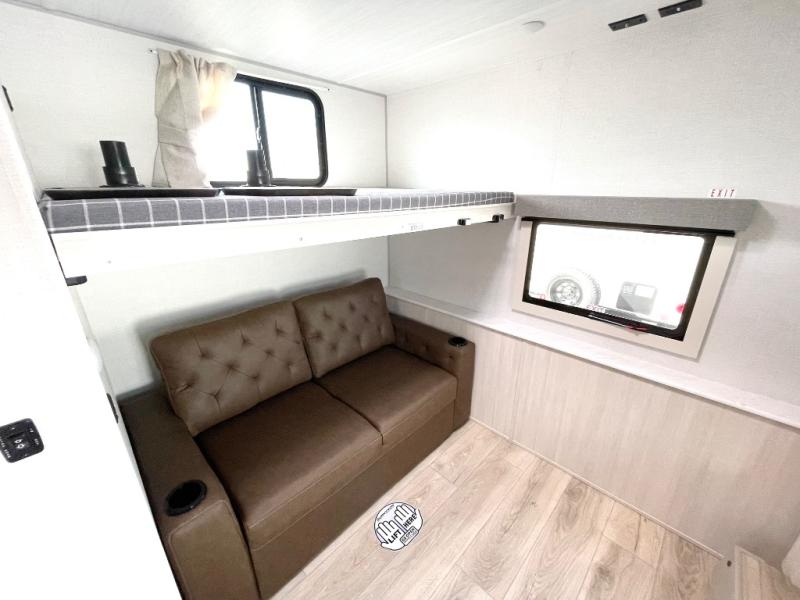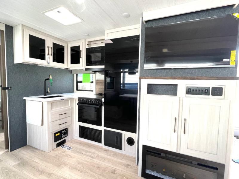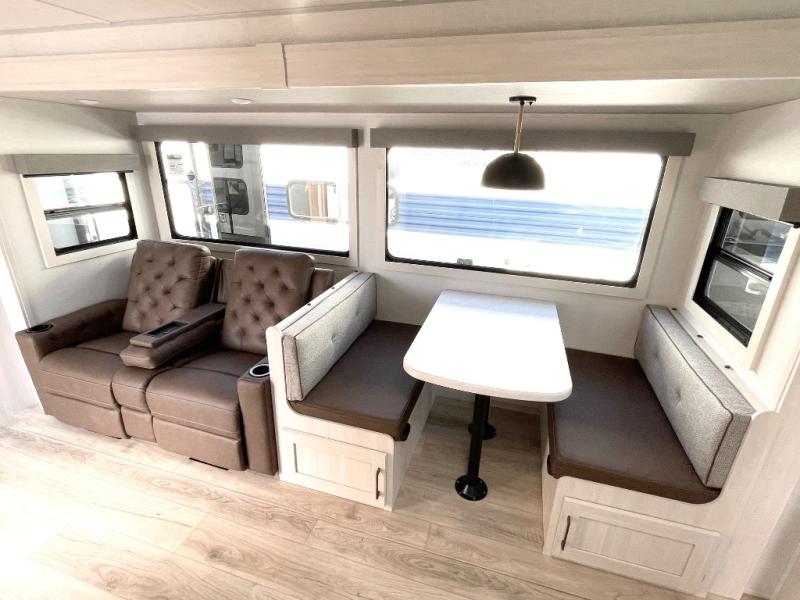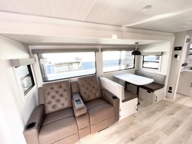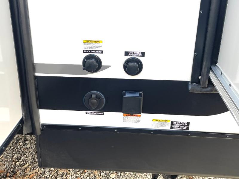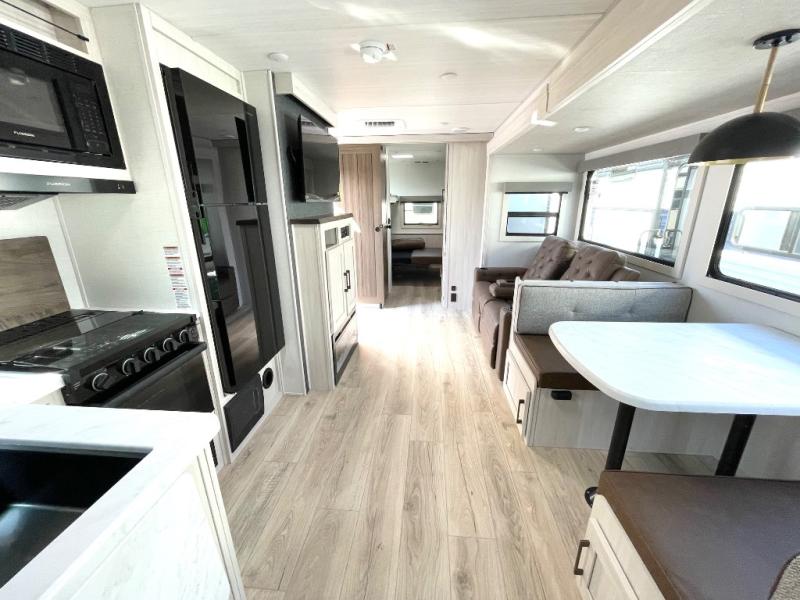 This travel trailer is perfect for larger groups or families since it can sleep up to ten people each night! There is a private bunkhouse with three bunks, a EZ-out sofa, plus storage space and a removable table! The front master bedroom is just as accommodating with its dual bedroom wardrobes, overhead cabinets, and quick access to the walk-through bath. The main living are will be a favorite hangout spot with a tri-fold sofa, a booth dinette, and an HD TV for movies. And a walk-in pantry with washer and dryer prep gives you the option to add these appliances. The chef of your group can cook meals in the fully-equipped kitchen, or head outdoors to cook on the outside kitchen. There is also a 21' electric awning here with LED lights for an inviting outdoor living space.