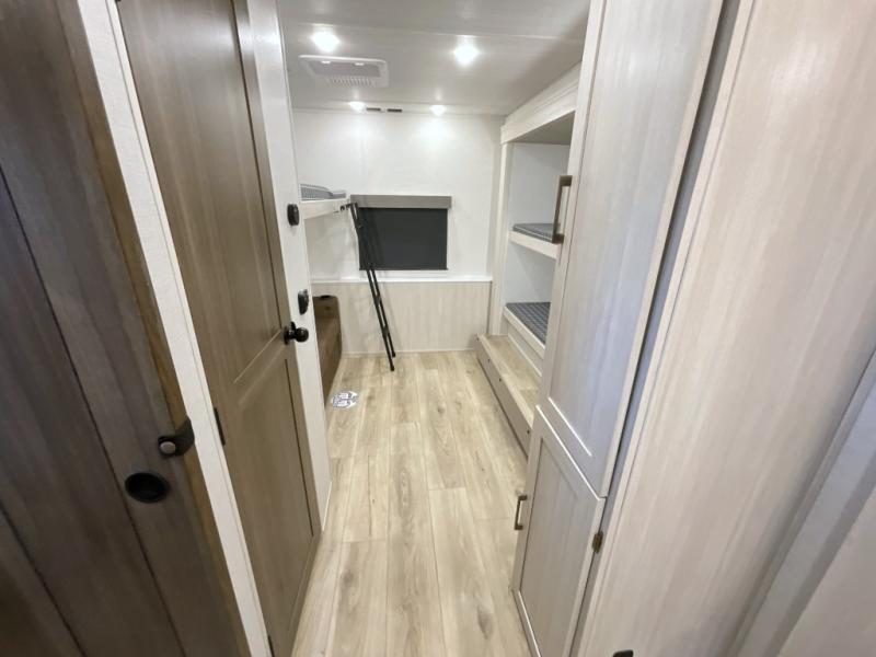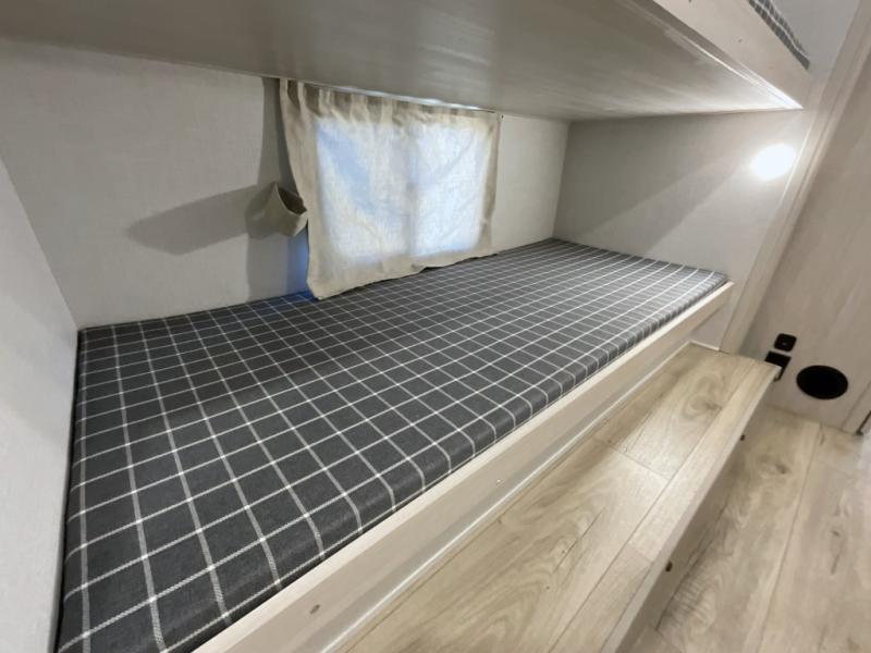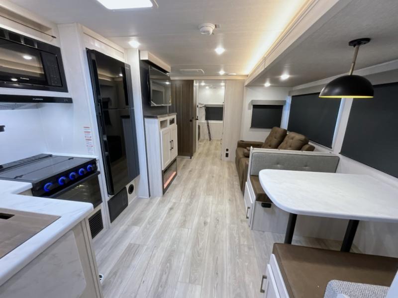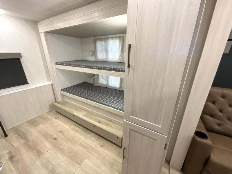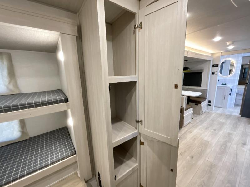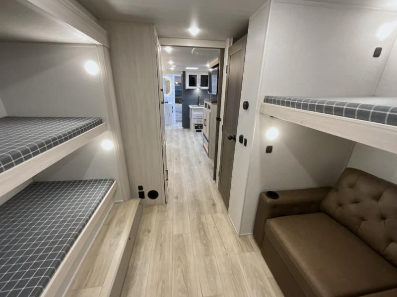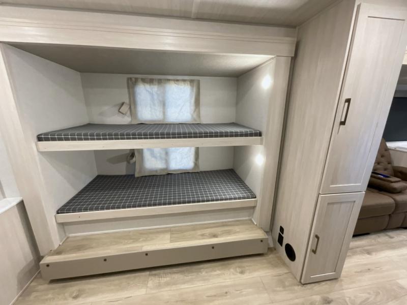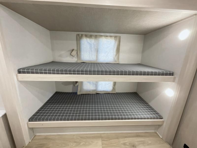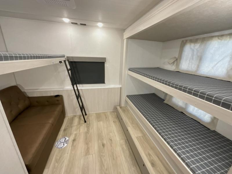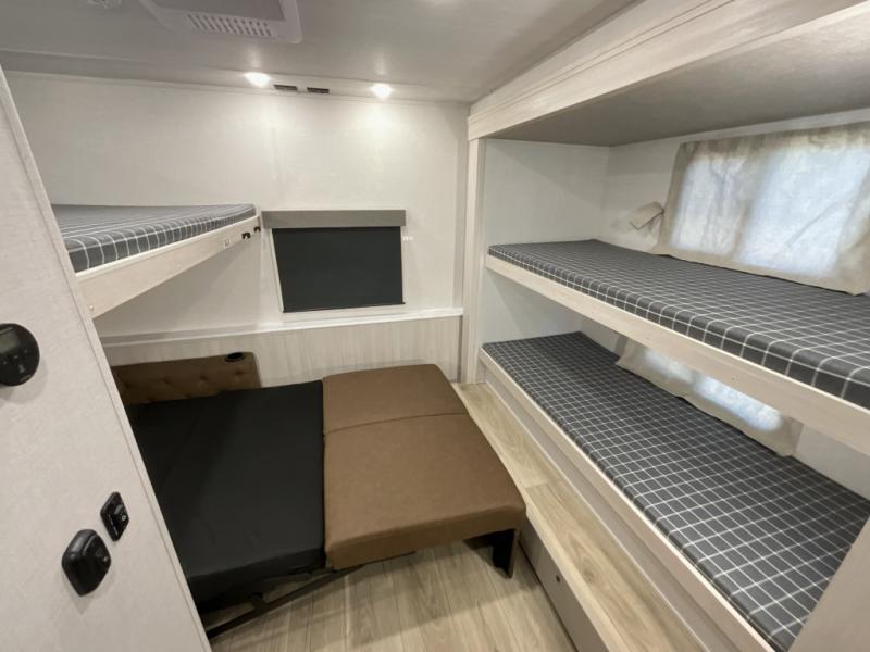 This travel trailer is perfect for larger groups or families since it can sleep up to ten people each night! There is a private bunkhouse with three bunks, a EZ-out sofa, plus storage space and a removable table! The front master bedroom is just as accommodating with its dual bedroom wardrobes, overhead cabinets, and quick access to the walk-through bath. The main living are will be a favorite hangout spot with a tri-fold sofa, a booth dinette, and an HD TV for movies. And a walk-in pantry with washer and dryer prep gives you the option to add these appliances. The chef of your group can cook meals in the fully-equipped kitchen, or head outdoors to cook on the outside kitchen. There is also a 21' electric awning here with LED lights for an inviting outdoor living space.
