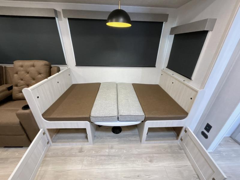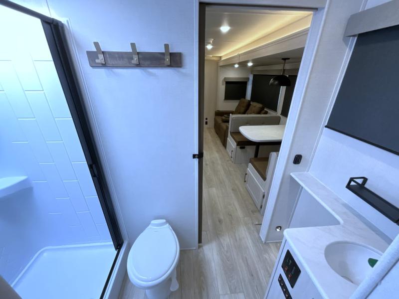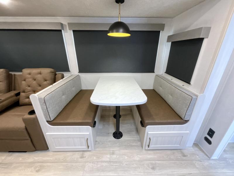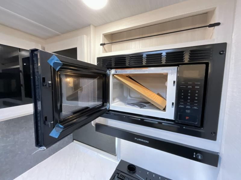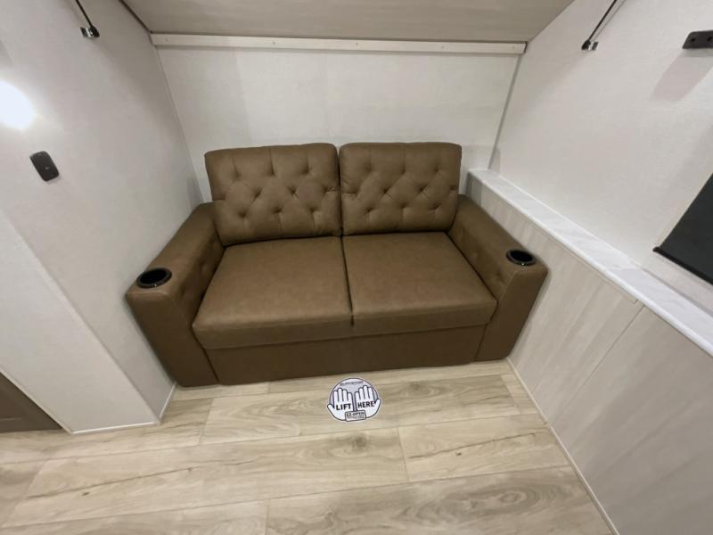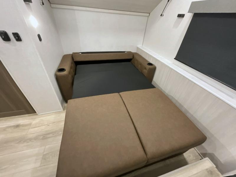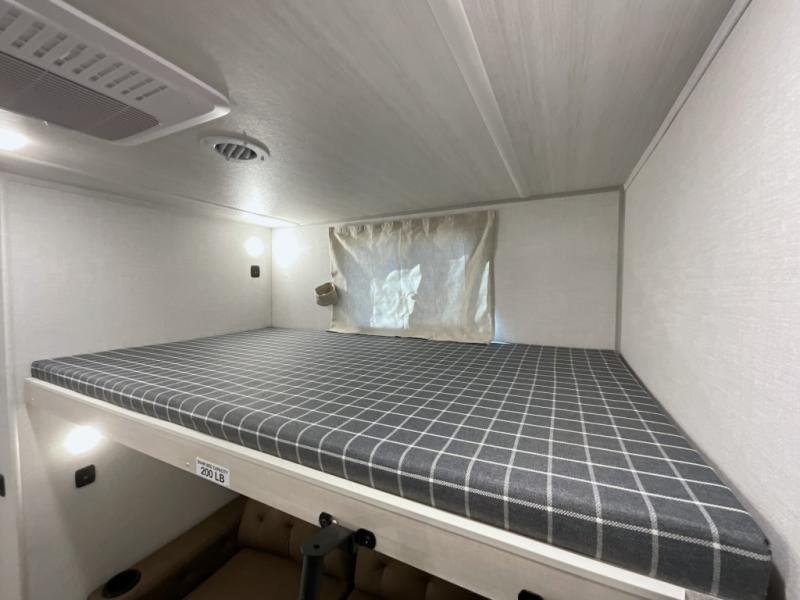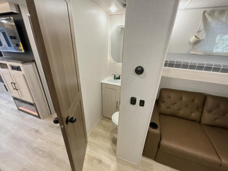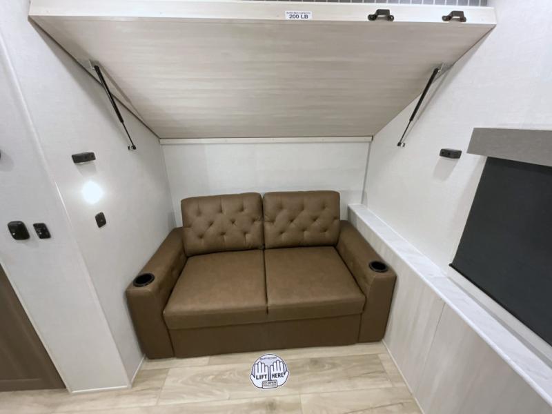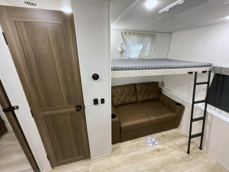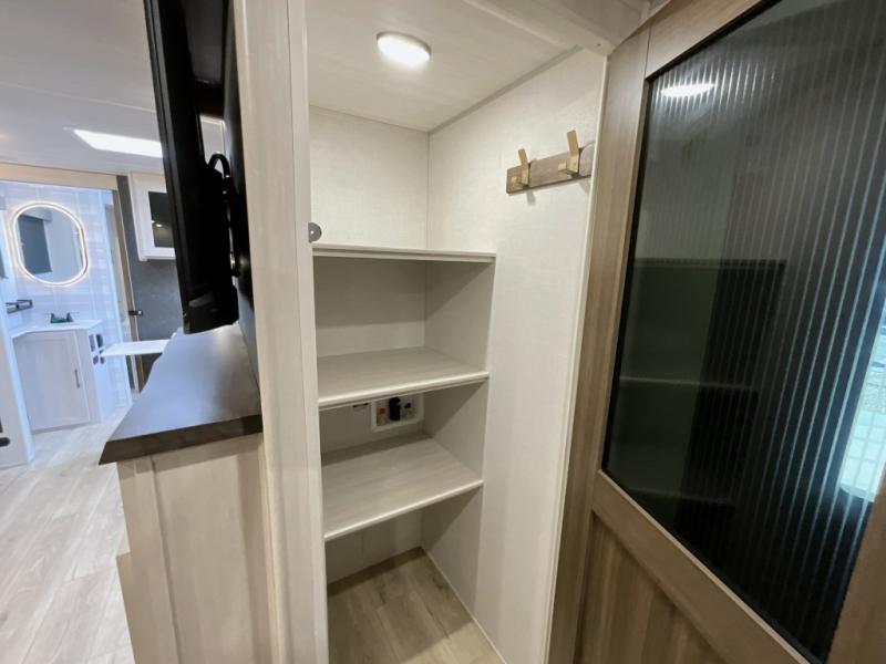 This travel trailer is perfect for larger groups or families since it can sleep up to ten people each night! There is a private bunkhouse with three bunks, a EZ-out sofa, plus storage space and a removable table! The front master bedroom is just as accommodating with its dual bedroom wardrobes, overhead cabinets, and quick access to the walk-through bath. The main living are will be a favorite hangout spot with a tri-fold sofa, a booth dinette, and an HD TV for movies. And a walk-in pantry with washer and dryer prep gives you the option to add these appliances. The chef of your group can cook meals in the fully-equipped kitchen, or head outdoors to cook on the outside kitchen. There is also a 21' electric awning here with LED lights for an inviting outdoor living space.
