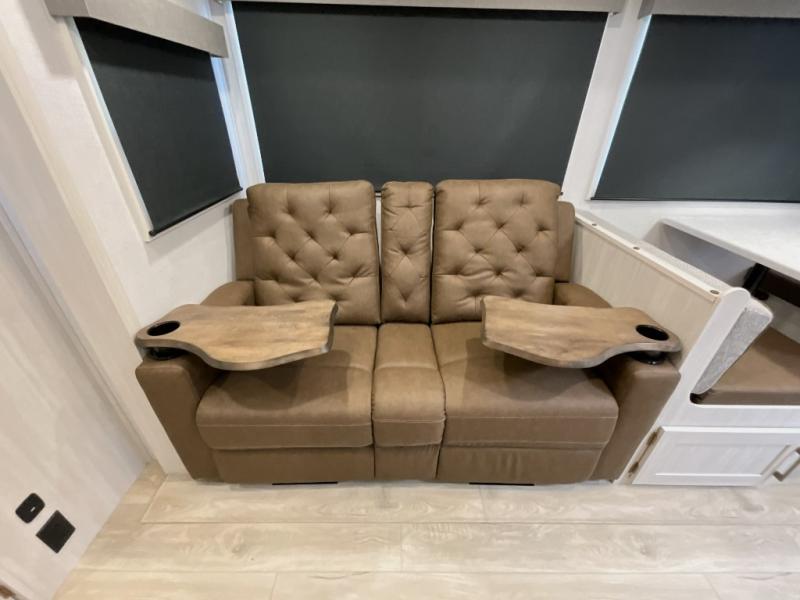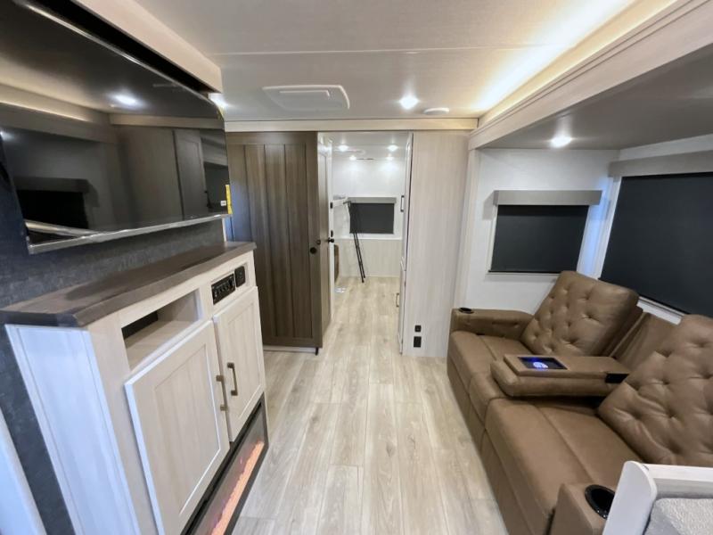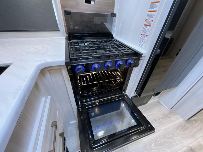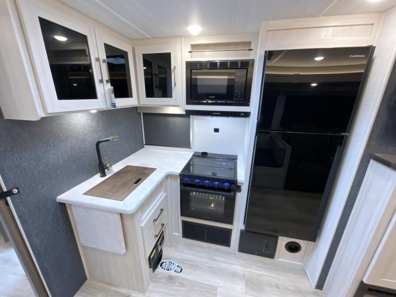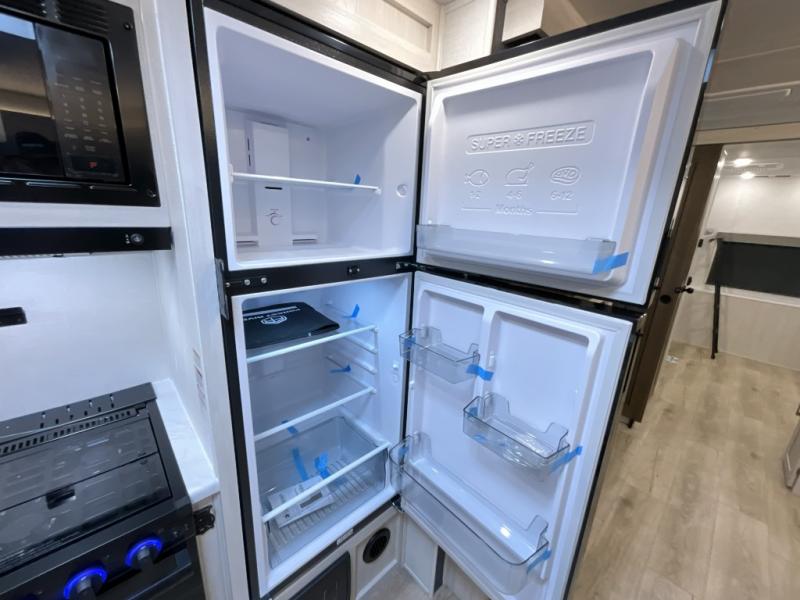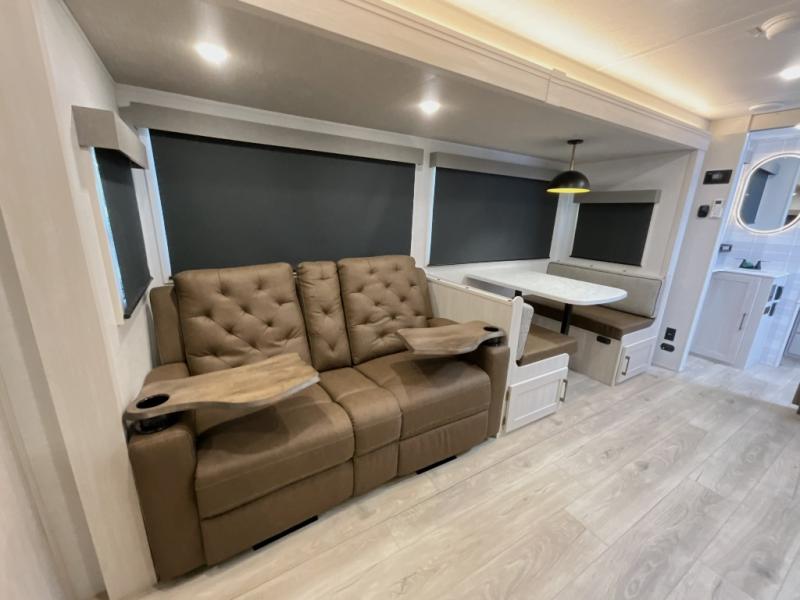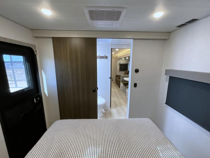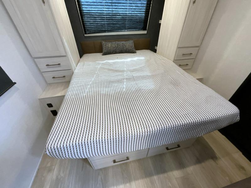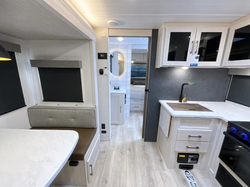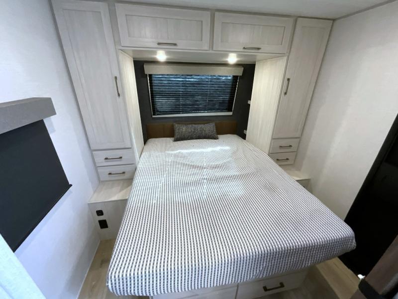 This travel trailer is perfect for larger groups or families since it can sleep up to ten people each night! There is a private bunkhouse with three bunks, a EZ-out sofa, plus storage space and a removable table! The front master bedroom is just as accommodating with its dual bedroom wardrobes, overhead cabinets, and quick access to the walk-through bath. The main living are will be a favorite hangout spot with a tri-fold sofa, a booth dinette, and an HD TV for movies. And a walk-in pantry with washer and dryer prep gives you the option to add these appliances. The chef of your group can cook meals in the fully-equipped kitchen, or head outdoors to cook on the outside kitchen. There is also a 21' electric awning here with LED lights for an inviting outdoor living space.