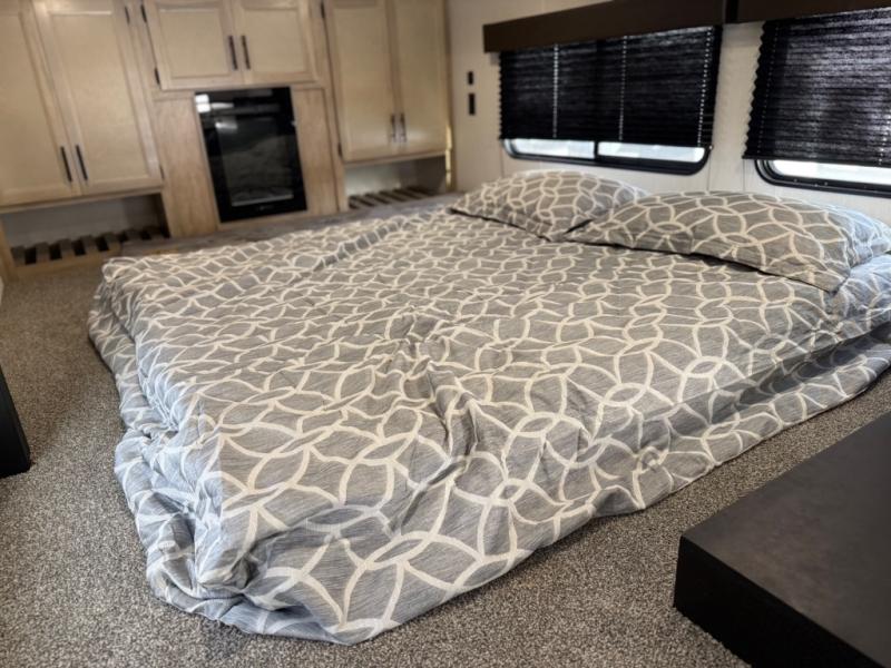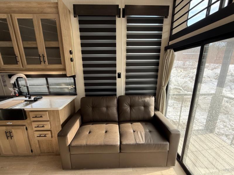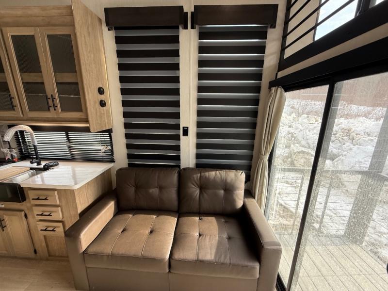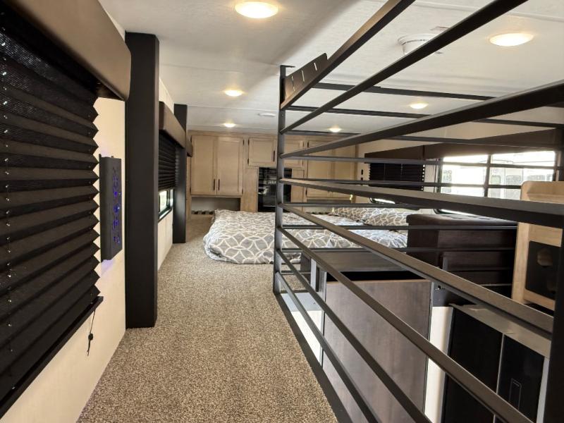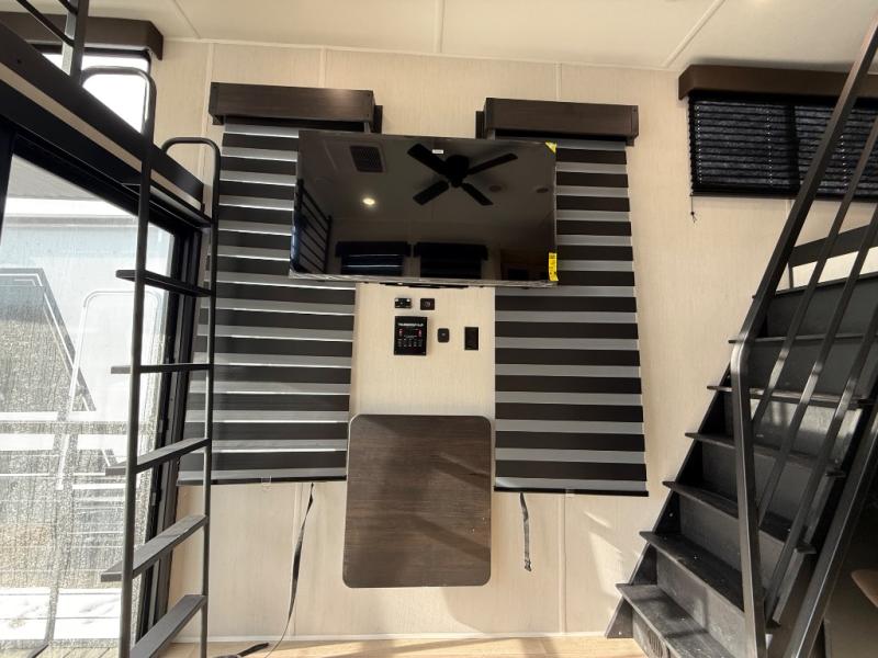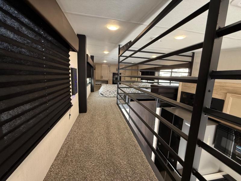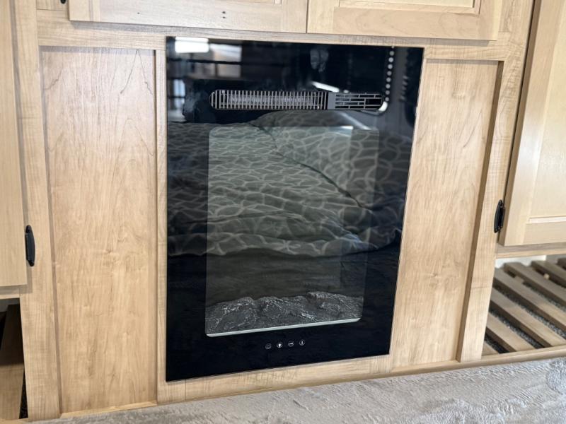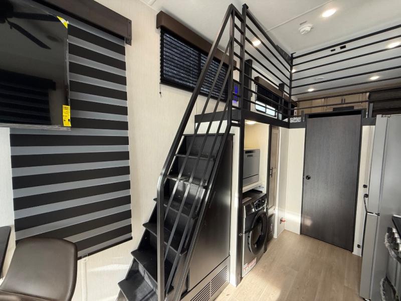 You'll feel right at home in this feature-packed destination trailer! The rear private bedroom features one of the dual entry doors, an RV king bed, and a side patio for great outdoor views! There is also a wardrobe with washer/dryer prep if you want the option to add these appliances. Above the bedroom, you'll find a loft with a queen bed, a fireplace and a storage cabinet to keep the space tidy. The chef of your group can whip up their best meals in the middle kitchen, and there is a spacious pantry to keep snacks stocked. Your crew can relax on the L-shaped sofa in the front living room, enjoy the fireplace and TV, or just take in the outdoor views provided by the huge side patio!