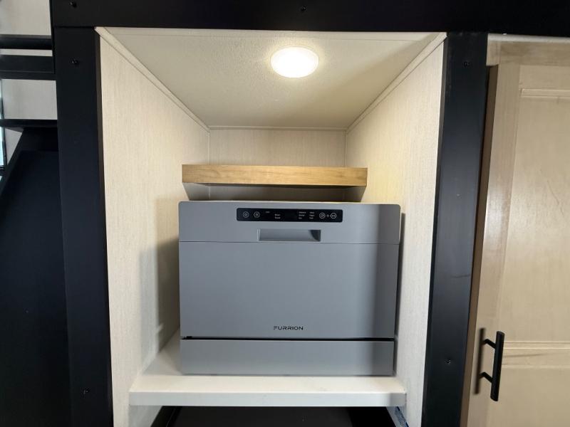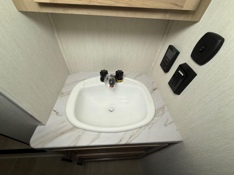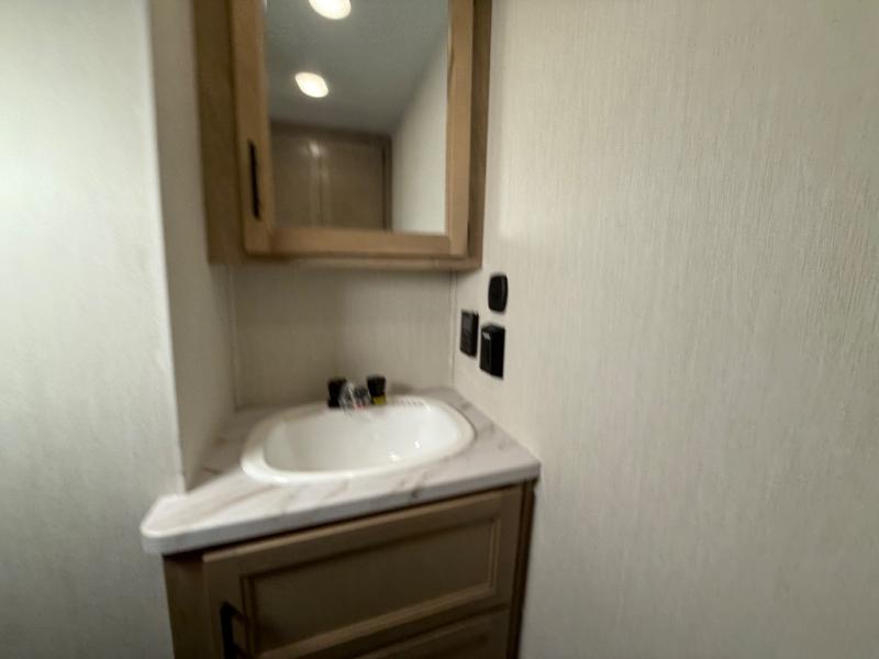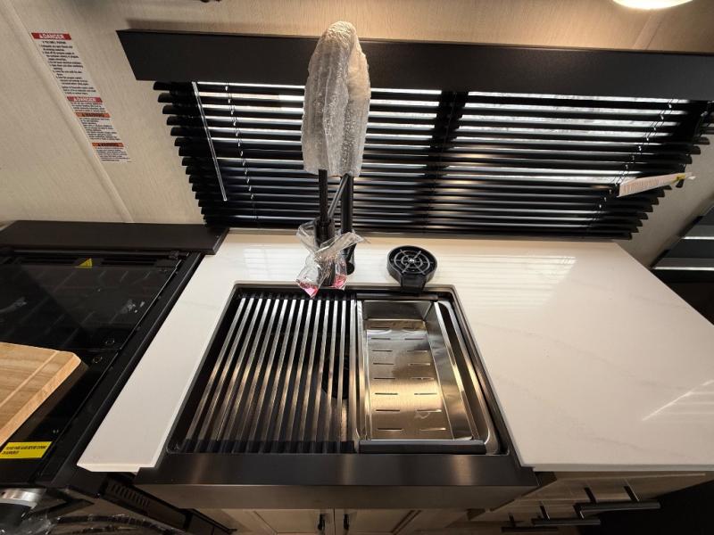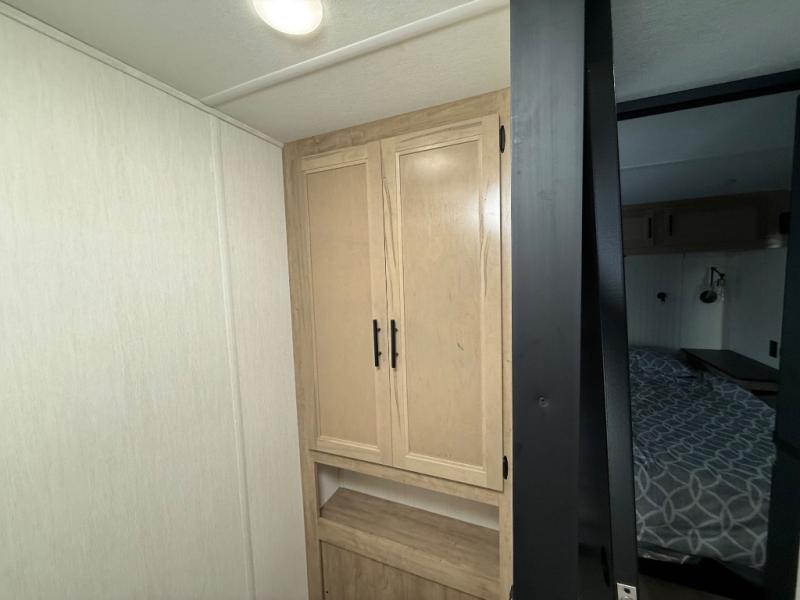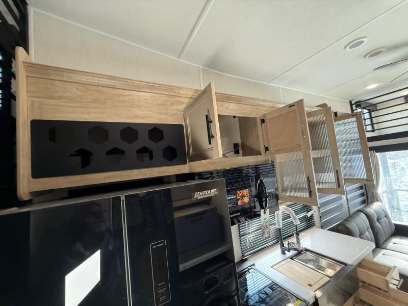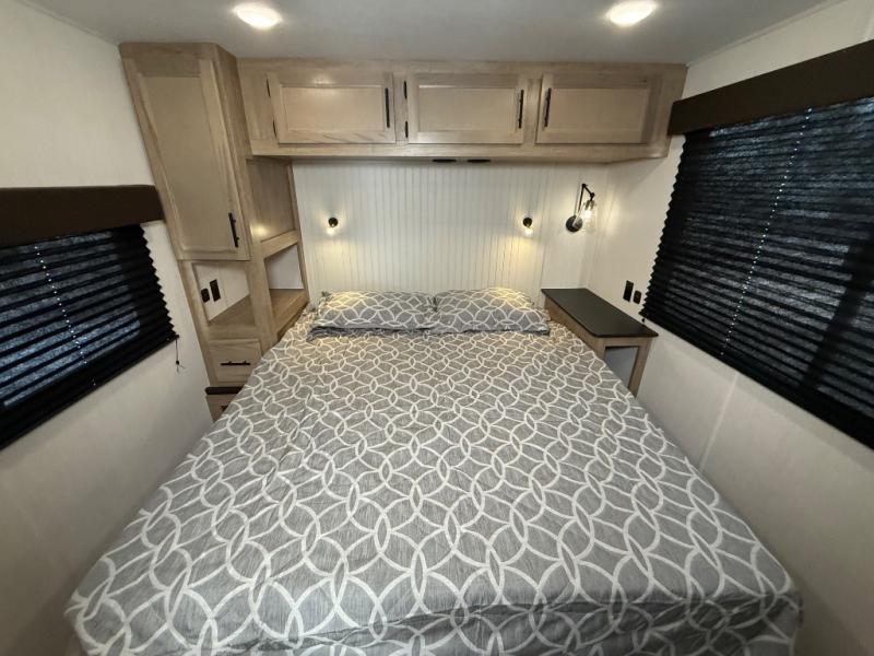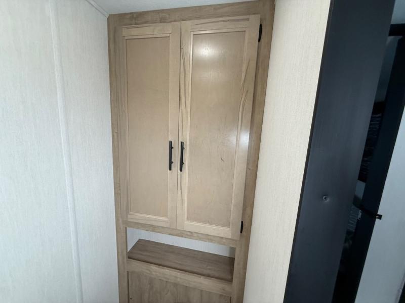 You'll feel right at home in this feature-packed destination trailer! The rear private bedroom features one of the dual entry doors, an RV king bed, and a side patio for great outdoor views! There is also a wardrobe with washer/dryer prep if you want the option to add these appliances. Above the bedroom, you'll find a loft with a queen bed, a fireplace and a storage cabinet to keep the space tidy. The chef of your group can whip up their best meals in the middle kitchen, and there is a spacious pantry to keep snacks stocked. Your crew can relax on the L-shaped sofa in the front living room, enjoy the fireplace and TV, or just take in the outdoor views provided by the huge side patio!