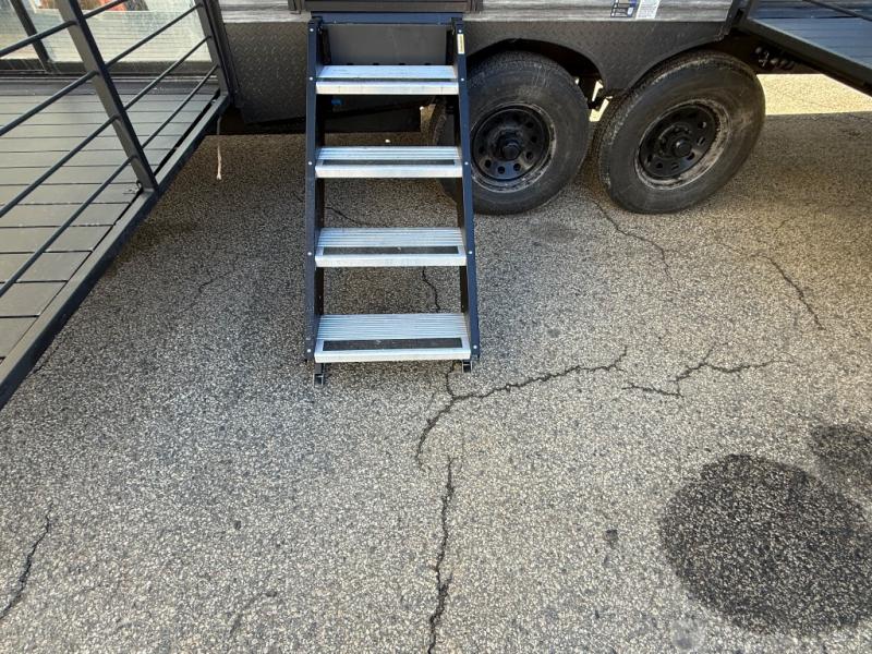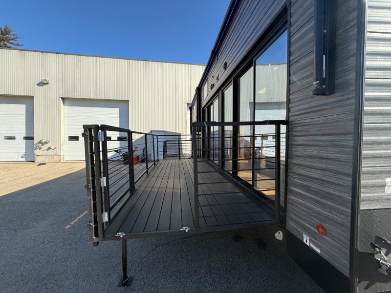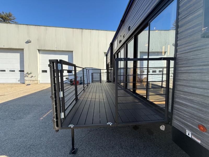 You'll feel right at home in this feature-packed destination trailer! The rear private bedroom features one of the dual entry doors, an RV king bed, and a side patio for great outdoor views! There is also a wardrobe with washer/dryer prep if you want the option to add these appliances. Above the bedroom, you'll find a loft with a queen bed, a fireplace and a storage cabinet to keep the space tidy. The chef of your group can whip up their best meals in the middle kitchen, and there is a spacious pantry to keep snacks stocked. Your crew can relax on the L-shaped sofa in the front living room, enjoy the fireplace and TV, or just take in the outdoor views provided by the huge side patio!