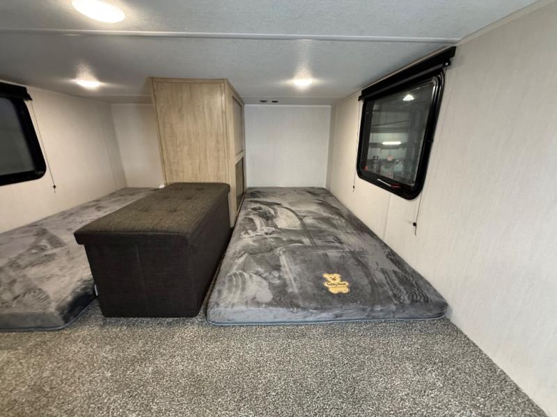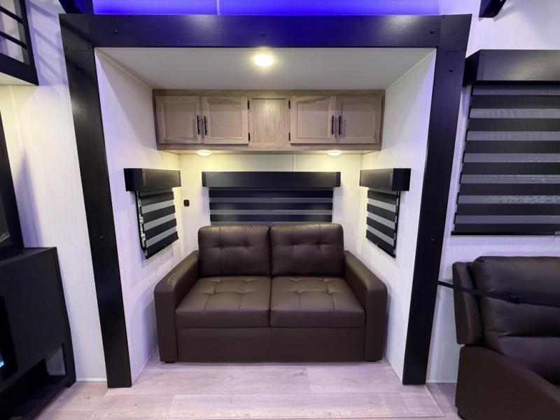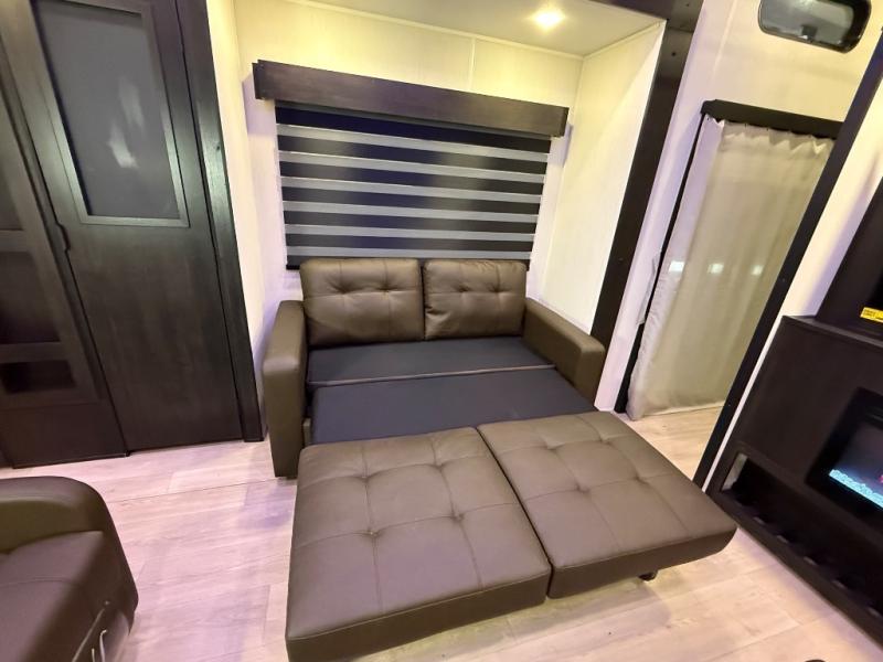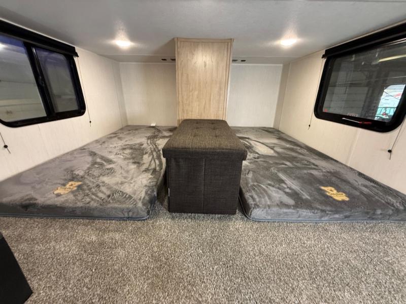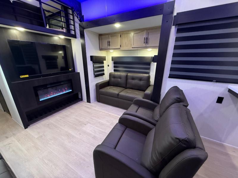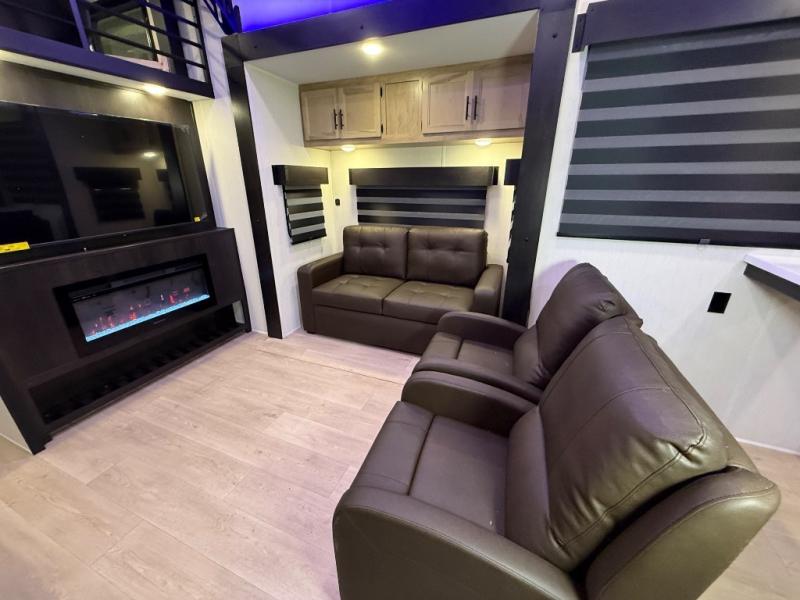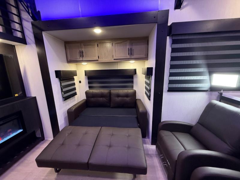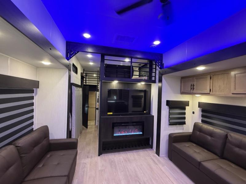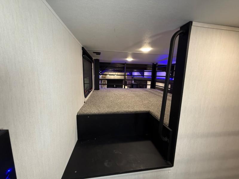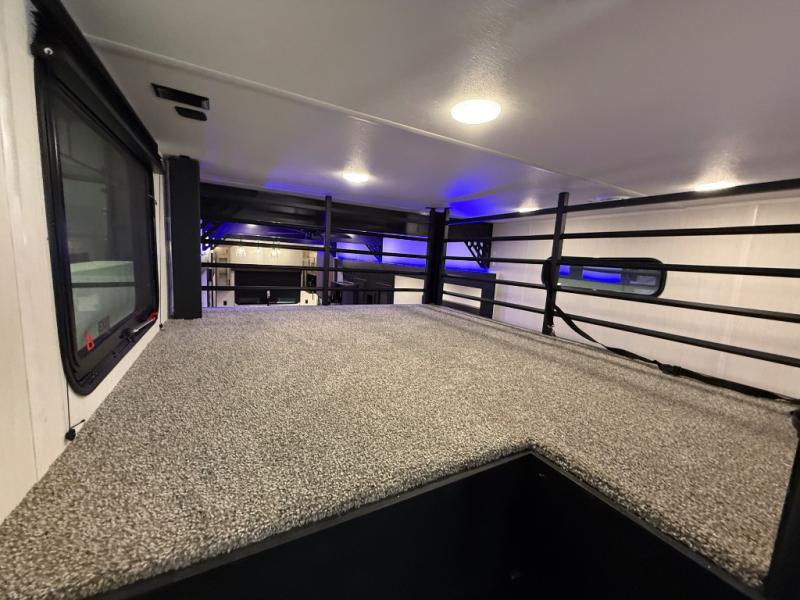 It won't be hard to find comfort in this front kitchen destination trailer! There is ample counter space to prep meals, a free-standing dinette with a slide out, plus a large pantry and 18 cu. ft. refrigerator for food storage. The bar top with stools overlooks the middle living area, where you'll also find dual hide-a-bed sofas and an entertainment center with a fireplace. The full bath includes a shower with a seat for more comfort, and one of the dual entry doors is right across from the bath so you can quickly get back outside. Head up the steps to the dual loft areas with two bunk mats and cabinets on one side, and an open area on the other, perfect for a play room or extra storage! And under the loft you'll find the rear private bedroom with a king bed slide, a wardrobe and an entertainment center, plus washer and dryer prep if you want to add these appliances!