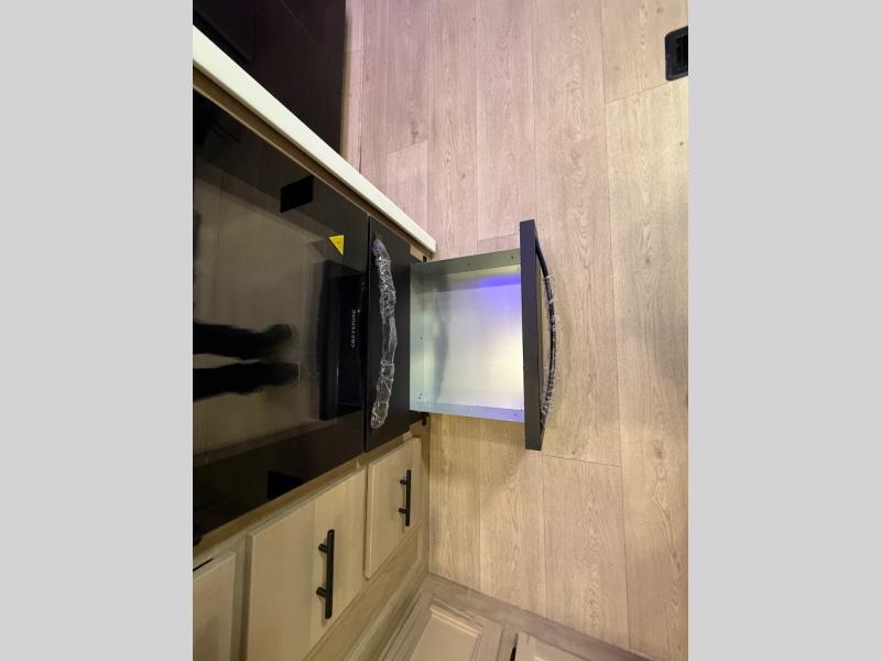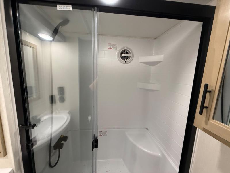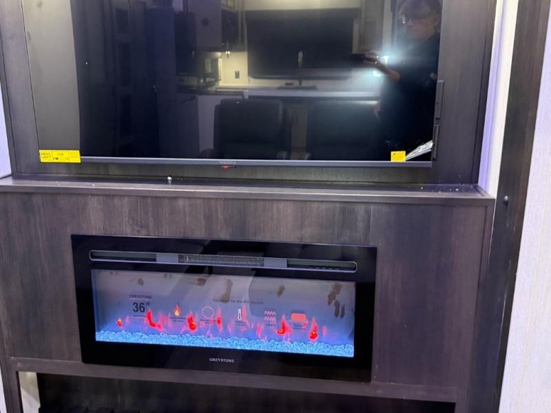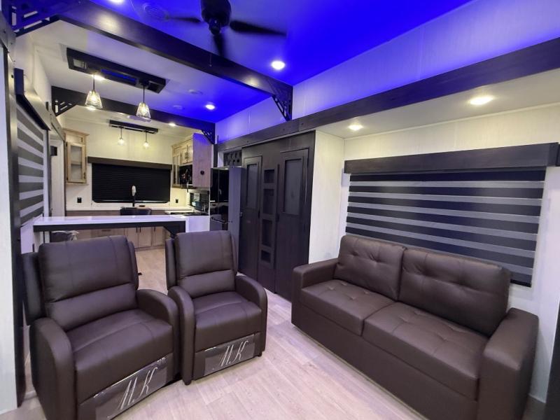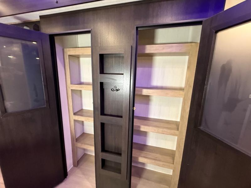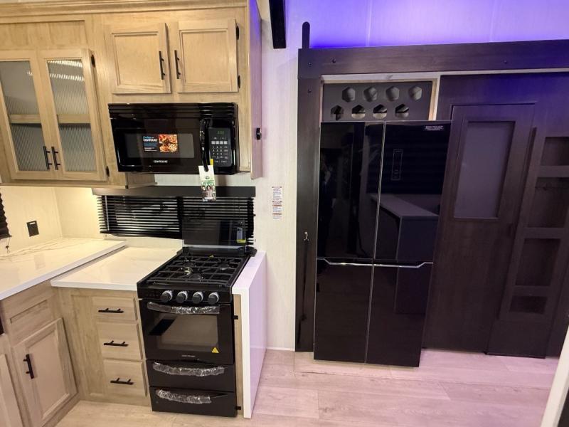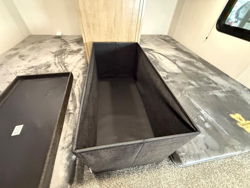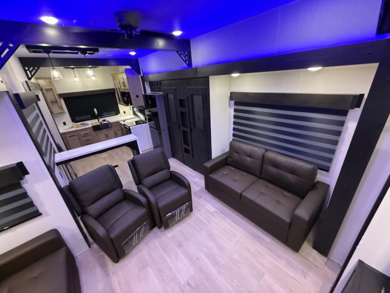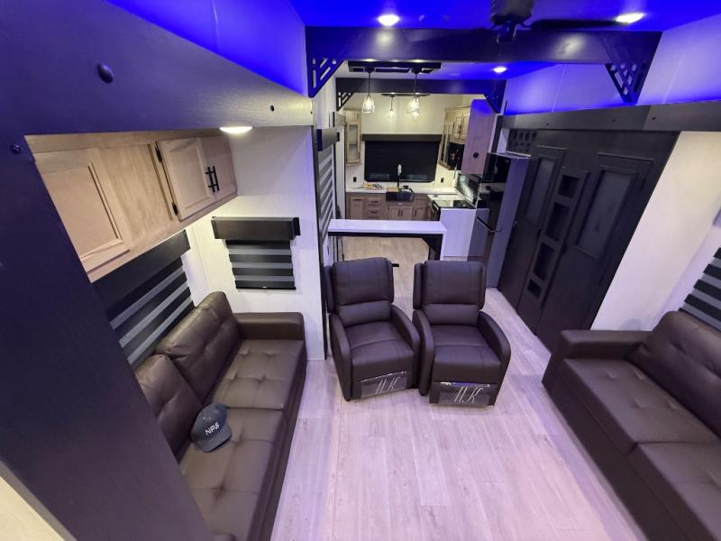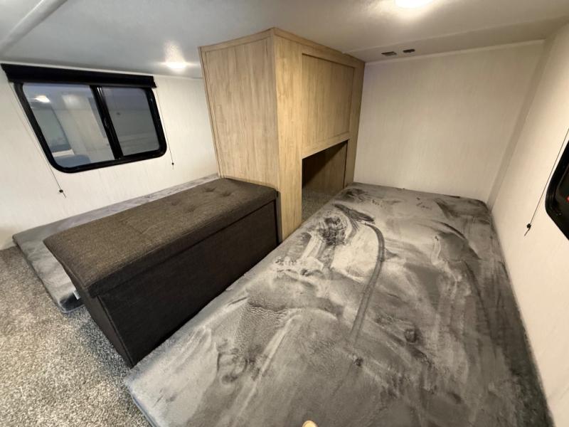 It won't be hard to find comfort in this front kitchen destination trailer! There is ample counter space to prep meals, a free-standing dinette with a slide out, plus a large pantry and 18 cu. ft. refrigerator for food storage. The bar top with stools overlooks the middle living area, where you'll also find dual hide-a-bed sofas and an entertainment center with a fireplace. The full bath includes a shower with a seat for more comfort, and one of the dual entry doors is right across from the bath so you can quickly get back outside. Head up the steps to the dual loft areas with two bunk mats and cabinets on one side, and an open area on the other, perfect for a play room or extra storage! And under the loft you'll find the rear private bedroom with a king bed slide, a wardrobe and an entertainment center, plus washer and dryer prep if you want to add these appliances!