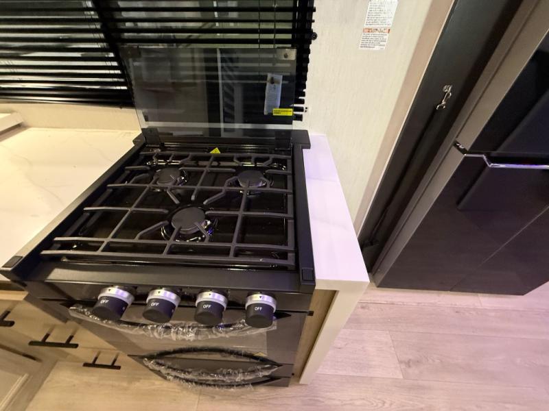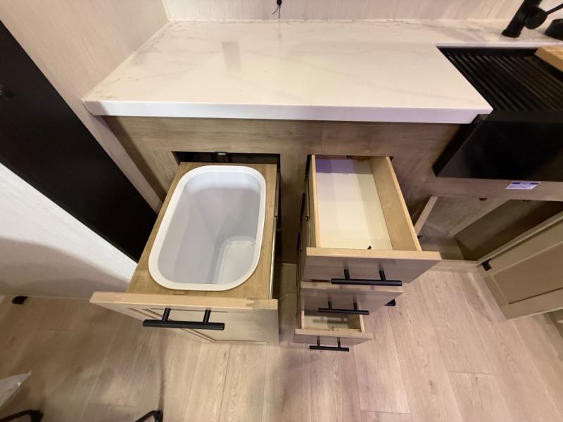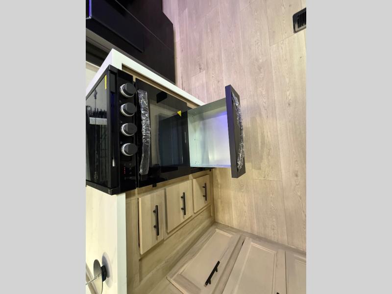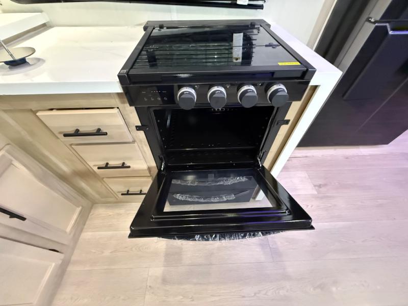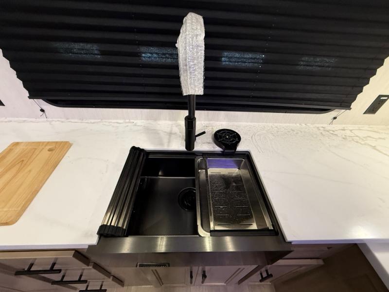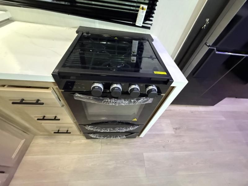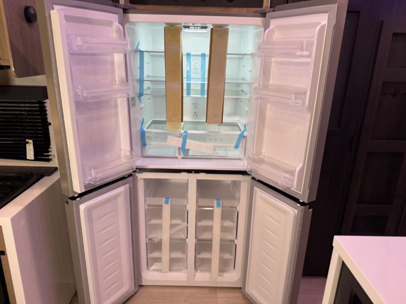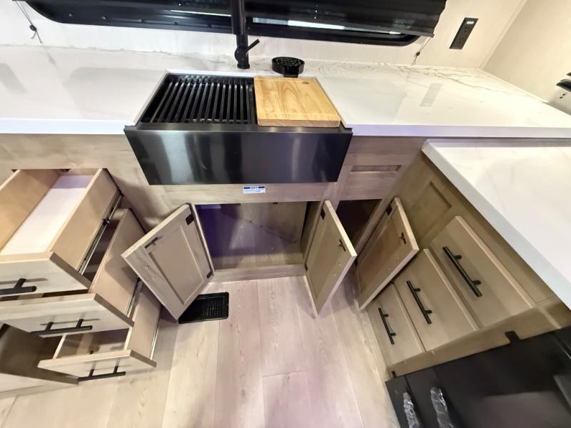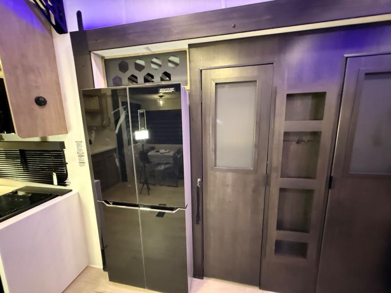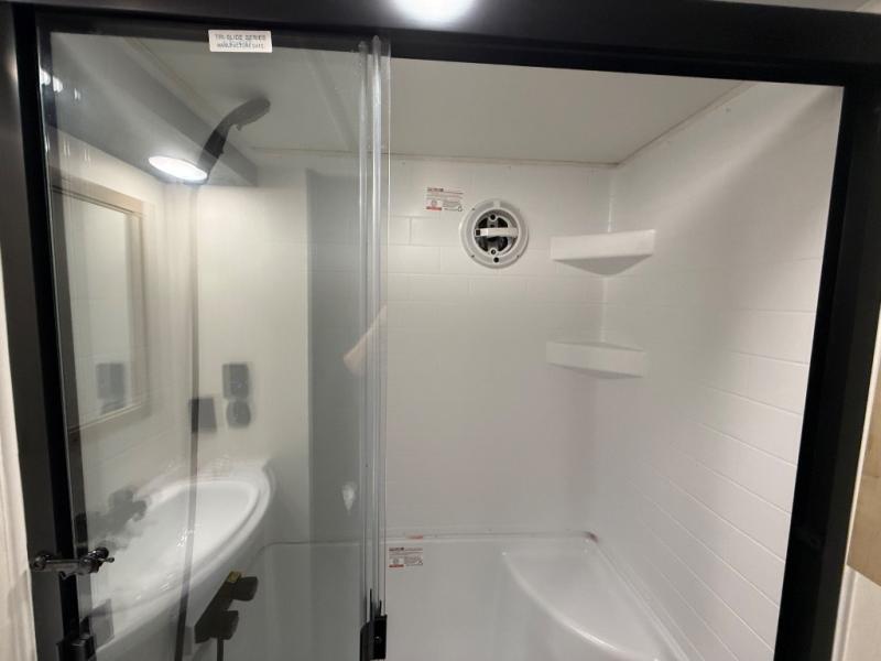It won't be hard to find comfort in this front kitchen destination trailer! There is ample counter space to prep meals, a free-standing dinette with a slide out, plus a large pantry and 18 cu. ft. refrigerator for food storage. The bar top with stools overlooks the middle living area, where you'll also find dual hide-a-bed sofas and an entertainment center with a fireplace. The full bath includes a shower with a seat for more comfort, and one of the dual entry doors is right across from the bath so you can quickly get back outside. Head up the steps to the dual loft areas with two bunk mats and cabinets on one side, and an open area on the other, perfect for a play room or extra storage! And under the loft you'll find the rear private bedroom with a king bed slide, a wardrobe and an entertainment center, plus washer and dryer prep if you want to add these appliances!