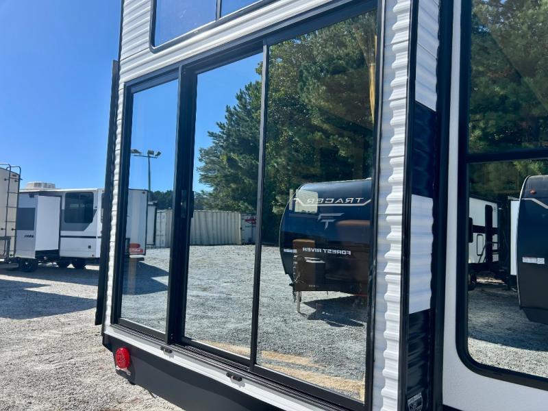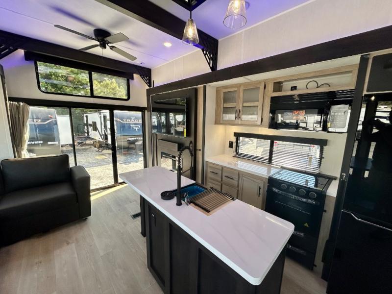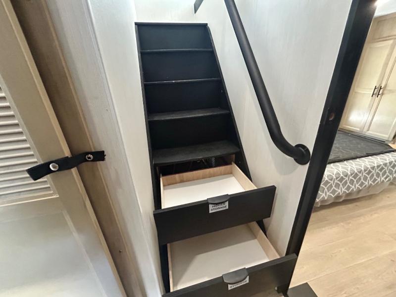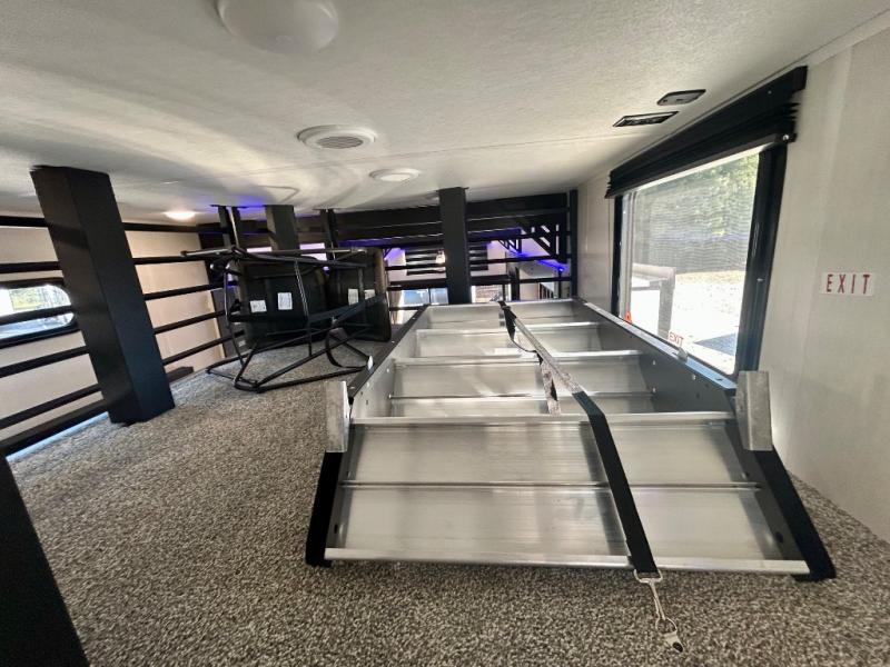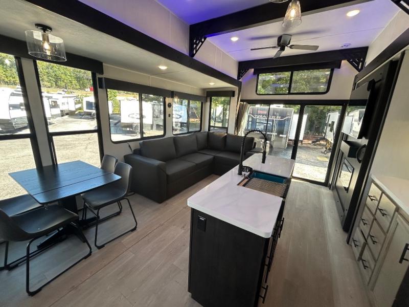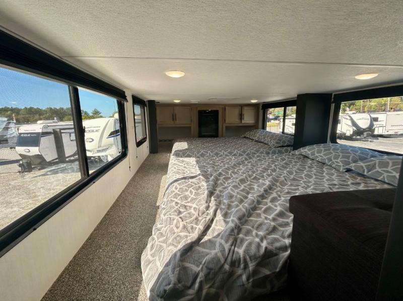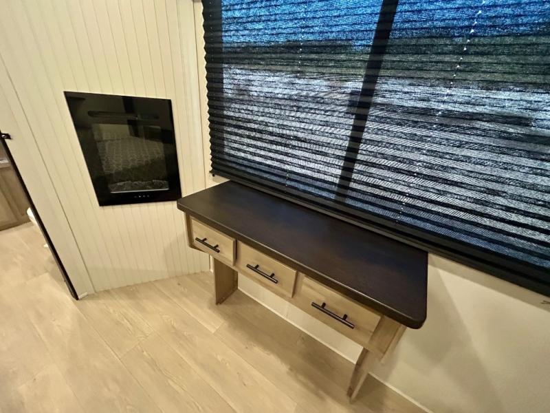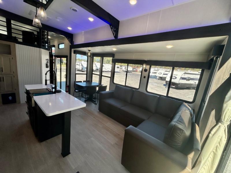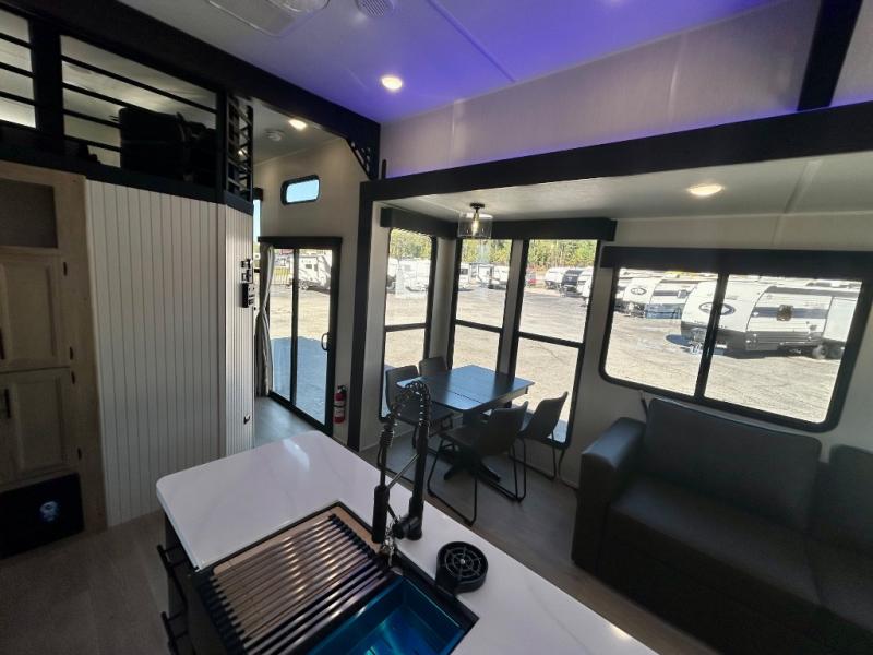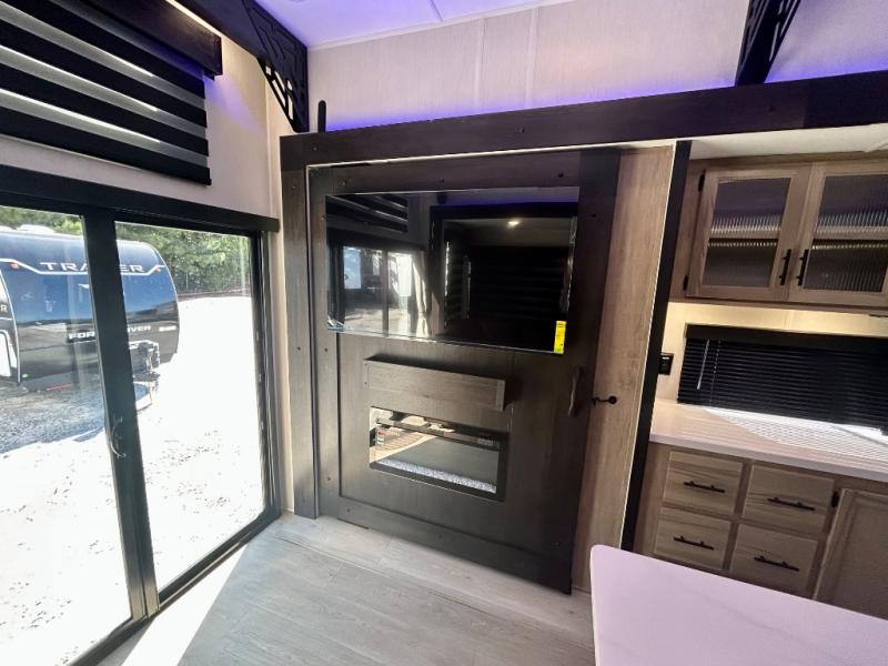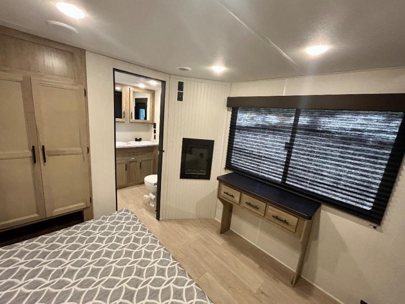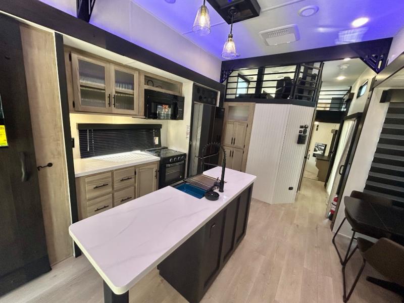 Choosing this destination trailer as your next RV won't be a hard decision! You can enter in through the front bath that includes dual bath sinks, a shower with a seat, and a medicine cabinet for your necessities. The master bedroom is connected to this bath for added convenience, and you're sure to enjoy the bedroom fireplace and king bed slide out. Just outside this room are the stairs that lead to the loft where you'll find two queen-size beds on one side and an open area where the kids can play or to use as storage. A second full bath is found next the stairs on the lower level, and there is a wardrobe with washer/dryer prep if you want to add these appliances. Everyone will love to join together and visit in the combined kitchen and living room. Here, you'll find a free-standing dinette, an L-shaped sofa, a kitchen island with two chairs, plus an entertainment center with a fireplace! The hidden pantry behind the fireplace will let you keep food stocked, and the rear patio doors will let natural light in!
