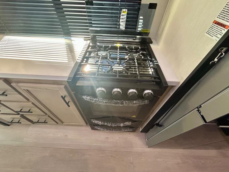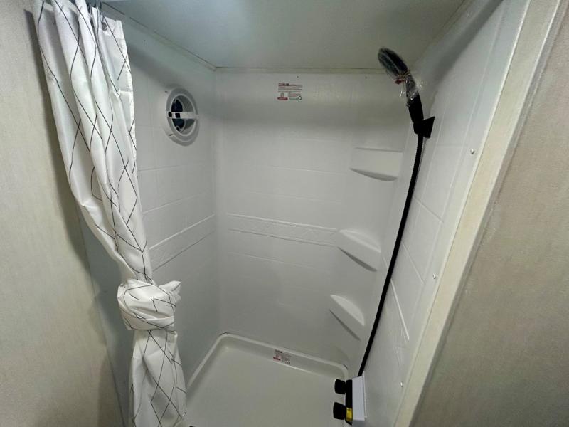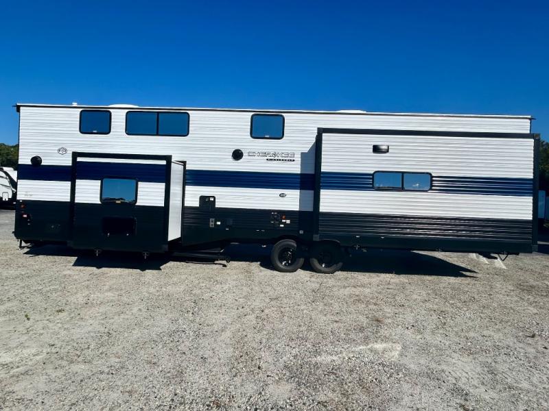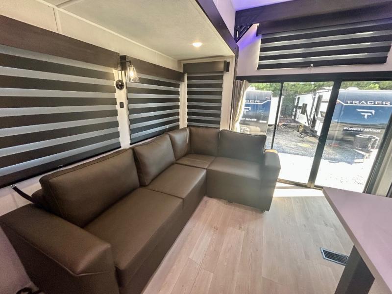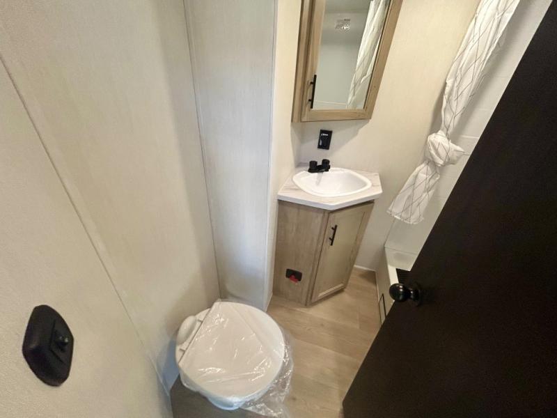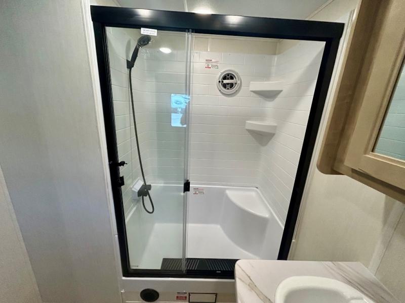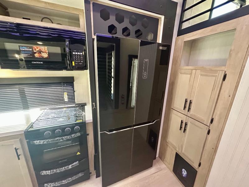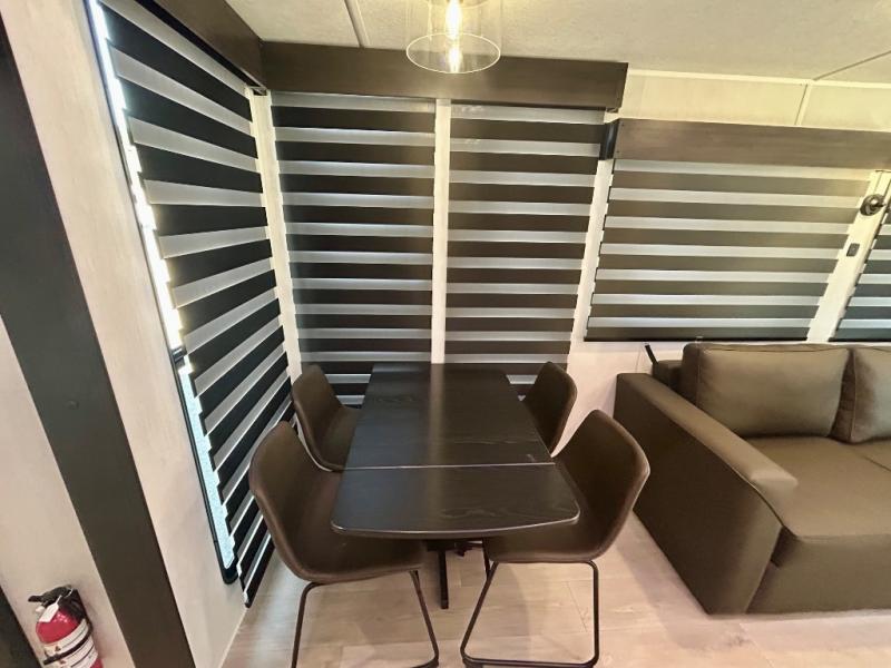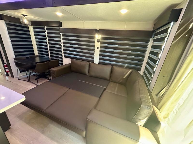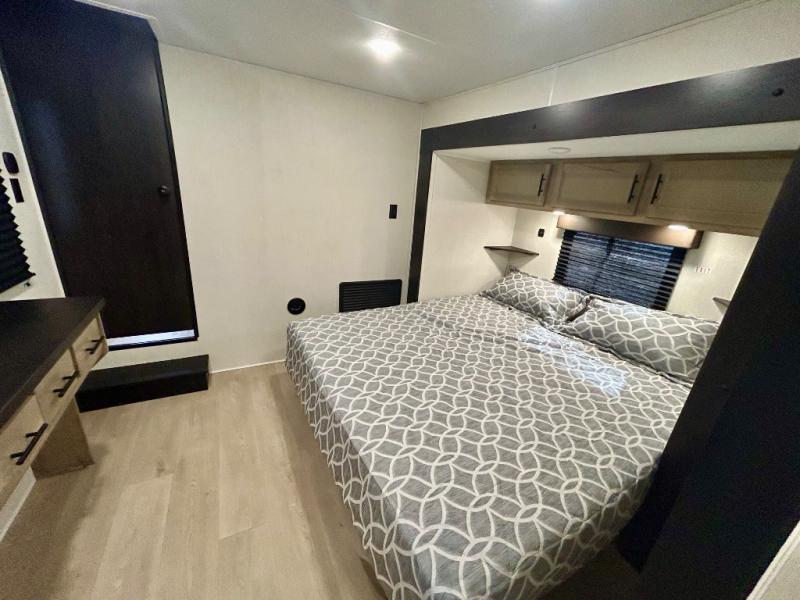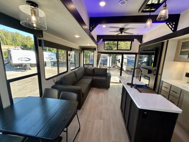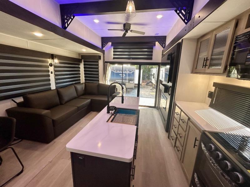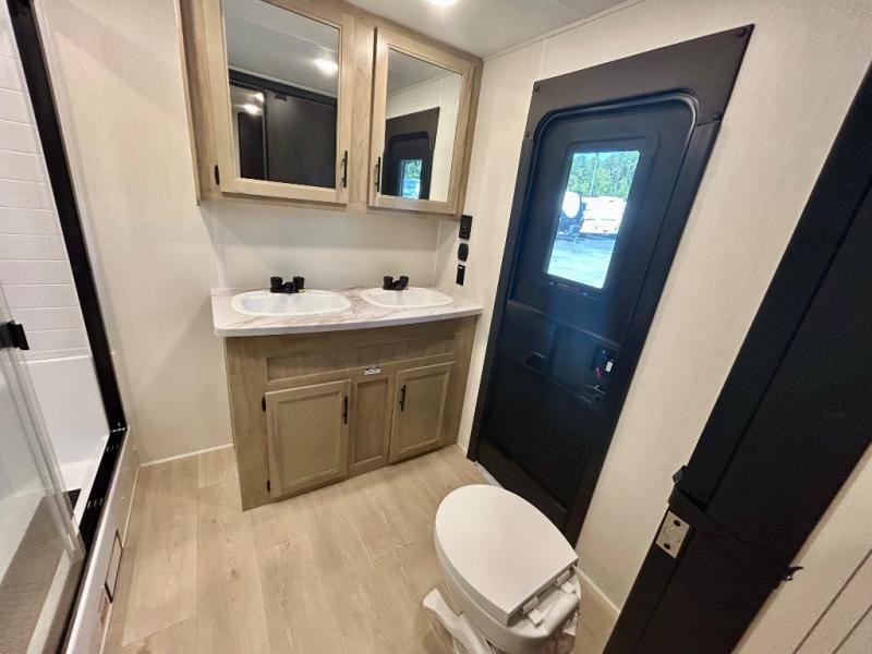 Choosing this destination trailer as your next RV won't be a hard decision! You can enter in through the front bath that includes dual bath sinks, a shower with a seat, and a medicine cabinet for your necessities. The master bedroom is connected to this bath for added convenience, and you're sure to enjoy the bedroom fireplace and king bed slide out. Just outside this room are the stairs that lead to the loft where you'll find two queen-size beds on one side and an open area where the kids can play or to use as storage. A second full bath is found next the stairs on the lower level, and there is a wardrobe with washer/dryer prep if you want to add these appliances. Everyone will love to join together and visit in the combined kitchen and living room. Here, you'll find a free-standing dinette, an L-shaped sofa, a kitchen island with two chairs, plus an entertainment center with a fireplace! The hidden pantry behind the fireplace will let you keep food stocked, and the rear patio doors will let natural light in!